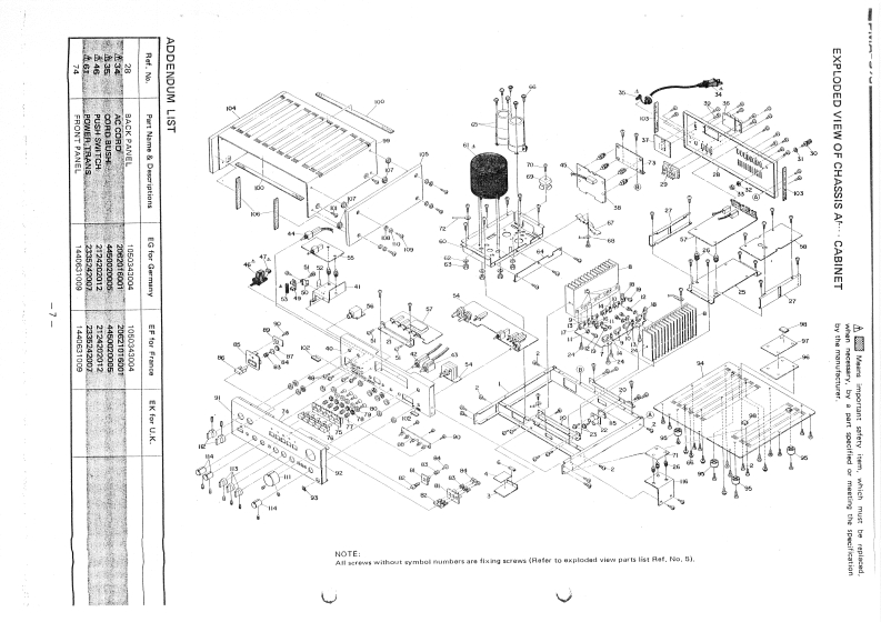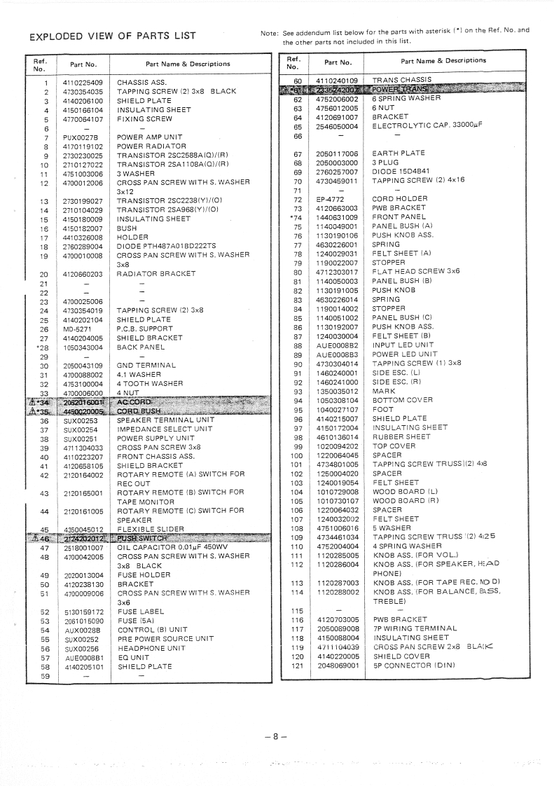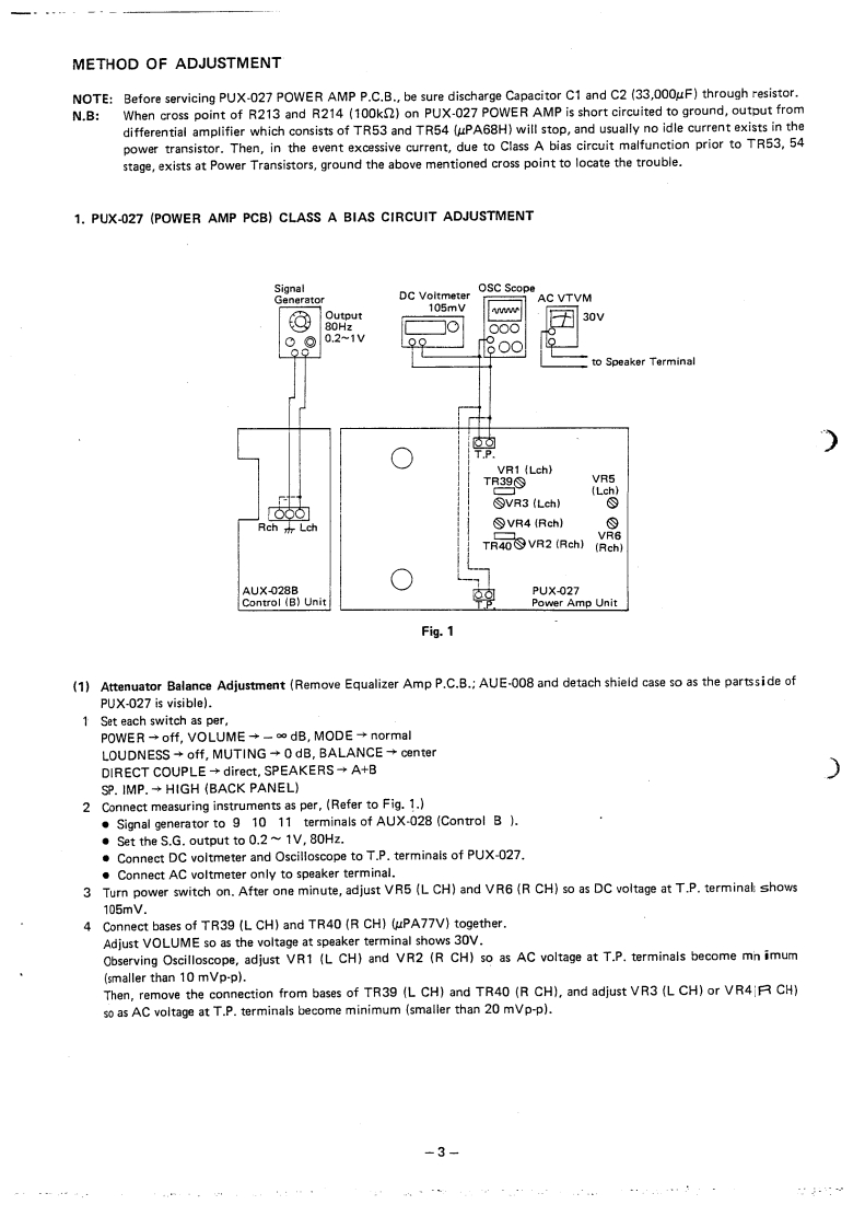 52DENONHi-Fi Component AmplifierSERVICE MANUALMODEL PMA-970每①CONTENTSSPECIFICATIONS,.,,,,..,,···...,.1BLOCK DIAGRAMMETHOD OF ADJUSTMENTS,.,·,·,·,3,4PRECATION TO USE PMA970PROTECTOR AND PRINCIPLE OF FUNCTION,,,,·,..·....,,.·.·..6EXPLODED VIEW OF CHASSIS AND CABINET7EXPLODED VIEW OF PARTS LIST。。。。。。。。。⊙PRINTED CIRCUIT BOARD PATTERNS AND PARTS LISTEQ.UNIT AUE-008B·912EQ.MUTING UNIT (SUX-025)·12POWER SUPPLY UNIT SUX-02513.14POWER AMP UNIT PUX-027B..,.,.,,,..·.·.·,.15~17EO.AMP CONDENSER UNIT.....,,..,.,,,·.···18CONTROL(B)UNIT···.19,20WIRING DIAGRAM............22,23NIPPON COLUMBIA CO..LTD57