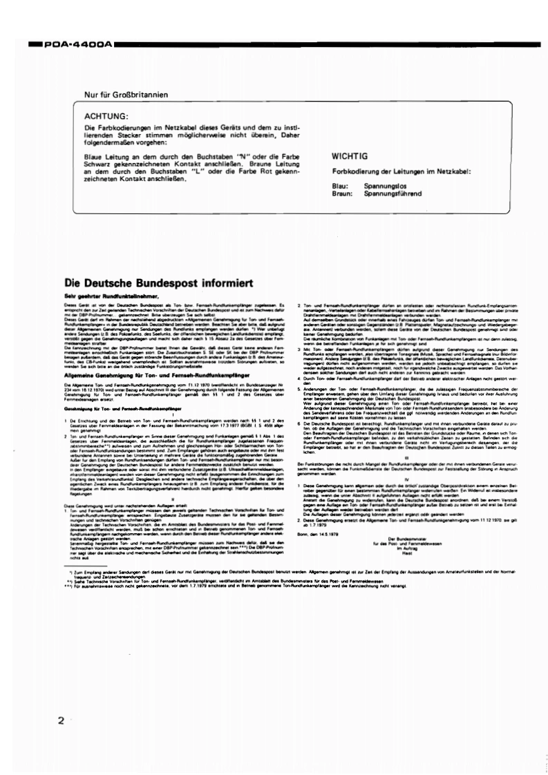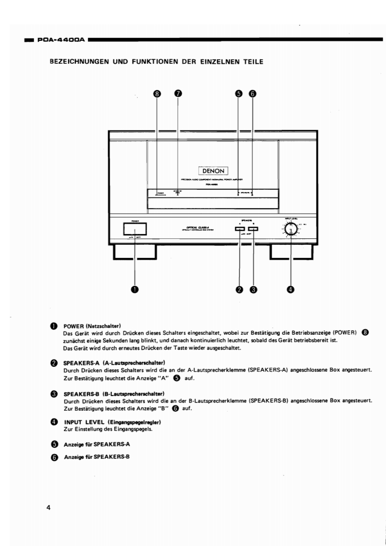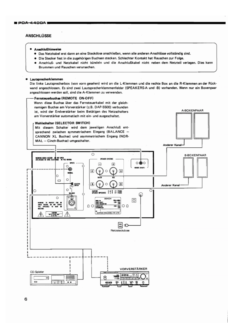 DENONHi-Fi-Mono-VerstarkerWARTUNGSANLEITUNGTYPP▣A-4A▣OAMONO-VERSTARKERDiese Wartungsanleitung basiert auf der EUROPA-Ausfuhrung.Schwarz.INHALTBEDIENUNGSANLEITUNG ...................................................2~7ZERLEGENEINSTELLUNGEN,9ST6RUNGSSUCHE ..........................................................BL0 CKSCHALTBI儿D.:HALBLEITER.............................................................12,13TEILELISTE DE PLATINE。.......,.,,,,,,,,,,,,,.,,........,,.,..,.,14,15PLATINEN,···1617LEISTUNGS BAUGRUPPE KU9152LEISTUNGS BAUGRUPPE KU9155ANSCHLUSSPLAN ....................SCHALTPLAN19EXPLOSIONZEICHNUNG VON CHASSIS UND GEHAUSE UND TELELISTE ................TEILELISTE,ANHANG,······21NIPPON COLUMBIA CO.LTD.
