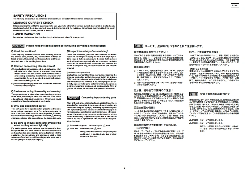 DENONVer.3Please refer to theMODIFICATION NOTICESERVICE MANUALMODELJPE3E2EKE2AE1CE1KEUTS-302DVD HOME ENTERTAINMENT SYSTEMHOME THEATER SYSTEM (S-302)consists of DVD SURROUND RECEIVER(ADV-S302),SUB WOOFER(DSW-S302)and SPEAKER SYSTEM(SC-S302)注意圹一七又在茄乙存前忙、乙)圹一七又又二1了儿在必寸方蔬以<龙古。本機志、火災、感電、付存ビ亿对寸石安全性卷確保寸石上忙、志夫芯未存配康态茄乙本一乙茄)、未左法的体「電氨用品安全法」屯上老、所定)許可在得(製造志九(訪)夫寸。従)乙圹一七又苍茄乙存際体、乙九5)安全性雜持志九石太、乙)片一上又マ二ュ了忙記載九(U石注意事項在必寸书守)〈龙过。For purposes of improvement,specifications and·本機)仕横:性能改良)左协、予告在〈变更寸石乙匕design are subject to change without notice.扬)来寸。·補修用性能部品)保有期間:、製造打切後8年C寸。Please use this service manual with referring to the·修理)際:、必寸取极锐明苦卷参照)上、作業左行一operating instructions without fail.(〈龙t。Some illustrations using in this service manual are·本文中忙使用L(石亻与又卜休、脱明)都合上現物slightly different from the actual set.匕多少異在局場合分击)ま寸。DENONTOKYO,JAPANDenon Brand Company,D&M Holdings Inc.X0335V.03DE/CDM0801