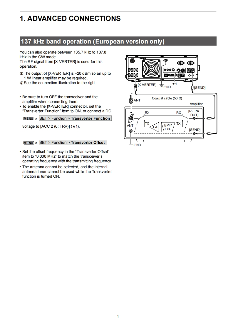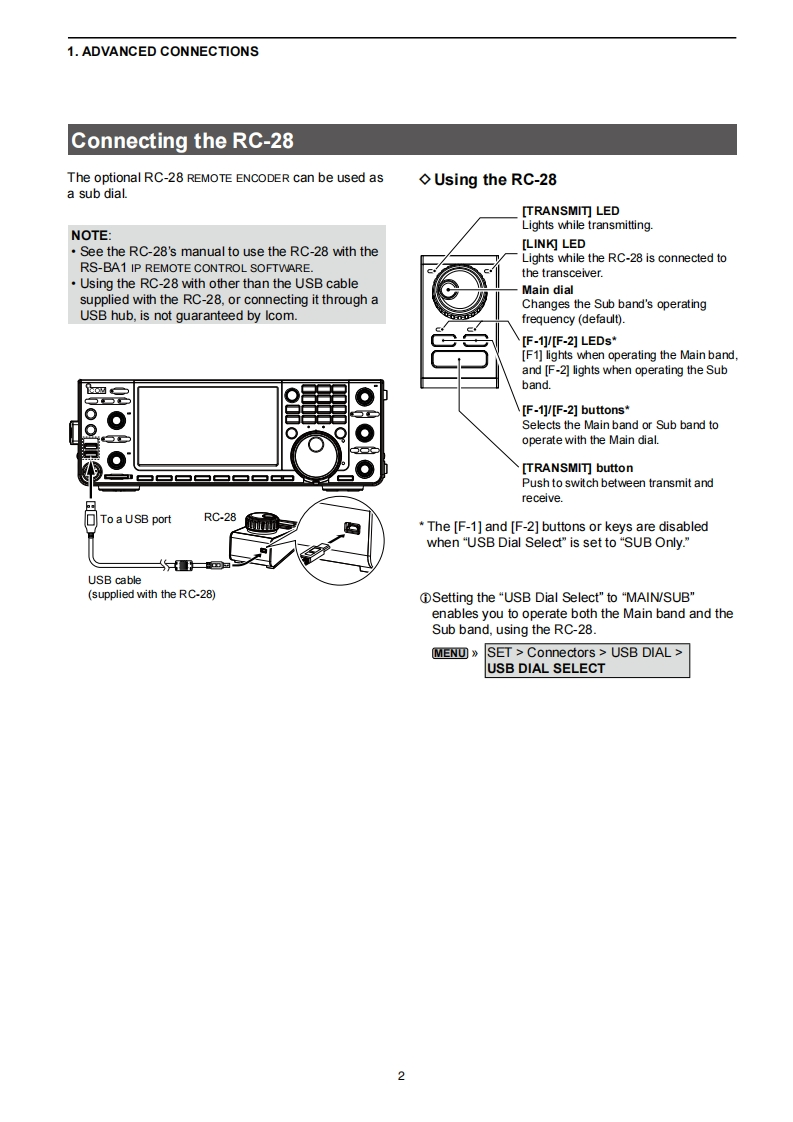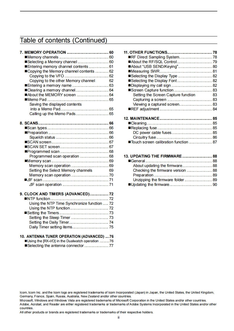 iCOMADVANCED MANUALINTRODUCTION1 ADVANCED CONNECTIONS2 ADVANCED OPERATIONS3 ADVANCED SCOPE OPERATION4 VOICE RECORDER FUNCTIONSHF/50 MHz TRANSCEIVER5 VOICE TX MEMORY OPERATION1C-76106 SD CARD/USB FLASH DRIVE (ADVANCED)7 MEMORY OPERATION8 SCANS9 CLOCK AND TIMERS (ADVANCED)10 ANTENNA TUNER OPERATION (ADVANCED)11 OTHER FUNCTIONS12 MAINTENANCE(ADVANCED)13 UPDATING THE FIRMWAREINDEXInstructions for advanced operations and additionaldetails are described in this manual.See the Basic manual for the basic operations,especially for new users.Icom Inc.