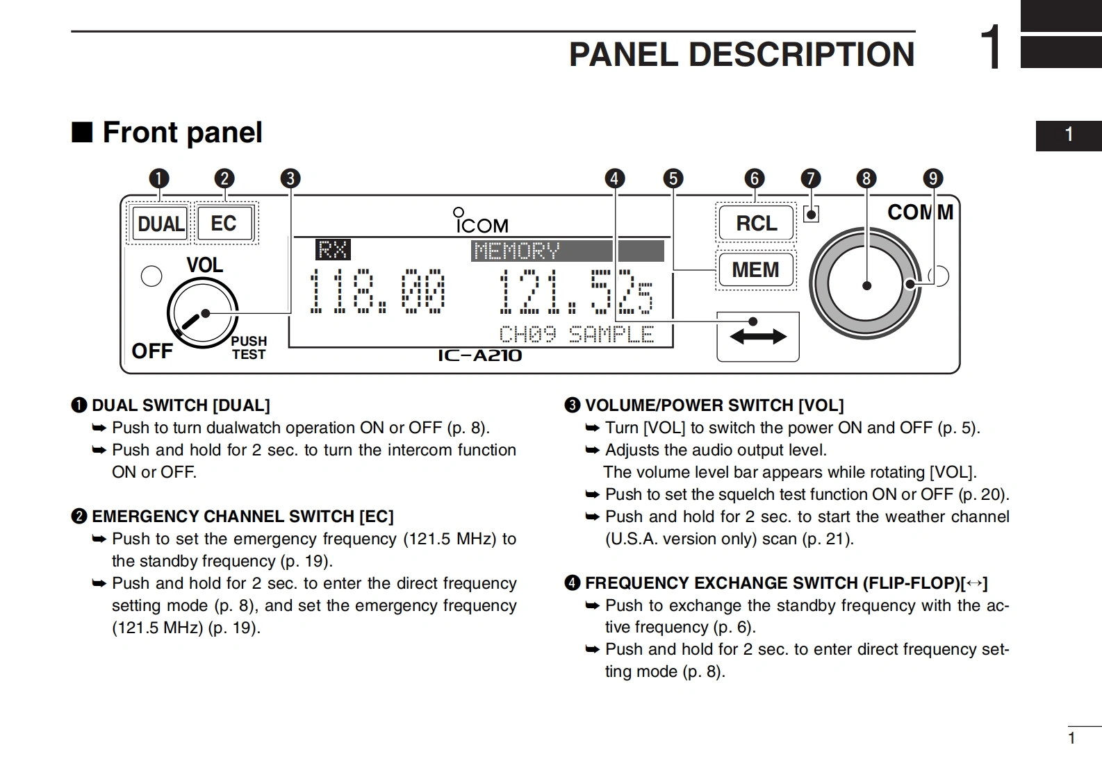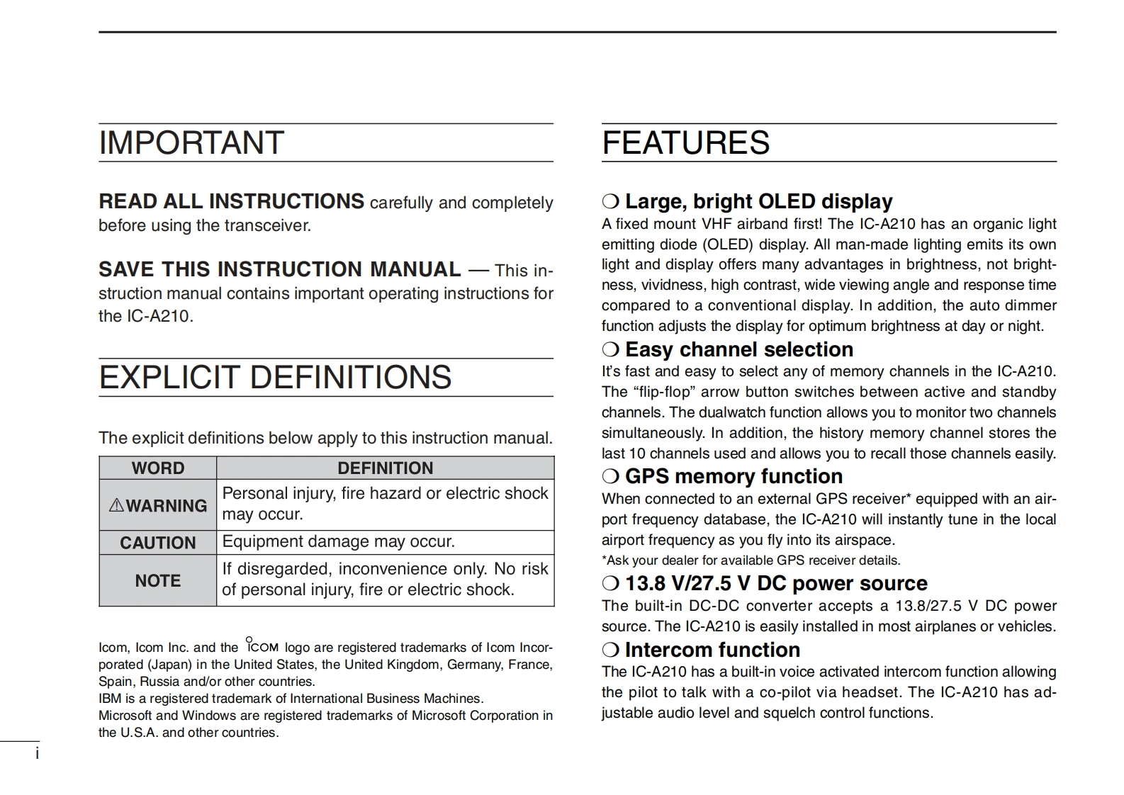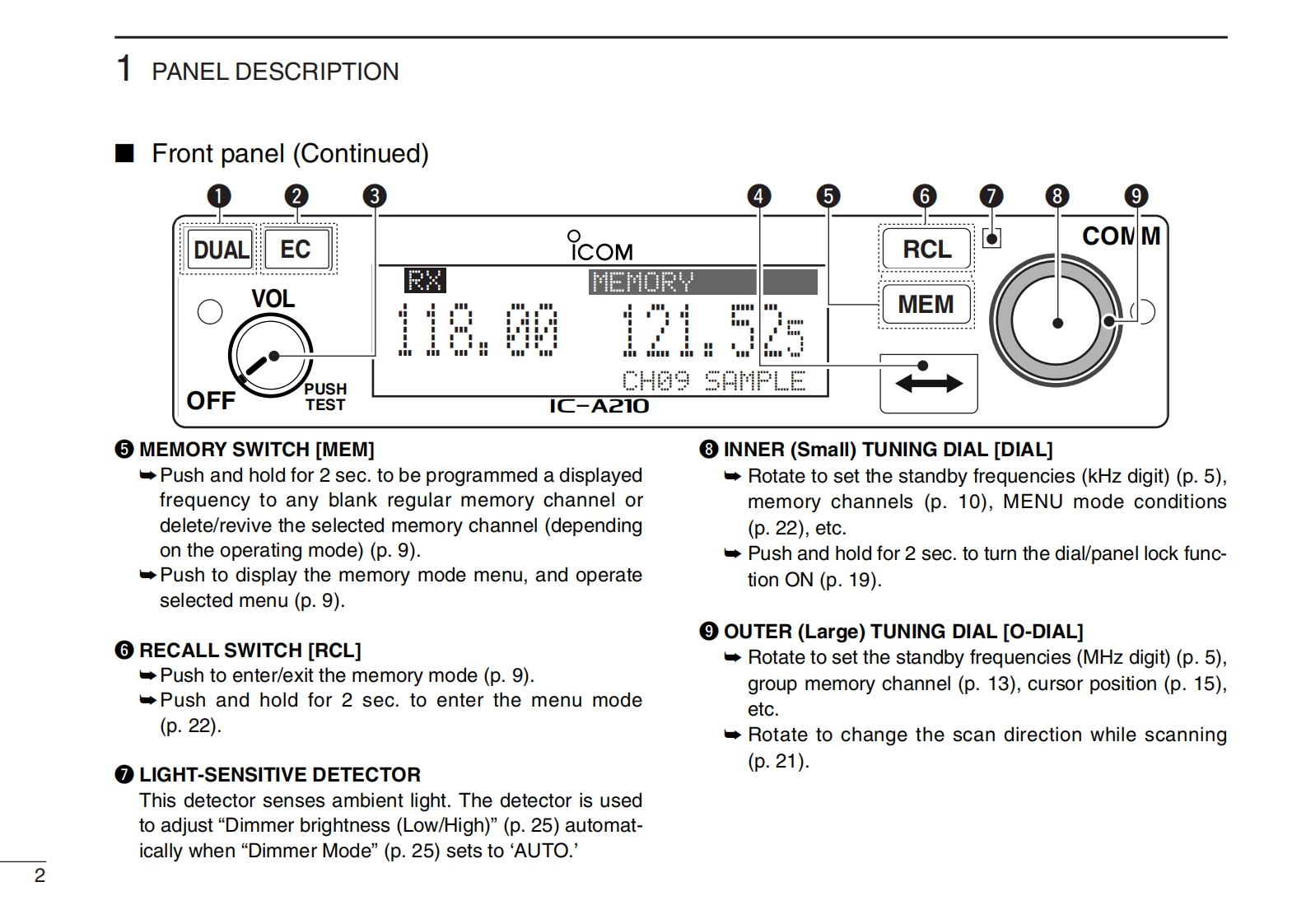 INSTRUCTION MANUALDUAL ECCOMRCLCOMMVOL留VHF AIR BAND TRANSCEIVER118.00136.975MEMIC-A210OFF器1C-A210This device complies with Part 15 of the FCCRules.Operation is subject to the condition that thisdevice does not cause harmful interference.Icom Inc.