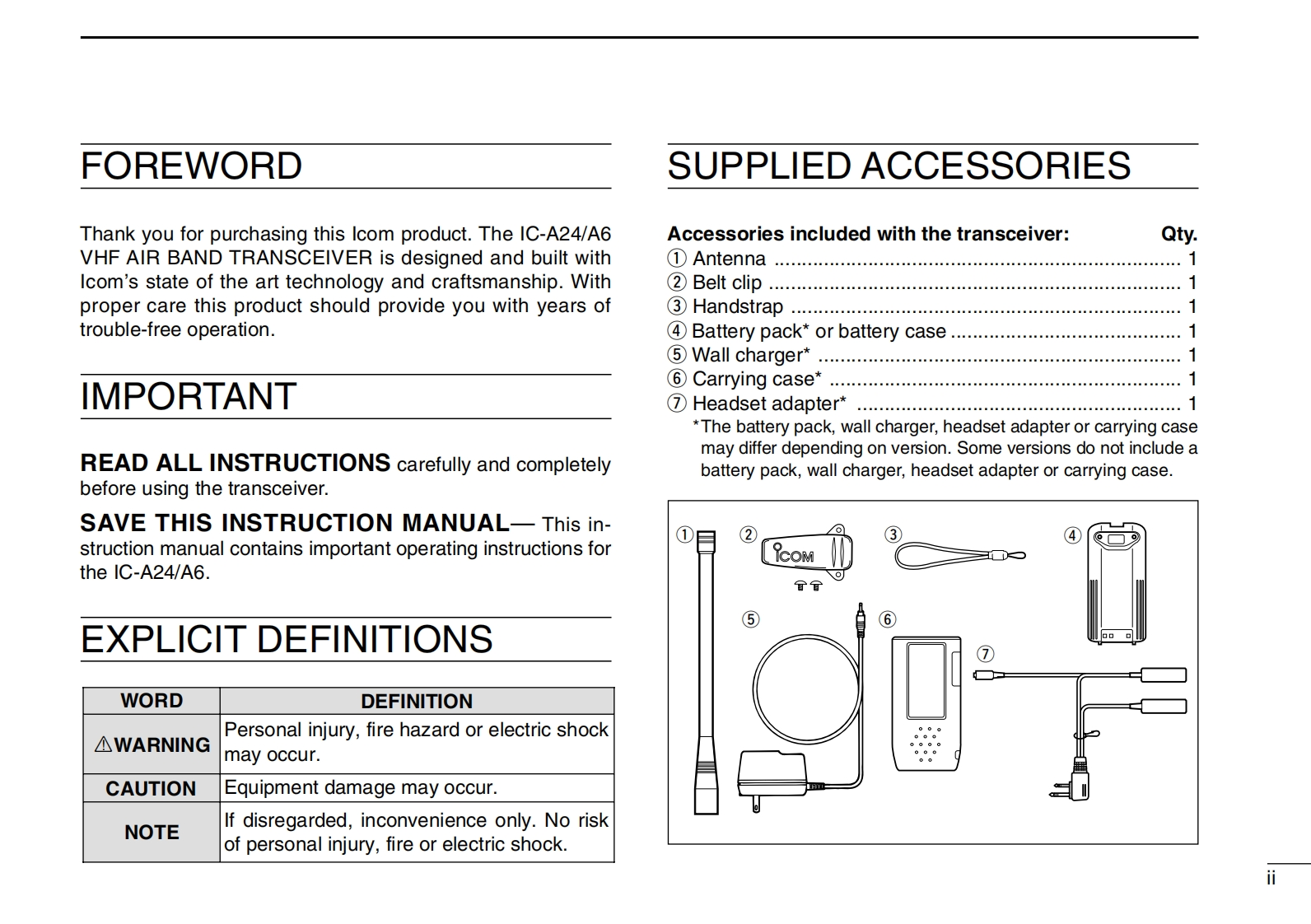 COMINSTRUCTION MANUALVHF AIR BAND TRANSCEIVERIEA居4COMIC-824[-6-99M99This device complies with Part 15 of the FCCRules.Operation is subject to the conditionthat this device does not cause harmful inter-ference.Icom Inc.IC-A24IC-A6