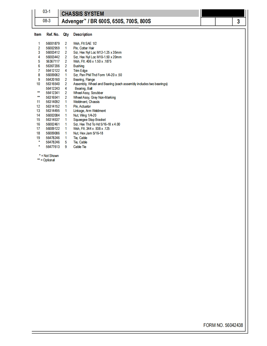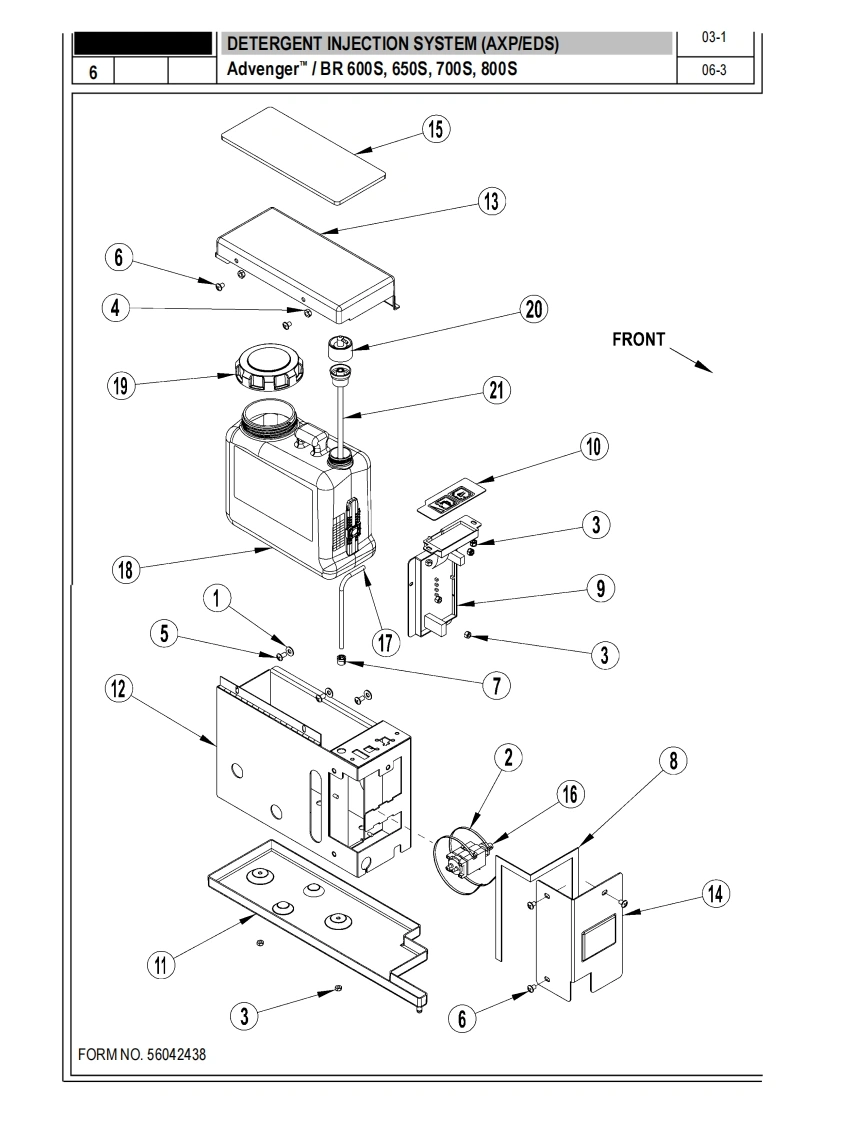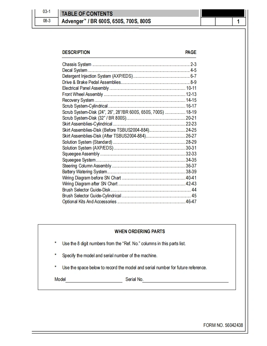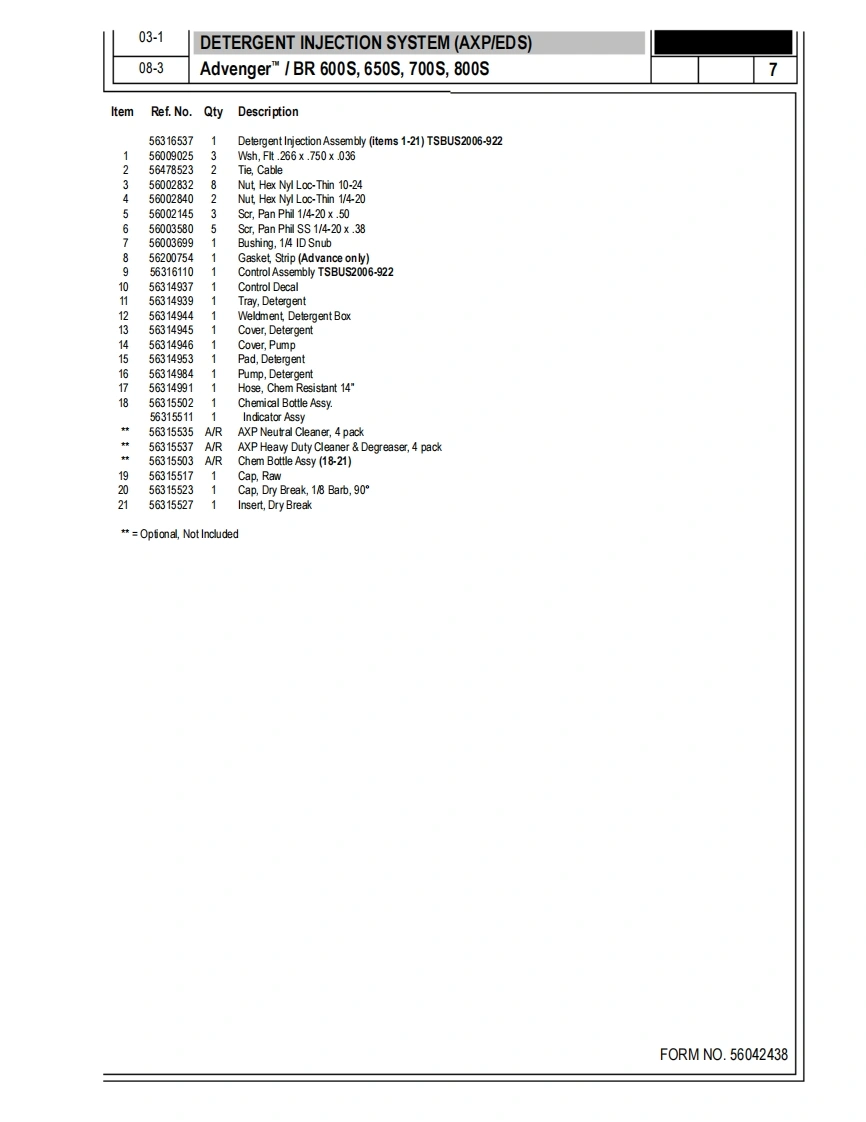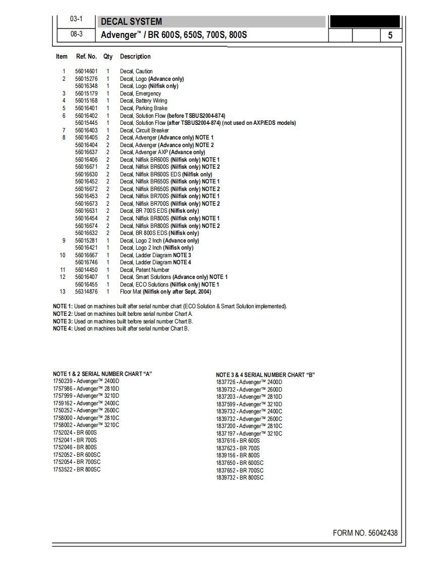 AdvengerM,AdvengerTM AXPBR600S,650S,700S,800SPARTS LISTAdvance M0DELS56314000(2400D,56314001(2600D),56314002(2810D),56314003(3210D),56314004(2400C),56314005(2600C),56314006(2810C),56314007(3210C,56314791(2600D-AXP),56314994(2810C-AXP),56314992(2810D-AXP),56314995(3210C-AXP),56314993(3210D-AXP)Nilfisk M0DELS56314010(600s),56314011(650s)(ob5.,56314012(700S,56314013(800S),56314014(600SC),56314015(650sC)(ob5.,56314016(700sC),56314017(800SC),56316517(600SEDS),56316518(600 SC EDS),56314998(700 SC EDS,56314996(700SEDs,56314999(800 SC EDS),56314997(800SEDS)NilfiskAdvancesetting standards1/03 revised9/08F0RMN0.56042438