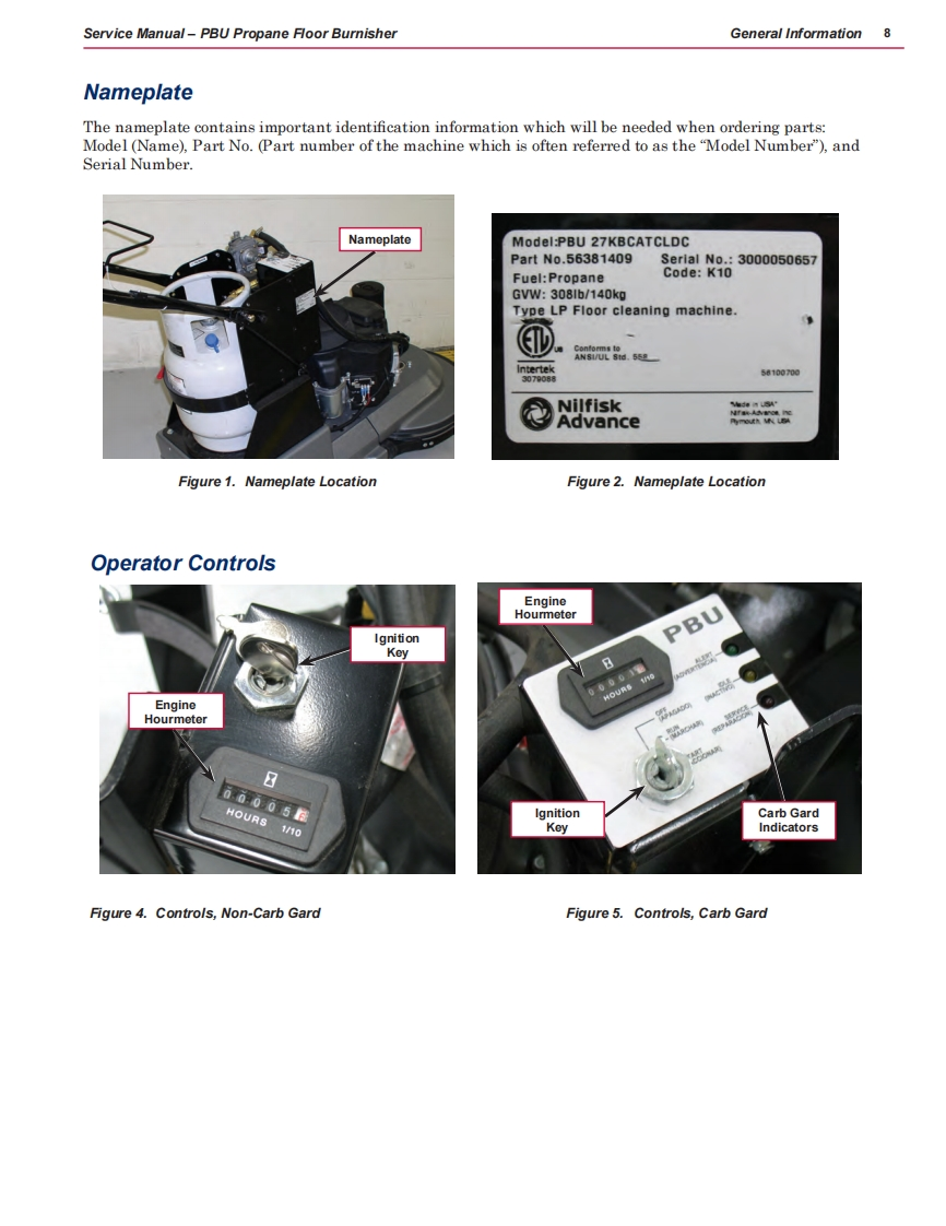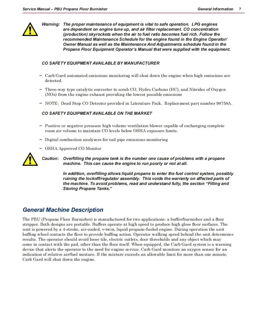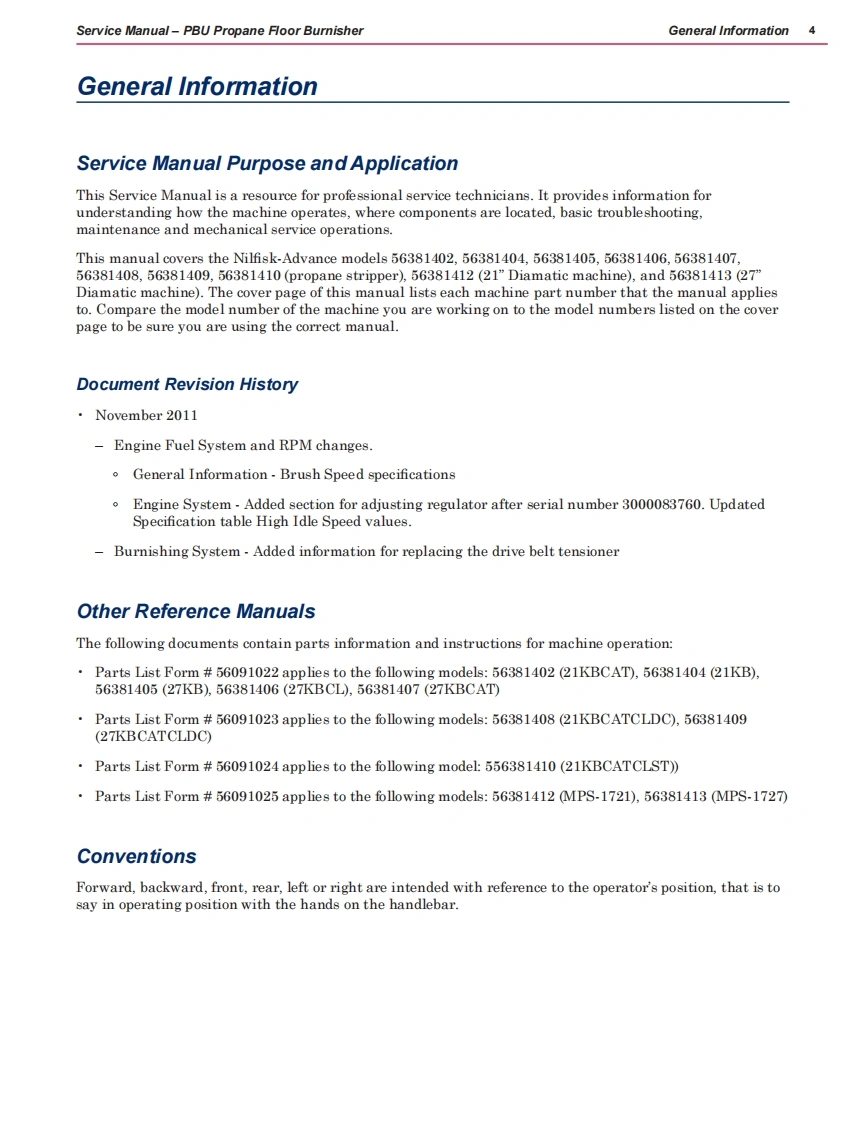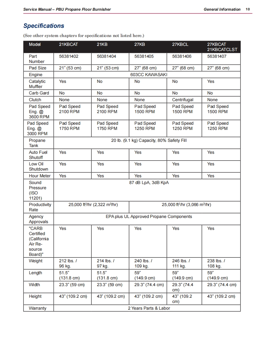 PBU Propane Floor Burnisher21KB21KBCAT21KBCATCLST21KBCATCL27KB27KBCL27KBCAT21KBCATCLFC-MPS-172127KBCATCLDCMPS-1727Service ManualNilfisk-Advance“PBU"Machines:56381402,56381404,56381405,56381406,56381407,56381408(Dust control unit),56381409(Dust control unit),56381454Nilfisk-Advance "Propane Stripper"Machine:56381410Diamatic Machines:56381412,56381413NilfiskAdvanceEnglish03/11 Revised 07/12 Form No.56043153