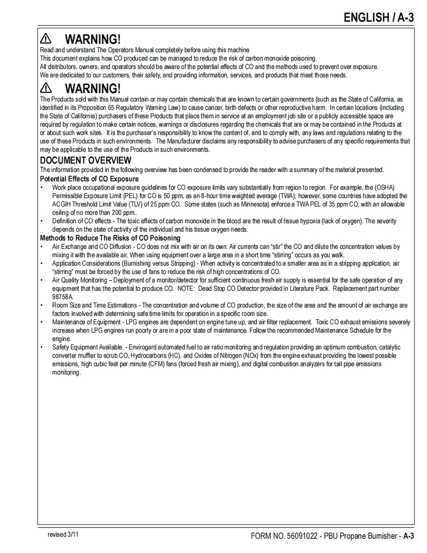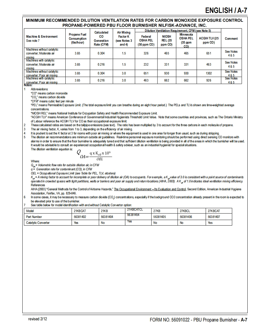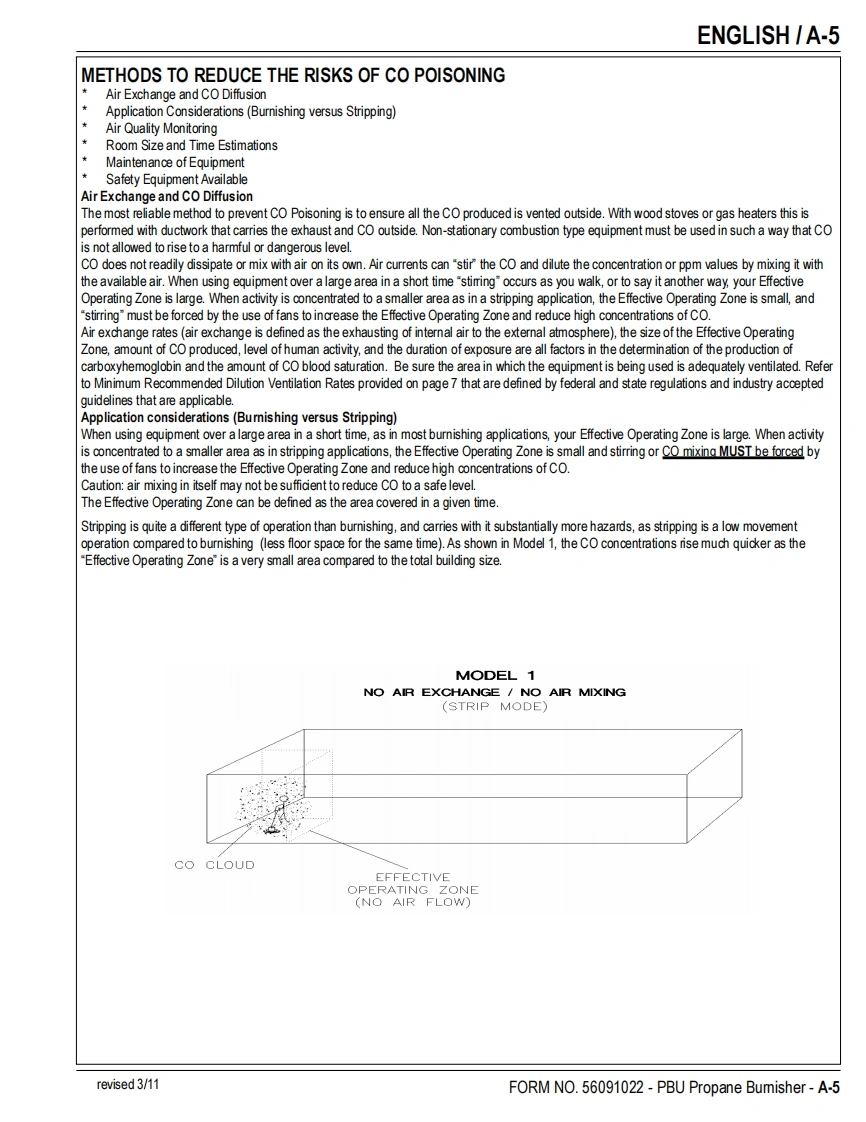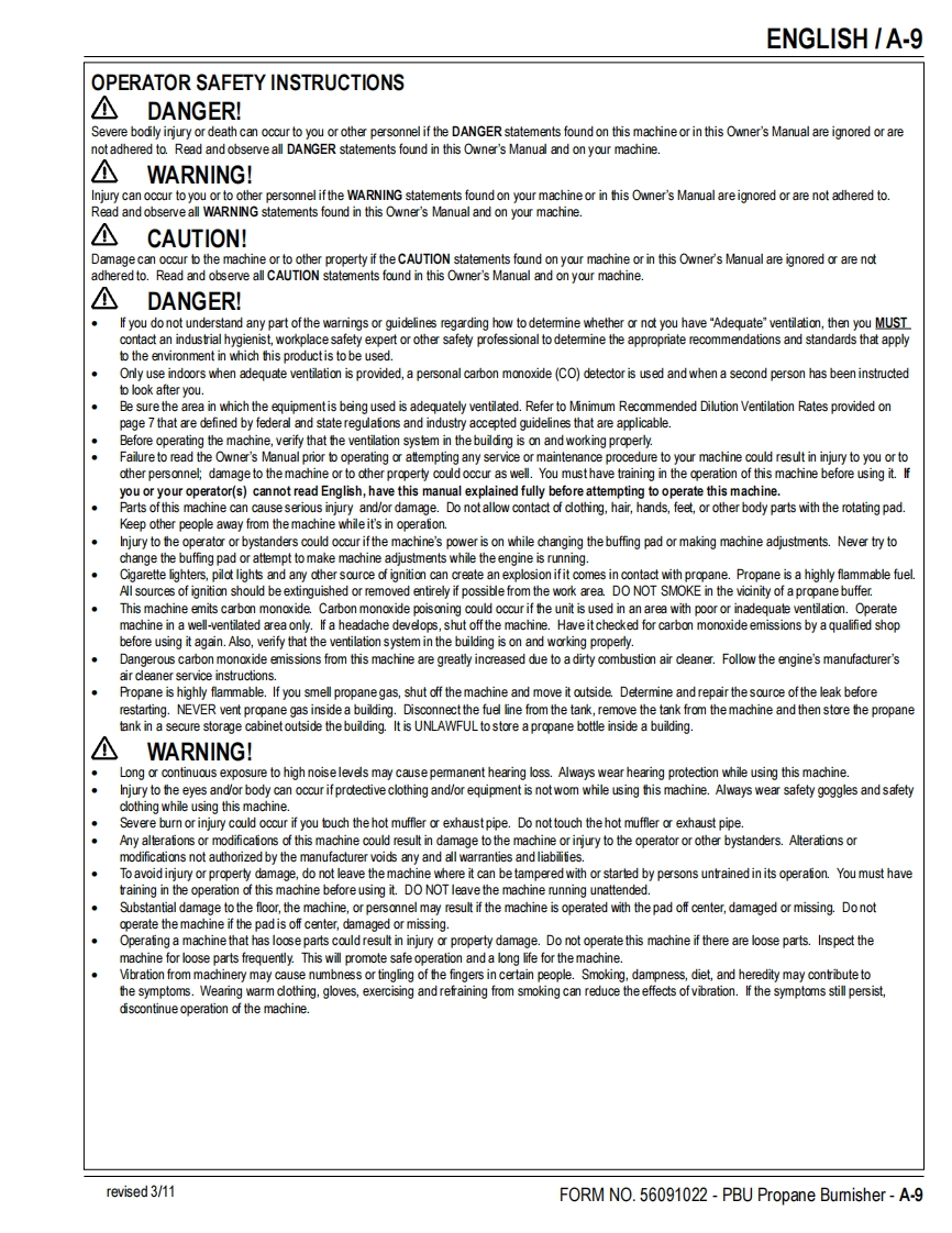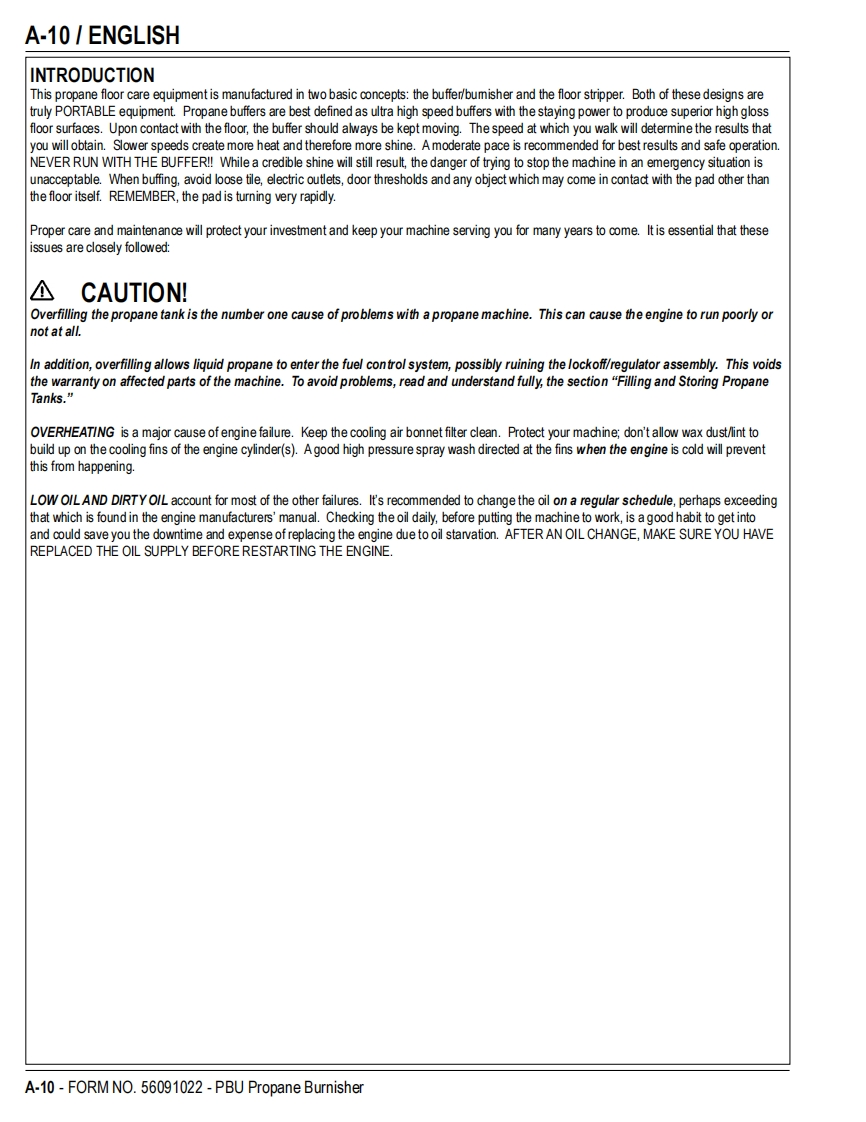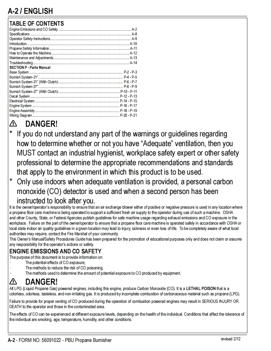 PBUPropaneFloor BurnisherEquipmentOperator's Manual Manuel d'utilisation Libro de InstruccionesModels:56381402(21 KBCAT),56381404(21KB),56381454(21 KBCATCL)56381405(27KB),56381406(27KBCL,56381407(27 KBCAT)READ THIS BOOKENEnglish(A-2-A-14)LEA ESTE MANUALESEspanol (B-2-B-14)LISEZ CE MANUELFRFrancais(C-2-C-14)This book has important information for the use and safe operation of this machine.Failure to read thisbook prior to operating or attempting any service or maintenance procedure to your machine couldresult in injury to you or to other personnel;damage to the machine or to other property could occur aswell.You must have training in the operation of this machine before using it.If your operator(s)cannotread this manual,have it explained fully before attempting to operate this machine.All directions given in this book are as seen from the operator's position at the rear of the machine.11/10 revised 6/12 FORM NO.56091022
