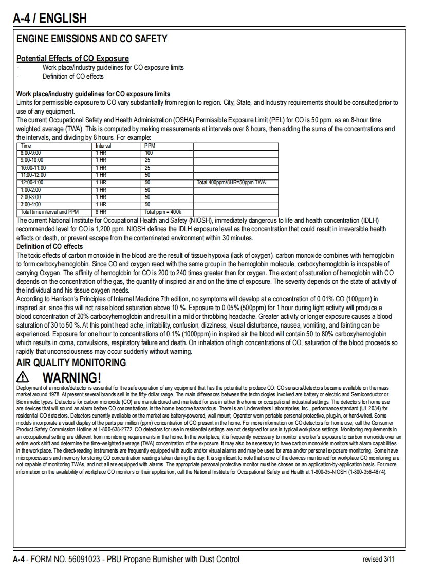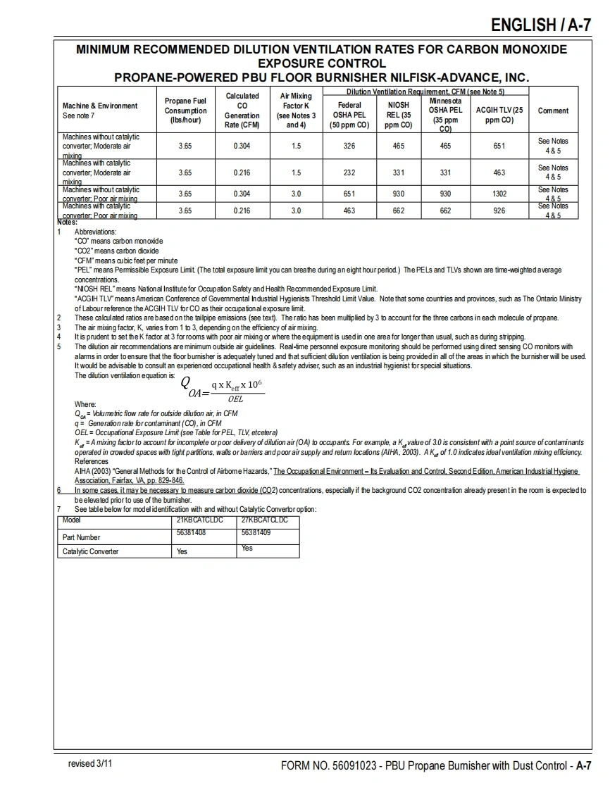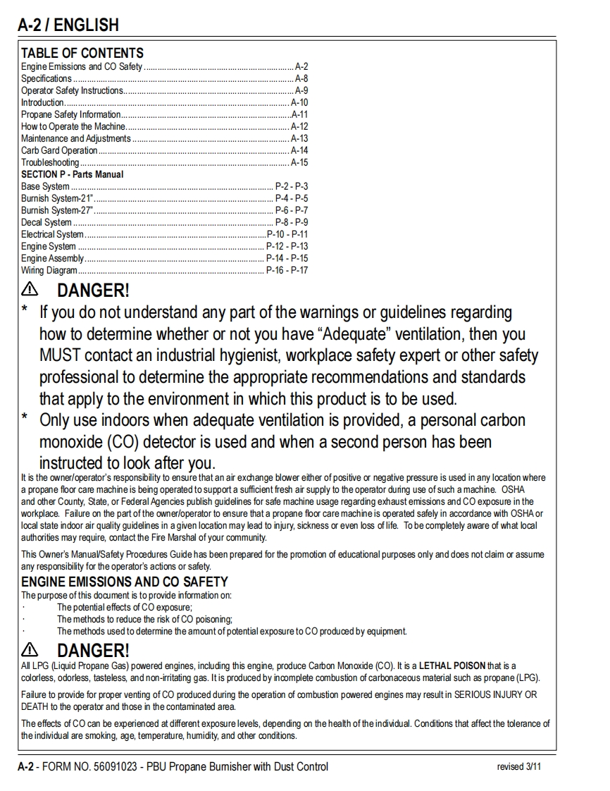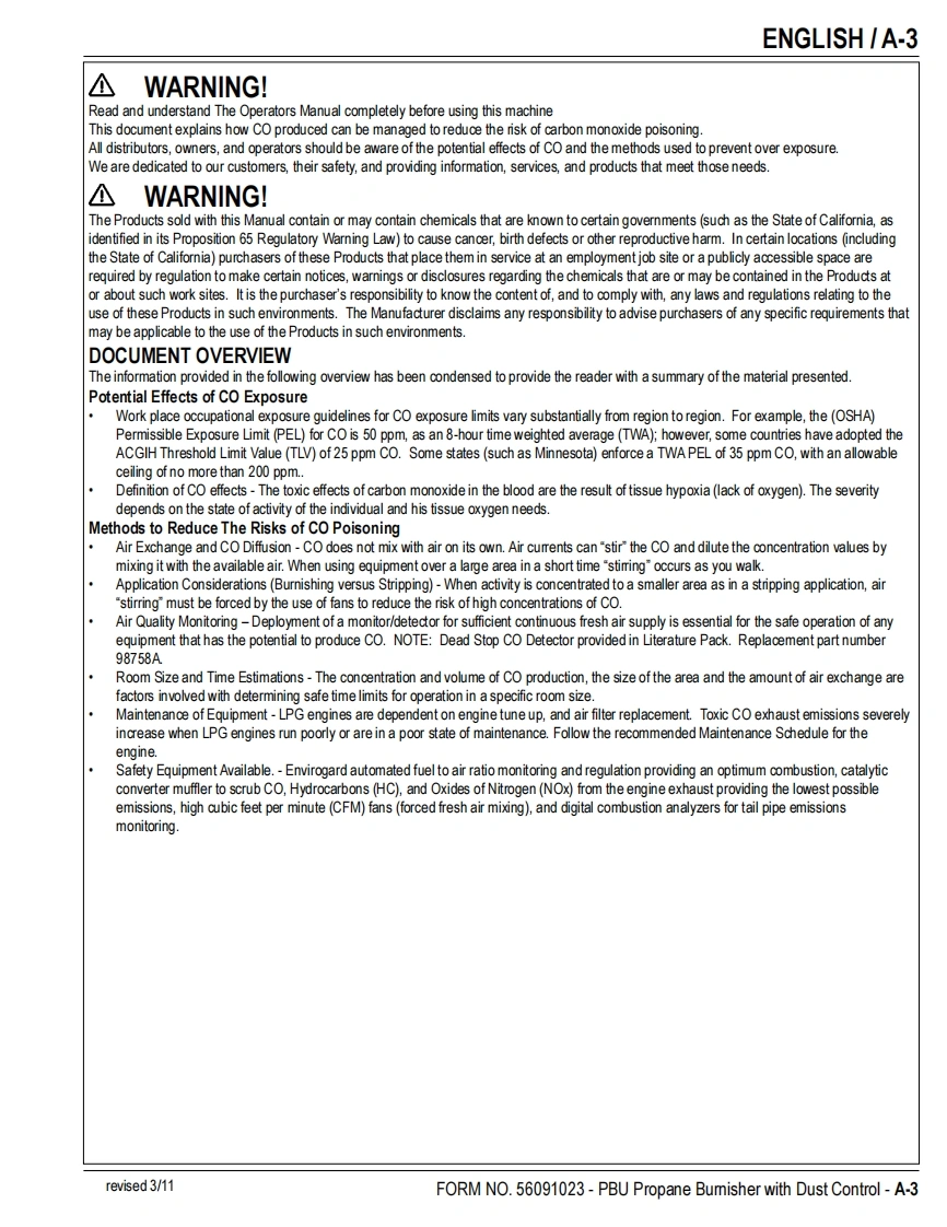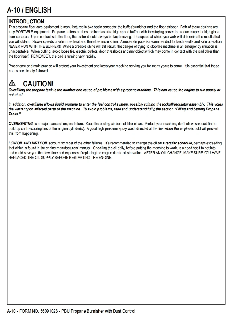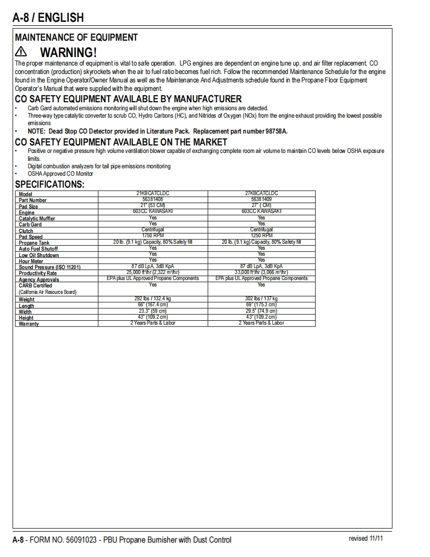 PBUPropaneFloor BurnisherEquipment with Dust ControlOperator's Manual Manuel d'utilisation Libro de InstruccionesModels:56381408(21KBCATCLDC),56381409(27KBCATCLDC)READ THIS BOOKENEnglish(A-2-A-15)LEA ESTE MANUALESEspanol (B-2-B-15)LISEZ CE MANUELFRFrancais(C-2-C-15)This book has important information for the use and safe operation of this machine.Failure to read thisbook prior to operating or attempting any service or maintenance procedure to your machine couldresult in injury to you or to other personnel;damage to the machine or to other property could occur aswell.You must have training in the operation of this machine before using it.If your operator(s)cannotread this manual,have it explained fully before attempting to operate this machine.All directions given in this book are as seen from the operator's position at the rear of the machine.11/10 revised 2/13 FORM NO.56091023