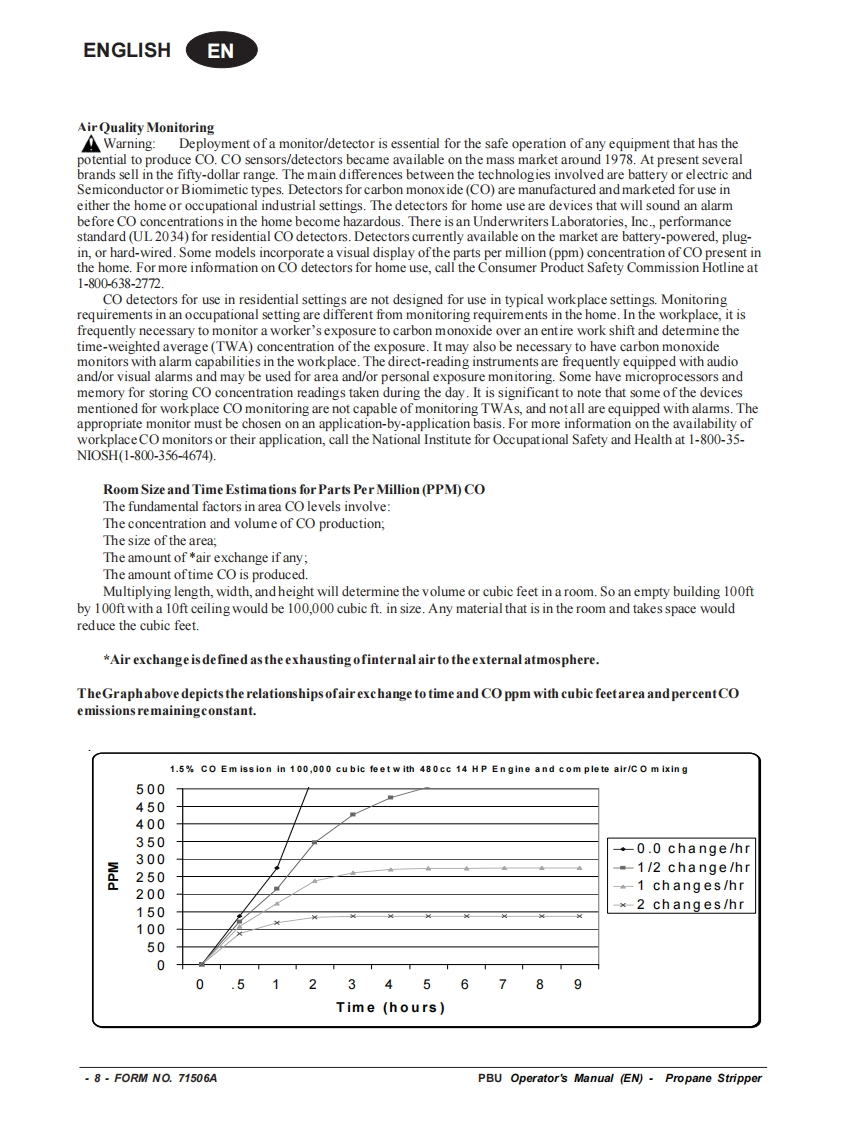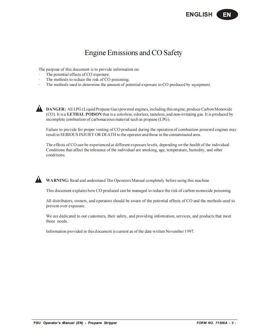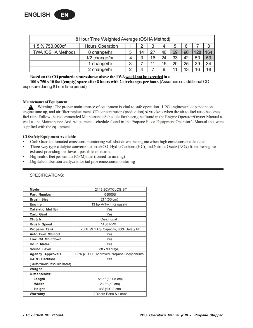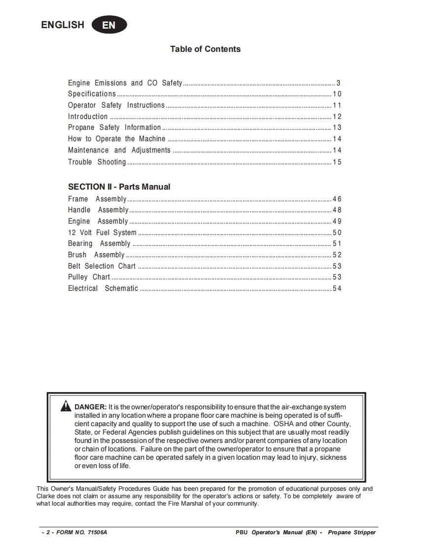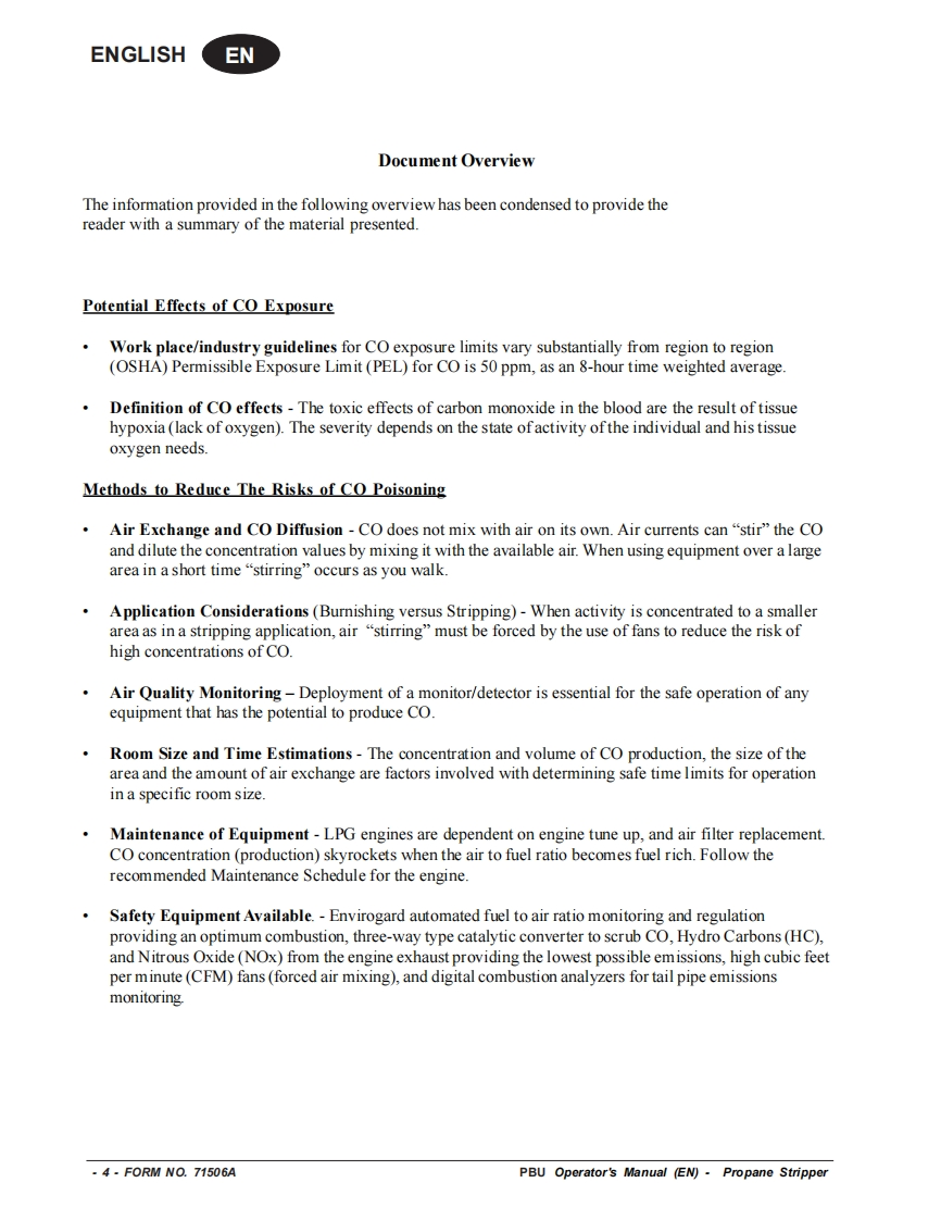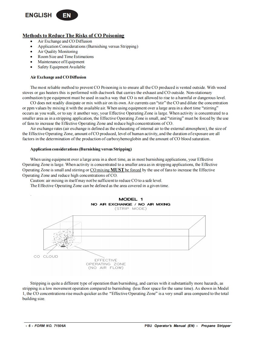 PBUPropane FloorStripperEquipmentOperator's Manual Manuel d'utilisation Libro de InstruccionesMODEL:08006BREAD THIS BOOKENEnglish(2-15)LEA ESTE MANUALESEspanol (16-29)LISEZ CE MANUELFRFrancais (30-43)This book has important information for the use and safe operation of this machine.Failure to read thisbook priortooperating or attempting any service ormaintenance procedure toyour machine could resultin injury to you or to other personnel;damage to the machine or to other property could occur as well.You must have training in the operation of this machine before using it.If your operator(s)cannot readthis manual,have it explained fully before attempting to operate this machine.All directions given in this book are as seen from the operator's position at the rear of the machine.Form No.71506A4/09 revised 8/10