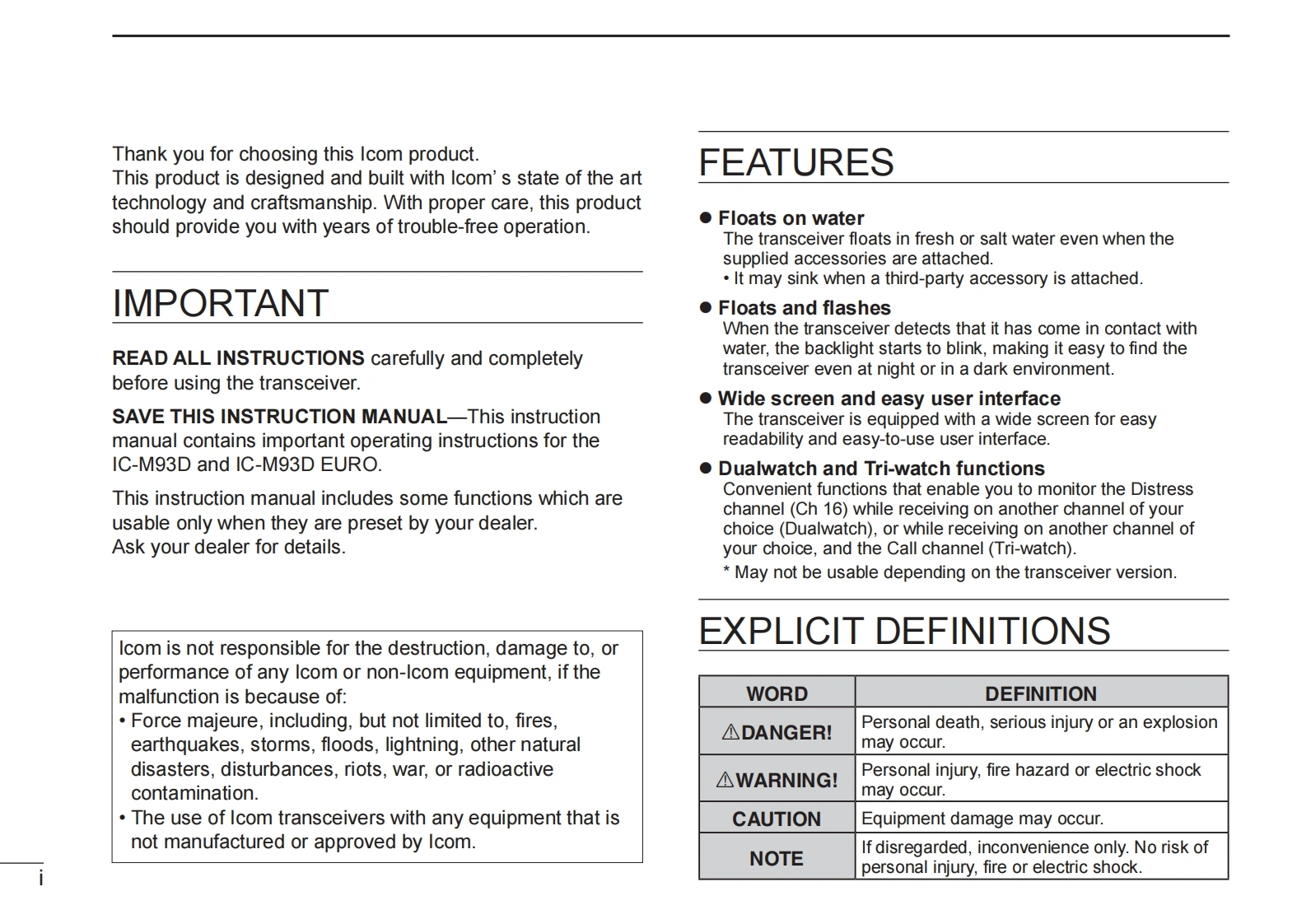 INSTRUCTION MANUALVHE MARINE TRANSCEIVERIC-M93DIC-M93DEUROTCOMIC-M93016CALLINGDTRS OTHER LOGThis device complies with Part 15 of the FCC Rules.Operation issubject to the condition that this device does not cause harmfulinterference.Icom Inc.