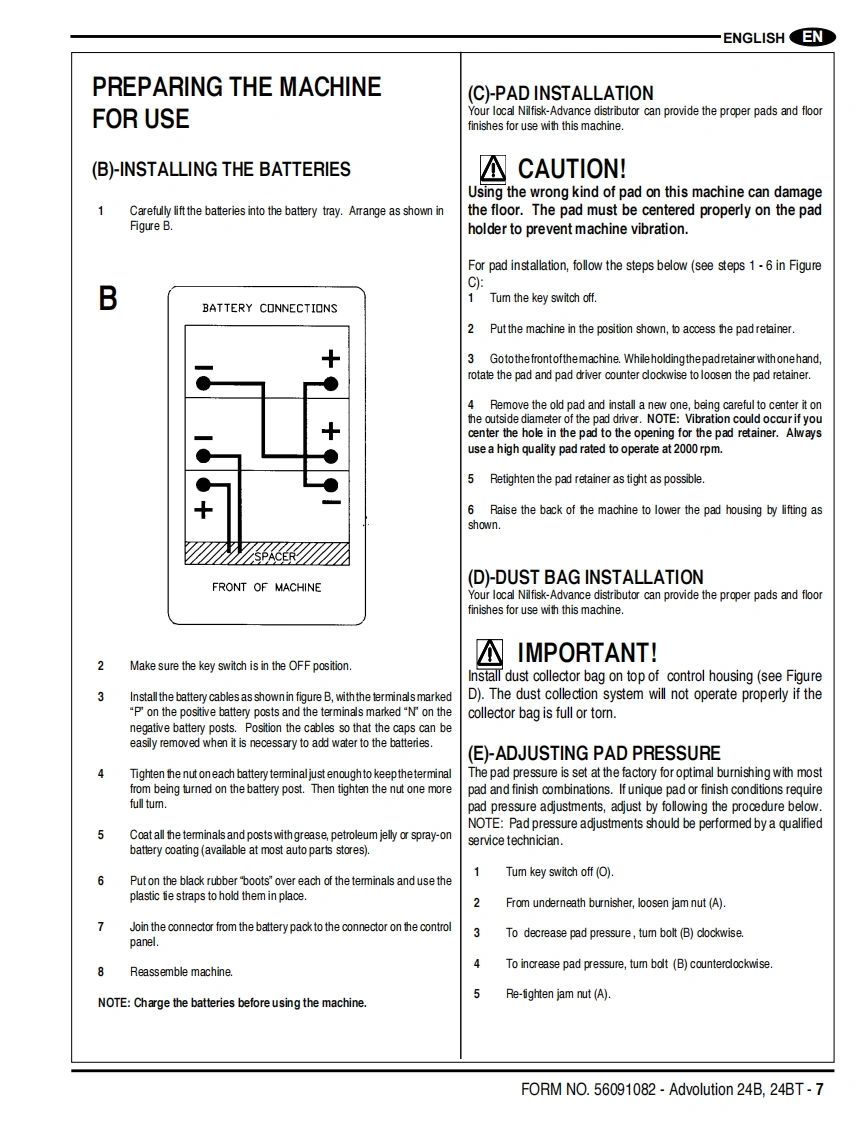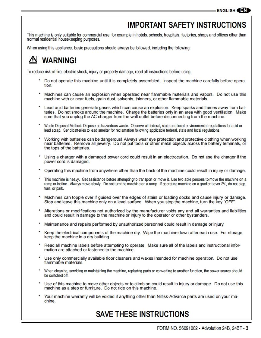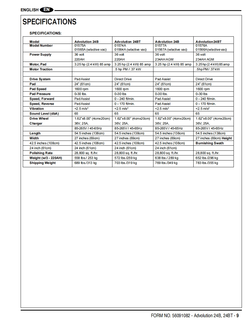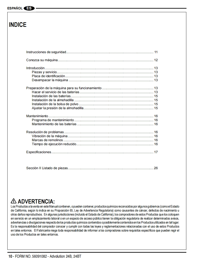 Advolution 24BAdvolution 24BT间△Instructions For Use and Parts ListInstrucciones para el uso y lista de piezasGuides d'utilisation et liste des piecesThis manual is only for machines after serial number 3000117136.Advance Models:01574A(24BT220AH),01575A(24B220AH),01576A(24BT234 AH AGM),01577A(24B234 AHAGM)Advance Models01564A(24BT220AH),01565A(24B220AH),(w/Active Vac):01566A(24BT234 AH AGM),01567A(240B234 AH AGM)NEnglish (2-9)ESEspafiol (10-17)R Francais(18-25)PARTS LIST(26-49)®Advance12/12 revised 8/13 Form Number 56091082