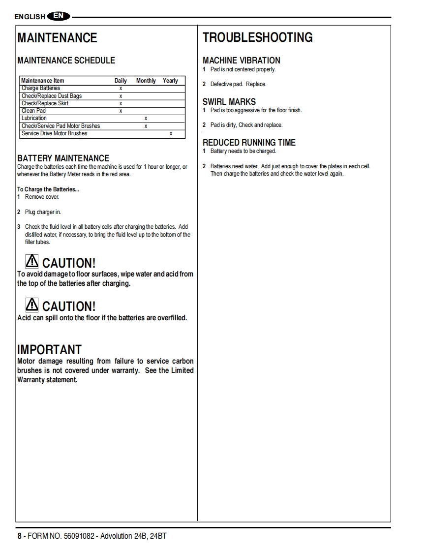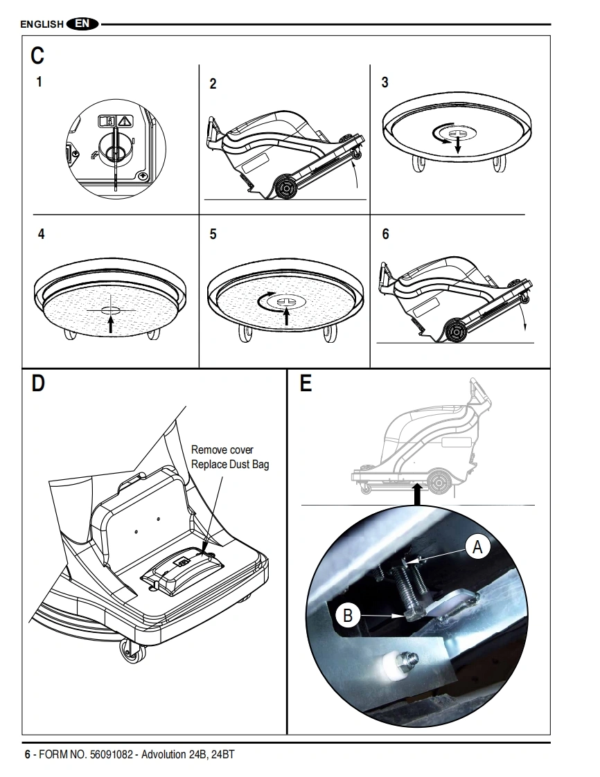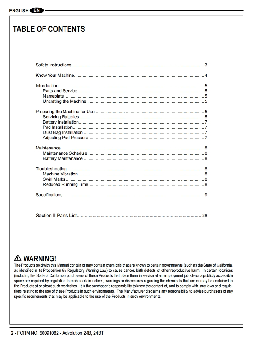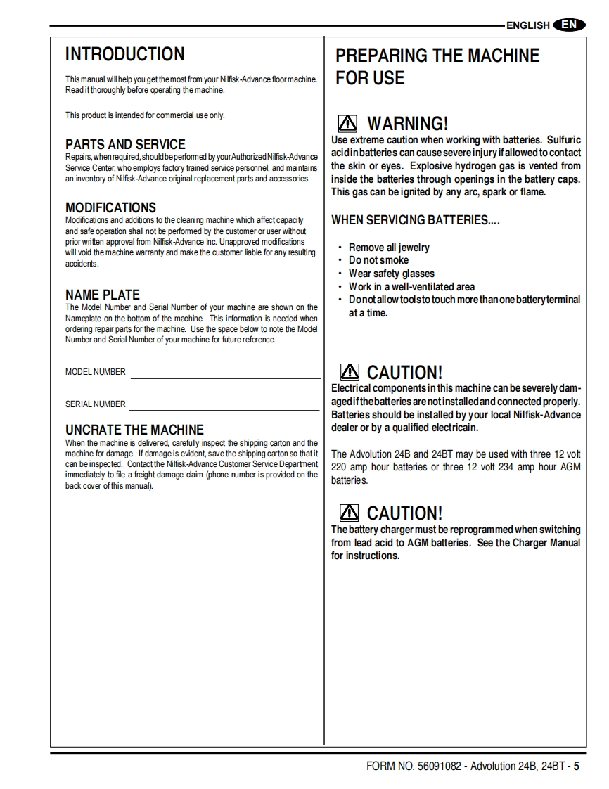 Advolution 24BAdvolution 24BT间△Instructions For Use and Parts ListInstrucciones para el uso y lista de piezasGuides d'utilisation et liste des piecesThis manual is only for machines after serial number 3000117136.Advance Models:01574A(24BT220AH),01575A(24B220AH),01576A(24BT234 AH AGM),01577A(24B234 AHAGM)Advance Models01564A(24BT220AH),01565A(24B220AH),(w/Active Vac):01566A(24BT234 AH AGM),01567A(240B234 AH AGM)NEnglish (2-9)ESEspafiol (10-17)R Francais(18-25)PARTS LIST(26-49)®Advance12/12 revised 8/13 Form Number 56091082