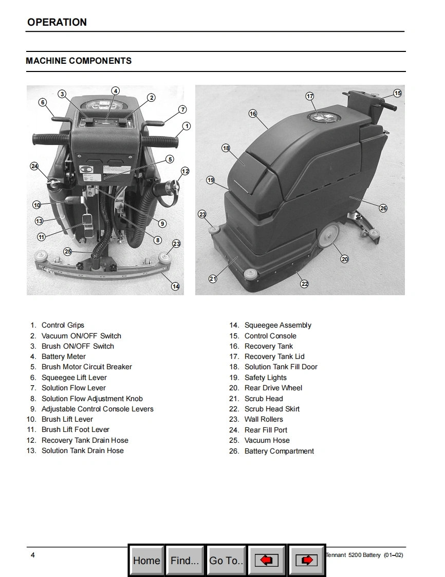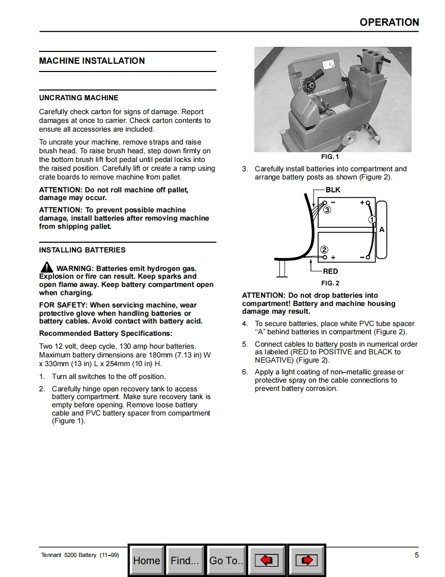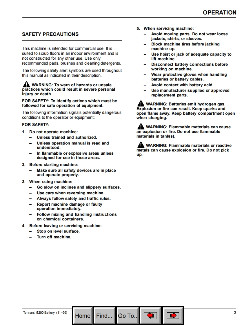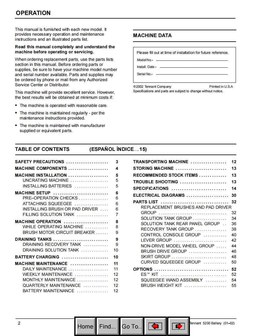 ENGLISH-ESPANOLTENNANT5200Battery Automatic ScrubberFregadora Automatica BateriaModel No.:Operator and Parts Manual612950612951-PacManual de Operacion y de Piezas612952-Can.PacTENNANT COMPANYCommercial Products12875 RANSOM STREETHOLLAND MI 49424FAX:1-800-678-42401-616-786-2345CUSTOMER SERVICE:1-800-982-76586129951-616-786-2330ReV.00(01-02)HomeFind...Go To.