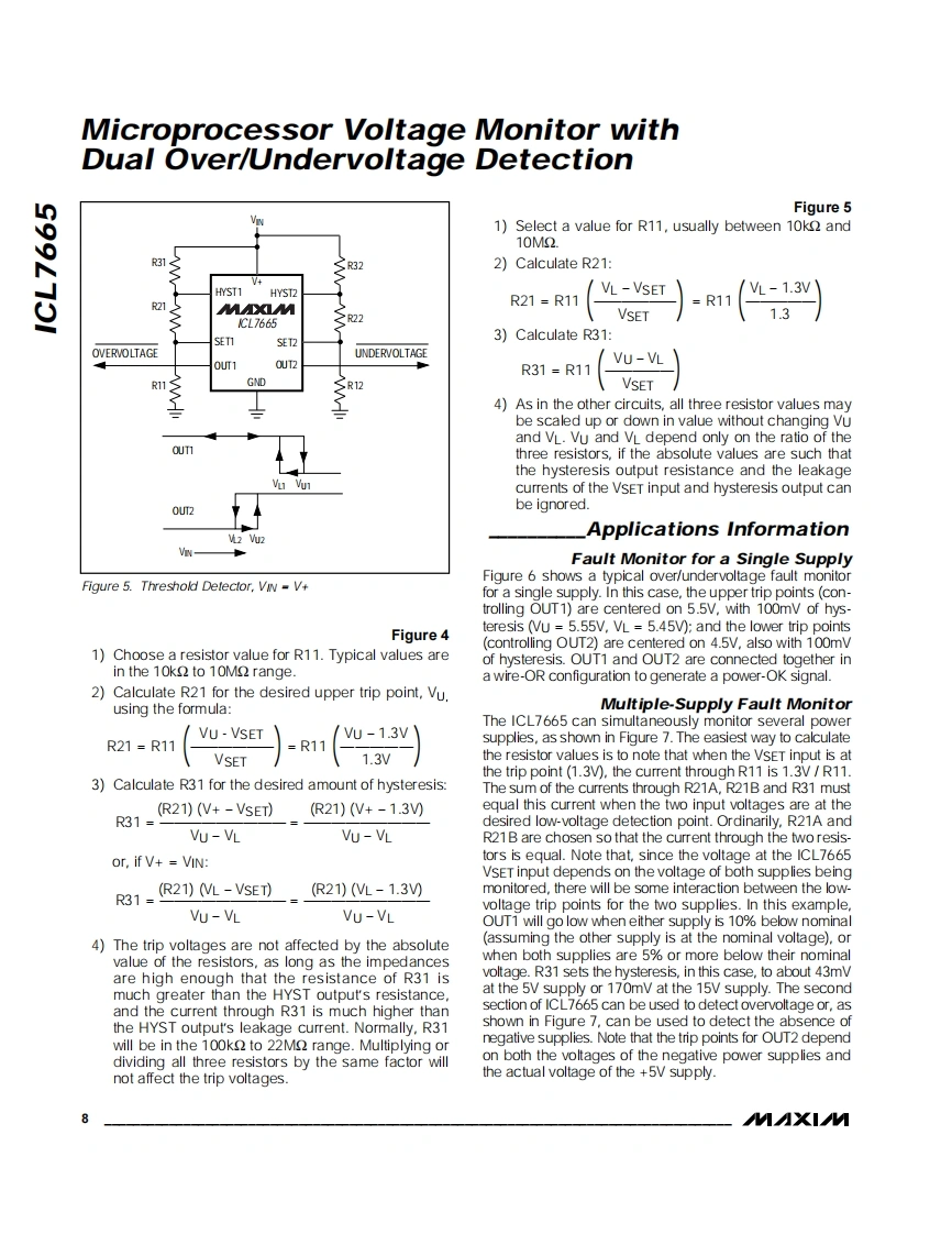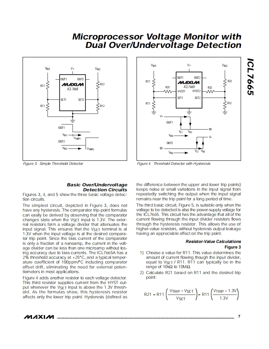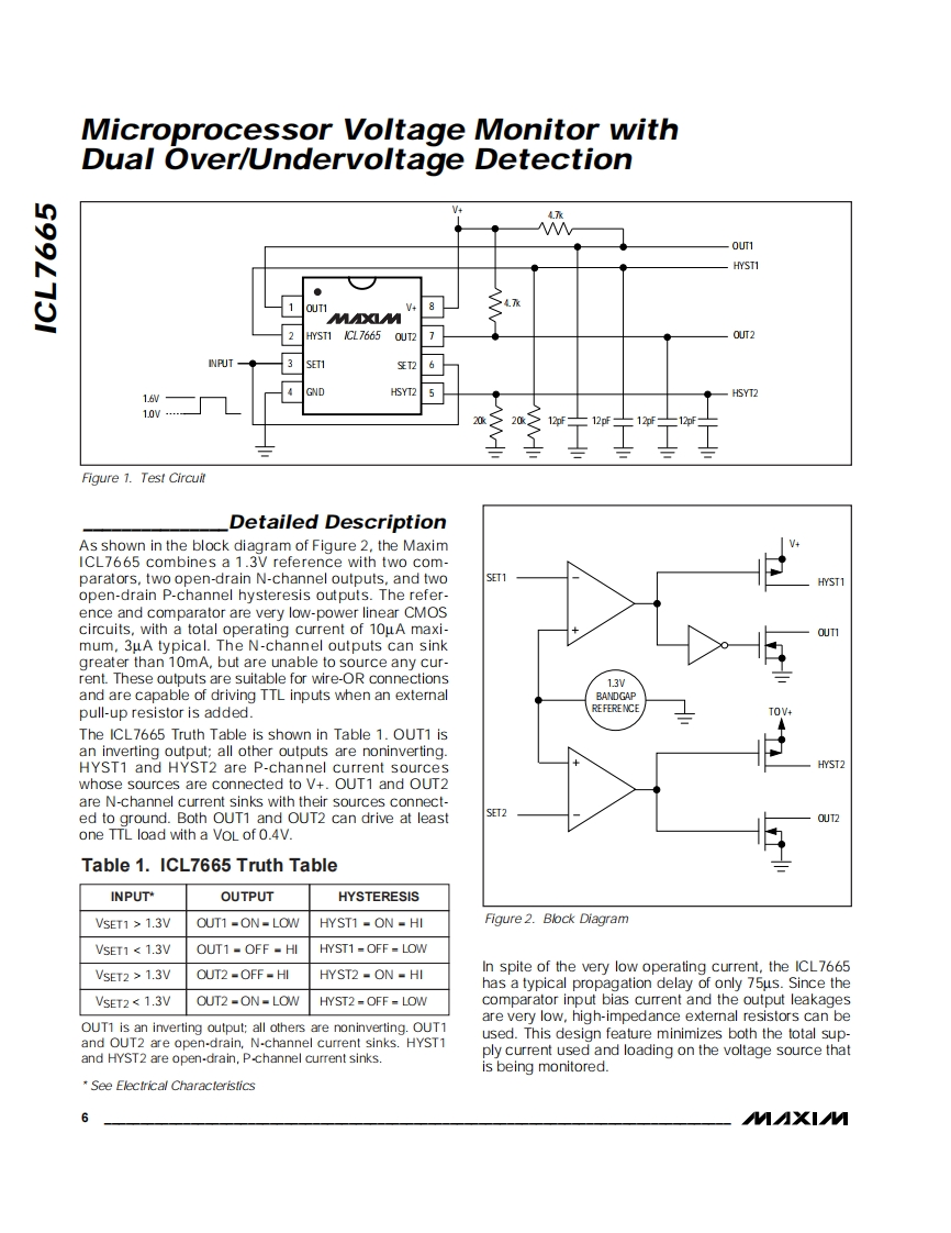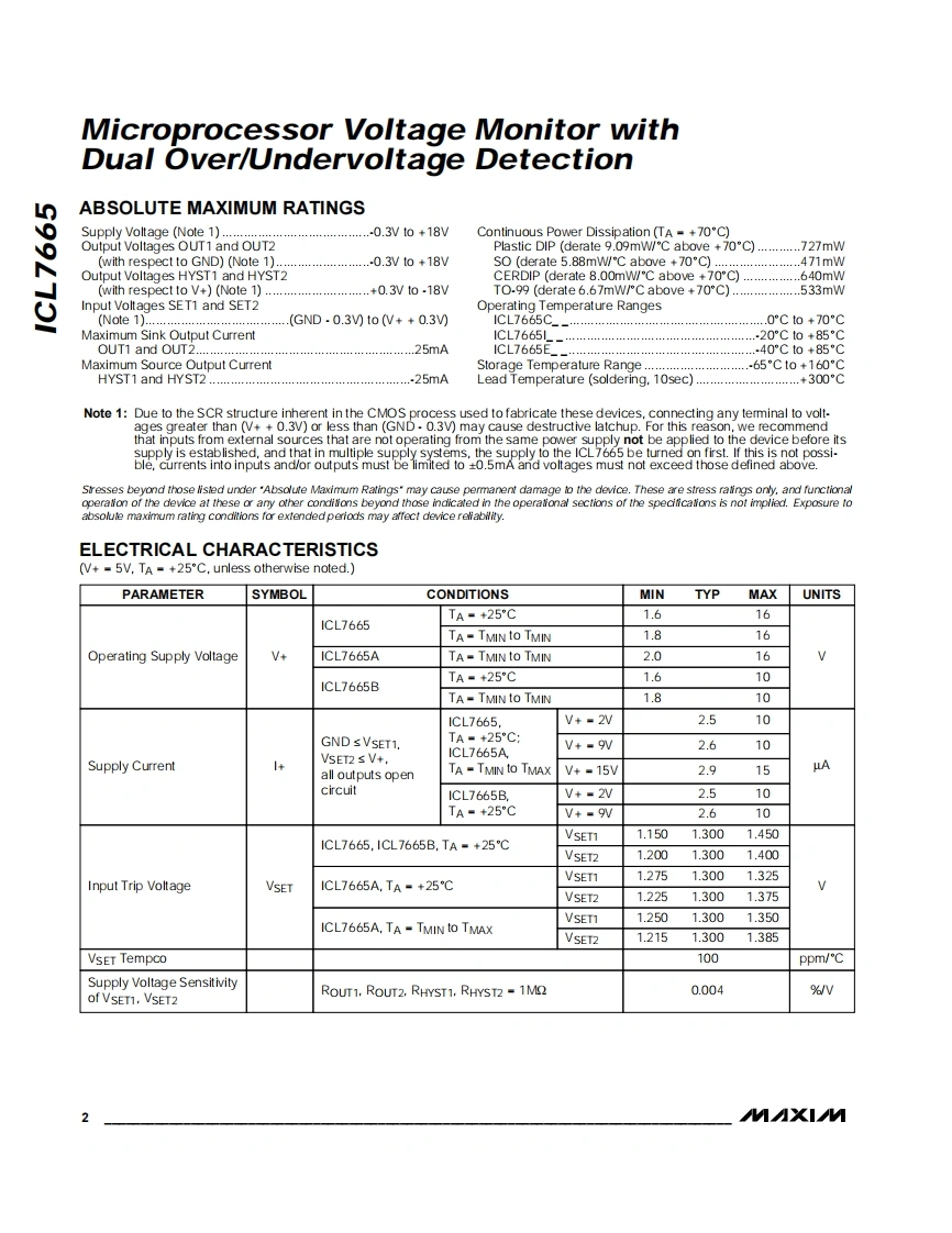 190001:Rev2:897MAXAMicroprocessor Voltage Monitor withDual Over/Undervoltage DetectionGeneral DescriptionFeaturesThe ICL7665 warns microprocessors (uPs)of overvolt-uP Over/Undervoltage Warningage and undervoltage conditions.It draws a typicalImproved Second Sourceoperating current of only 3uA.The trip points and hys-Dual Comparator with Precision Internal Referenceteresis of the two voltage detectors are individually pro-grammed via external resistors to any voltage greater◆3μA Operating Currentthan 1.3V.The ICL7665 will operate from any supply+2%Threshold Accuracy (ICL7665A)8voltage in the 1.6V to 16V range,while monitoring volt-+1.6V to 16V Supply Voltage Rangeages from 1.3V to several hundred volts.The MaximICL7665A is an improved version with a 2%-accurate+On-Board Hysteresis OutputsVsET1 threshold and guaranteed performance over+Externally Programmable Trip Pointstemperature.Monolithic,Low-Power CMOS DesignThe 3JA quiescent current of the ICL7665 makes itideal for voltage monitoring in battery-powered sys-tems.In both battery-and line-powered systems,theOrdering Informationunique combination of a reference,two comparators,and hysteresis outputs reduces the size and compo-PARTTEMP.RANGEPIN-PACKAGEnent count of many circuits.ICL7665CPA0°Ct0+70°C8 Plastic DIPICL7665ACPA0°Cto+70°C8 Plastic DIPApplicationsICL7665BCPA0°Ct0+70°C8 Plastic DIPμPVoltage MonitoringICL7665CSA0°Ct0+70°C8S0Low-Battery DetectionICL7665ACSA0°Cto+70°C8s0Power-Fail and Brownout DetectionICL7665BCSA0°Ct0+70°C8S0ICL7665CJA0°Ct0+70°C8 CERDIPBattery Backup SwitchingICL7665ACJA0°Ct0+70°C8 CERDIPPower-Supply Fault MonitoringICL7665BCJA0°Ct0+70°C8 CERDIPOver/Undervoltage ProtectionOrdering Infommation continued on last page.High/Low Temperature,Pressure,Voltage AlarmsPin ConfigurationsTOP VIEW●OUT1 18v+Typical Operating CircuitHYST12MM7 OUT2SET1 31CL7665V+6SET228GND 45HYST2OVERVOLTAGEUNDERVOLTAGEDETECTION1V+OUT1DETECTIONOUT2NMIDIP/SOMAXMv(CAS)1CL7665OUT1/OUT23SET2HYST1 (2)MD☒MGND6)ST2CL7665sETn(3】⑤HYsT2GNDSIMPLE THRESHOLD DETECTORT0-99MAXIMMaxim Integrated Products 1For free samples the latest literature:http://www.maxim-ic.com,or phone 1-800-998-8800.For small orders,phone 408-737-7600 ext.3468.