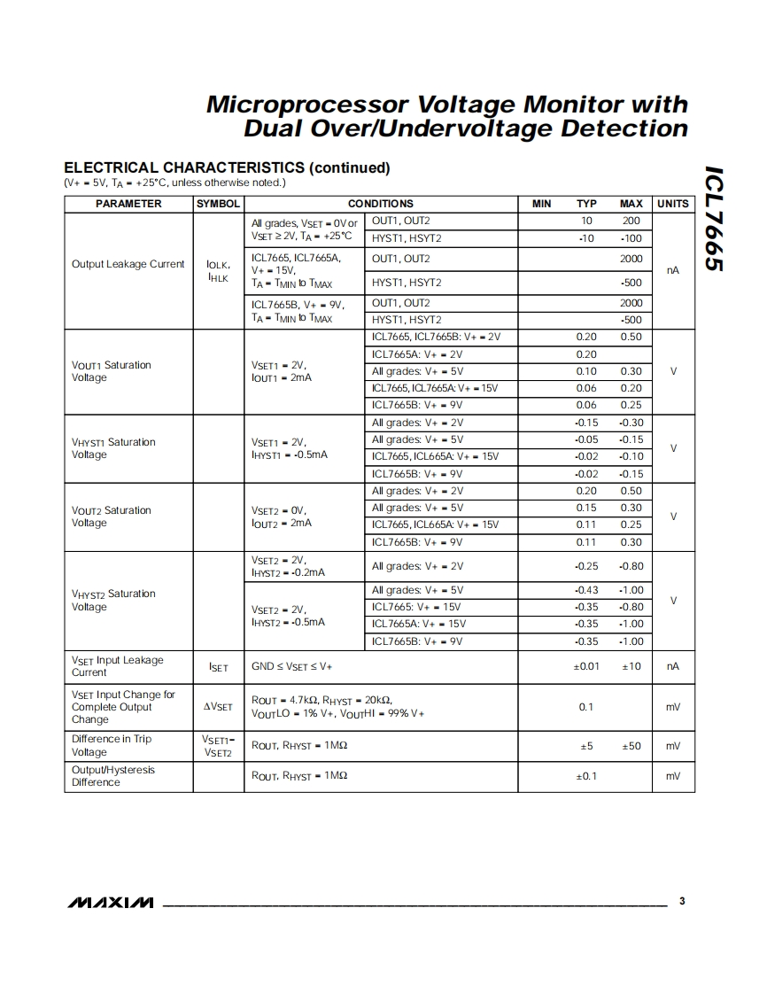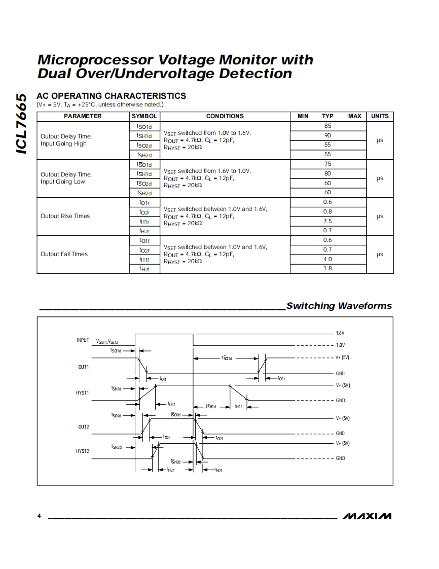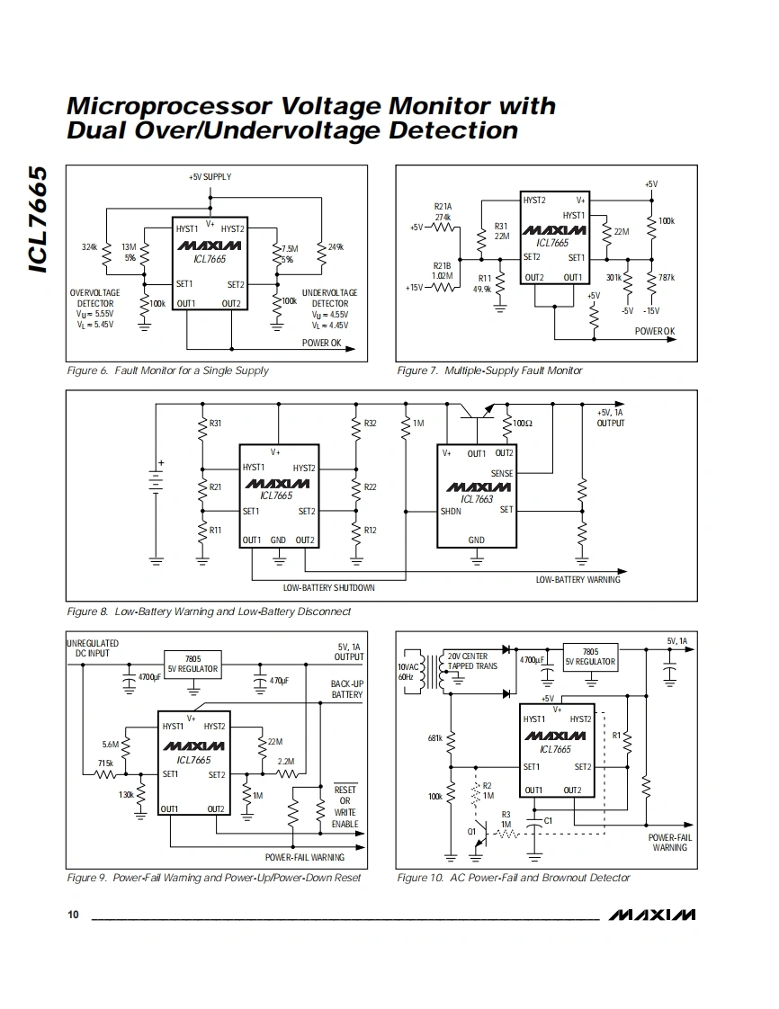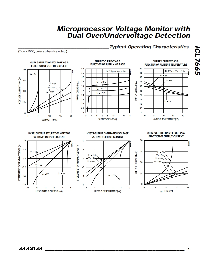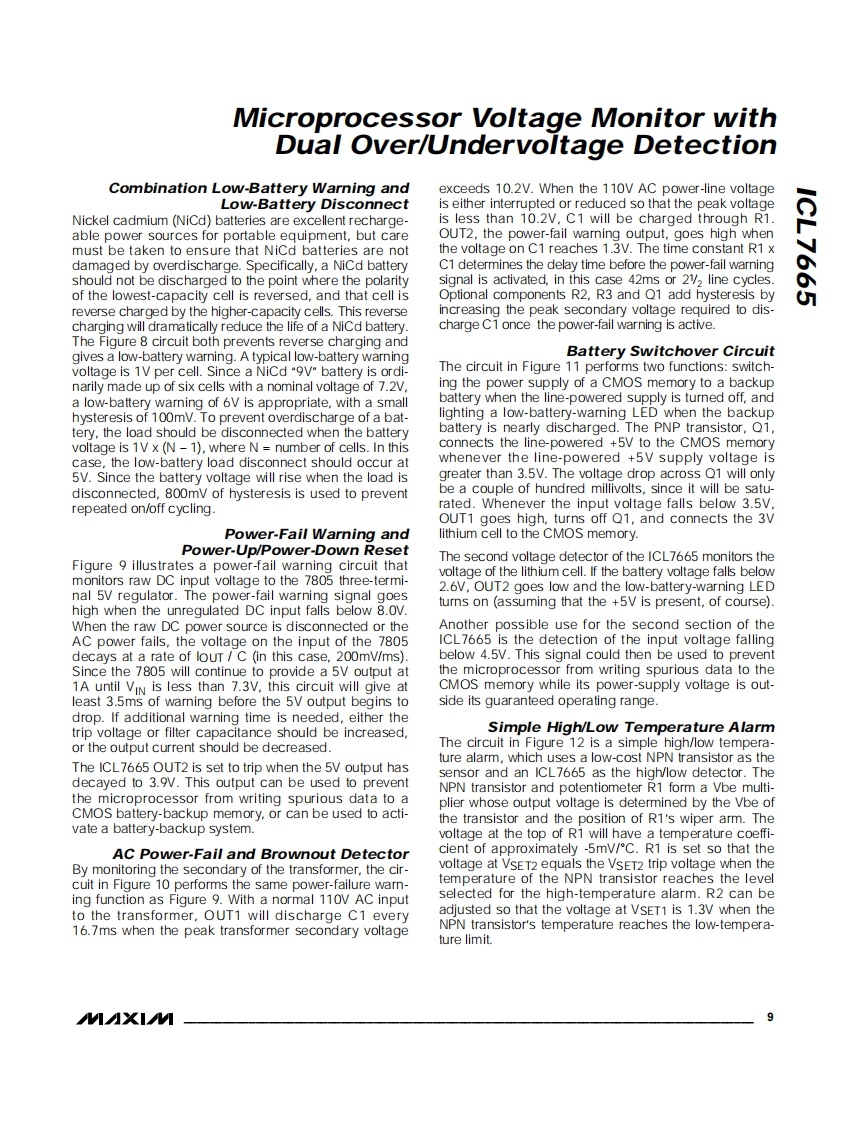 190001:Rev2:897MAXAMicroprocessor Voltage Monitor withDual Over/Undervoltage DetectionGeneral DescriptionFeaturesThe ICL7665 warns microprocessors (uPs)of overvolt-uP Over/Undervoltage Warningage and undervoltage conditions.It draws a typicalImproved Second Sourceoperating current of only 3uA.The trip points and hys-Dual Comparator with Precision Internal Referenceteresis of the two voltage detectors are individually pro-grammed via external resistors to any voltage greater◆3μA Operating Currentthan 1.3V.The ICL7665 will operate from any supply+2%Threshold Accuracy (ICL7665A)8voltage in the 1.6V to 16V range,while monitoring volt-+1.6V to 16V Supply Voltage Rangeages from 1.3V to several hundred volts.The MaximICL7665A is an improved version with a 2%-accurate+On-Board Hysteresis OutputsVsET1 threshold and guaranteed performance over+Externally Programmable Trip Pointstemperature.Monolithic,Low-Power CMOS DesignThe 3JA quiescent current of the ICL7665 makes itideal for voltage monitoring in battery-powered sys-tems.In both battery-and line-powered systems,theOrdering Informationunique combination of a reference,two comparators,and hysteresis outputs reduces the size and compo-PARTTEMP.RANGEPIN-PACKAGEnent count of many circuits.ICL7665CPA0°Ct0+70°C8 Plastic DIPICL7665ACPA0°Cto+70°C8 Plastic DIPApplicationsICL7665BCPA0°Ct0+70°C8 Plastic DIPμPVoltage MonitoringICL7665CSA0°Ct0+70°C8S0Low-Battery DetectionICL7665ACSA0°Cto+70°C8s0Power-Fail and Brownout DetectionICL7665BCSA0°Ct0+70°C8S0ICL7665CJA0°Ct0+70°C8 CERDIPBattery Backup SwitchingICL7665ACJA0°Ct0+70°C8 CERDIPPower-Supply Fault MonitoringICL7665BCJA0°Ct0+70°C8 CERDIPOver/Undervoltage ProtectionOrdering Infommation continued on last page.High/Low Temperature,Pressure,Voltage AlarmsPin ConfigurationsTOP VIEW●OUT1 18v+Typical Operating CircuitHYST12MM7 OUT2SET1 31CL7665V+6SET228GND 45HYST2OVERVOLTAGEUNDERVOLTAGEDETECTION1V+OUT1DETECTIONOUT2NMIDIP/SOMAXMv(CAS)1CL7665OUT1/OUT23SET2HYST1 (2)MD☒MGND6)ST2CL7665sETn(3】⑤HYsT2GNDSIMPLE THRESHOLD DETECTORT0-99MAXIMMaxim Integrated Products 1For free samples the latest literature:http://www.maxim-ic.com,or phone 1-800-998-8800.For small orders,phone 408-737-7600 ext.3468.