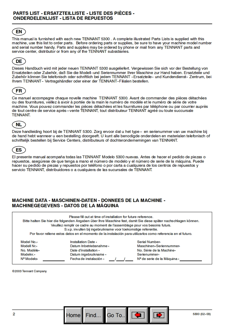 TENNANT-5300-0203操作与维修手册含电器原理图找手册网18天前发布关注私信1.75MB58页040TENNANT-5300-0203操作与维修手册含电器原理图此内容为付费资源,请付费后查看¥19¥21黄金会员免费钻石会员免费登录购买付费资源 第1页 / 共58页 第2页 / 共58页 第3页 / 共58页 第4页 / 共58页 第5页 / 共58页 第6页 / 共58页 第7页 / 共58页 第8页 / 共58页 第9页 / 共58页 第10页 / 共58页 试读已结束,还剩48页,您可下载完整版后进行离线阅读 THE ENDTENNANT(坦能) 文本预览 TENNANT5300Model No.:Parts ListENM5300562M5300592ErsatzteillisteDEM53005062 FaST TMListe Des PiecesFROnderdelen LijstNLLista De RepuestosESEaSTFoam Scrubbing TechnologyPatents Pendingc€MP113-2Rev.03(02-03)HomeFind...Go To 查看更多 收起部分 喜欢就支持一下吧收藏