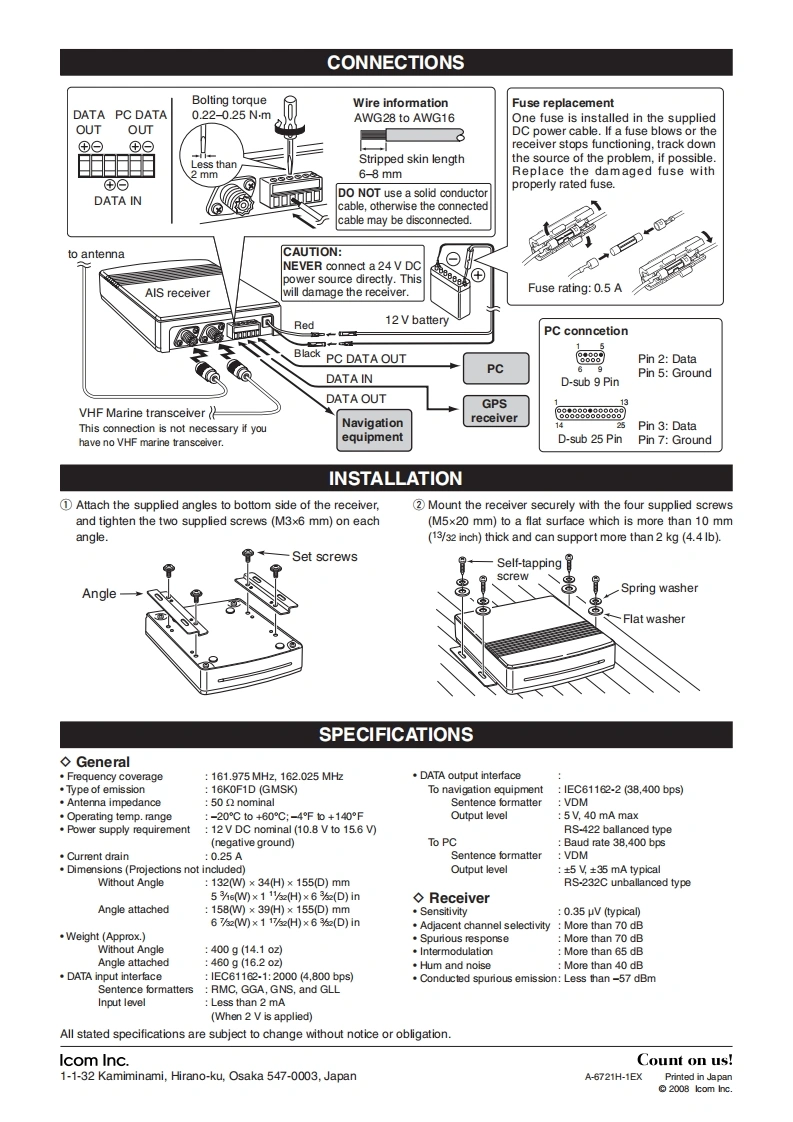 INSTRUCTIONSAIS RECEIVERThank you for purchasing the MXA-5000 AISMXA-5000RECEIVER.Please read these instructions carefully beforeinstallation and operation.PRECAUTIONS.ANEVER apply AC power to the [DC 12 V]connector on.ANEVER touch the receiver with wet hands.This may re-the rear panel.This could cause a fire or damage the re-sult in an electric shock or damage the receiver.ceiver.·△NEVER apply more than25 W RF power or out of.ANEVER connect the receiver to a power source of moreVHF marine frequency (156.000 to 161.450 MHz)to thethan 16 V DC such as a 24 V battery.This will damage the[RADIO]connector on the rear panel.This will damage thereceiver.receiver..ANEVER connect the receiver to a power source usingDO NOT use or place the receiver in areas with tempera-reverse polarity.This will damage the receiver.tures below-20°C(-4F)or above+60°C(+140°月orin.ANEVER cut the DC power cable between the DC plugareas subject to direct sunlight,such as the dashboard.and fuse holder.If an incorrect connection is made afterDO NOT use chemical agents such as benzine or alcoholcutting,the receiver may be damaged.when cleaning,as they can damage the receiver's sur-.ANEVER expose the receiver to rain,snow or any liquids.faces.The receiver may be damaged.Place unit in a secure place to avoid inadvertent use bychildren.FEATURESPANEL DESCRIPTIONSO Dualwatch operation①Power indicatorTwo independent receivers can simultaneously receiveCH87B(161.975 MHz)and CH88B(162.025 MHz).O Power divider bult-inA power divider is built-in the MXA-5000.This provideseasy installation as well,since no extra antenna is②Antenna connectors④Multi connectornecessary-just connect the receiver between your VHFPC DATA OUTmarine transceiver and an antenna⊙3DATA IN-.The internal power divider protects the receiver from a transmitDATA OUT-signal of the VHF marine transceiver.③DC power connectorO GPS receiver is connectableWhen a GPS receiver is connected,the GPS informationis added to the received AlS information,and can be sent1 POWER INDICATORto the connected PC or navigation system.Lights green during power ON.②ANTENNA CONNECTORSO [ANTENNA]SUPPLIED ACCESSORIESConnects to a VHF marine antenna with a PL-259connector①DC power cableO [RADIO]②Angle2Connects to a VHF marine transceiver with a PL-259③Set screws(M3x6mm)….4connector.④Self--tapping screws(M5×20mm).4.VHF marine transceiver:Output power 25 W nominal and⑤Spring washers.4transmit frequency range from 156.000 MHz to 161.4506 Flat washers.4MHz.1 mm =1/32 inchWhen a VHF marine transceiver is connected with anantenna through the MXA-5000,its receive sensitivity(①will be reduced (Insertion loss:approx.3 dB).This isnormal,and does not indicate the receive's malfunction.3 DC POWER CONNECTOR [12V DC]Connects the supplied DC power cable from this con-③⑤⑥nector to an external 12V DC power source.带的7了ff。Da⑨④MULTI CONNECTOR骨孕@@O[PC DATA OUT]Connects to a PC.Icom,Icom Inc.and the loom logo are registered trademarks of loom IncorO[DATA IN]porated (Japan)i