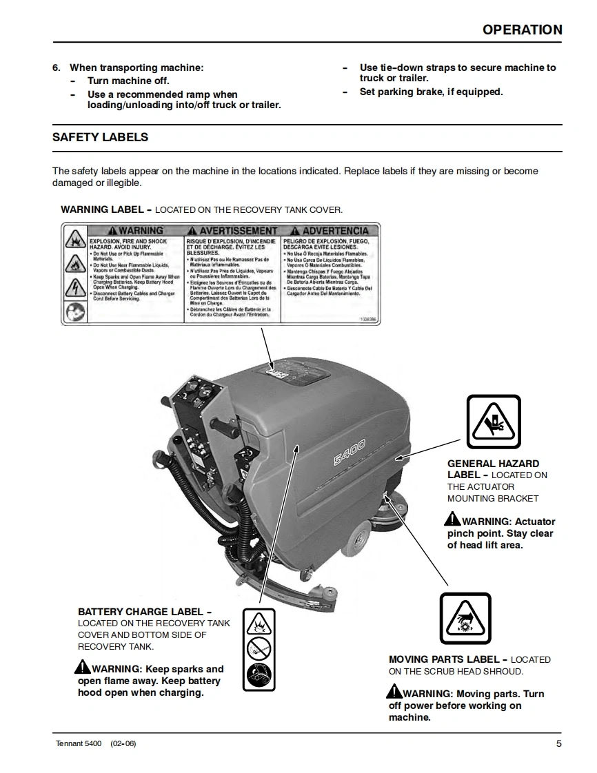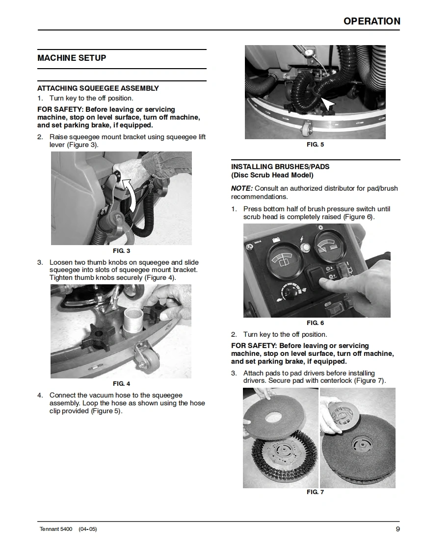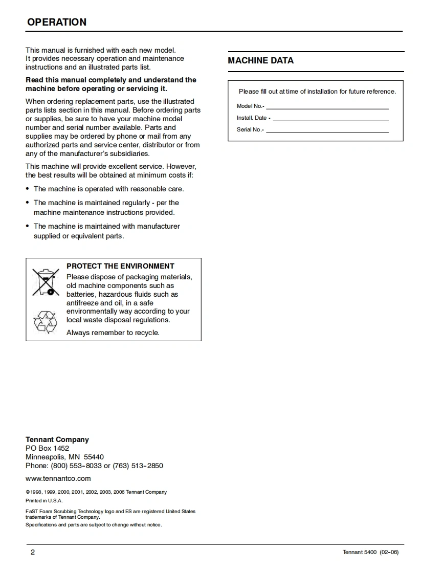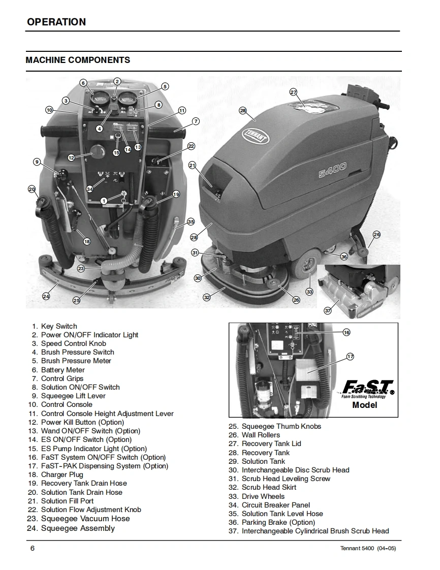ENGUSH-ESPANOL-FRANCAISTENNANT5400Scrubber-DryerFregadora-SecadoraBrosseuse-SecheuseOperator and Parts ManualManual De Operador回®©间Y Lista De RepuestosOperateur Manuel etListe Des PiecesModel Part No.:606931 -Disc Standard,610 mm (24 in)606932-Disc ES,610mm(24in)607525-Disc Wand Prep,610 mm(24 in)606933-Disc Deluxe.610 mm(24 in)606934-Cylindrical Standard,610 mm(24 in)606935-Cylindrical ES,610 mm (24 in)607526 -Cylindrical Wand Prep,610 mm (24 in)606936-Cylindrical Deluxe,610 mm(24 in)610877-Disc Standard,660 mm (26 in)610878-Disc ES,660mm(26in)610879-Disc Wand Prep,660 mm(26 in)610880-Disc Deluxe,660 mm (26 in)398040-Disc FaST,610 mm (24 in)398041 -Disc FaST,660 mm (26 in)EaSTFoam Scrubbing Technology606862The Safe Scrubbing AlternativeReV.09(12-2006)www.tennantco.com