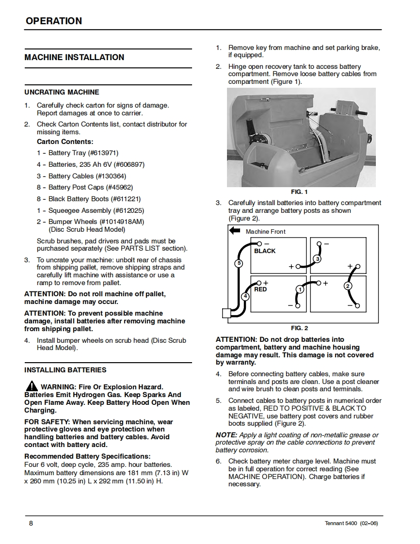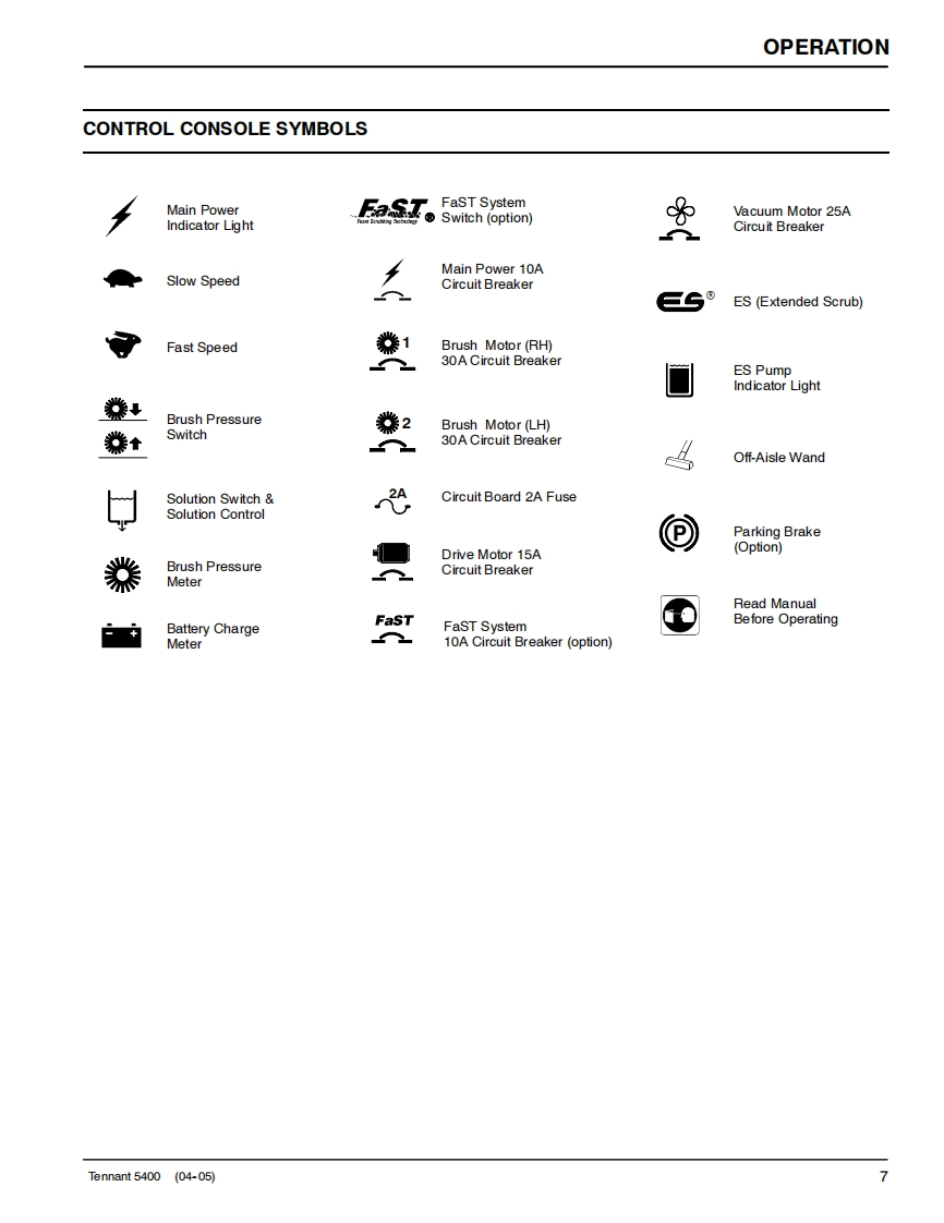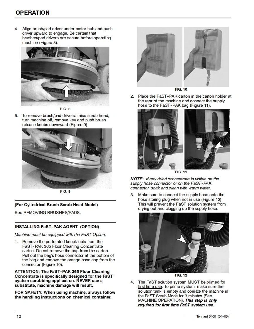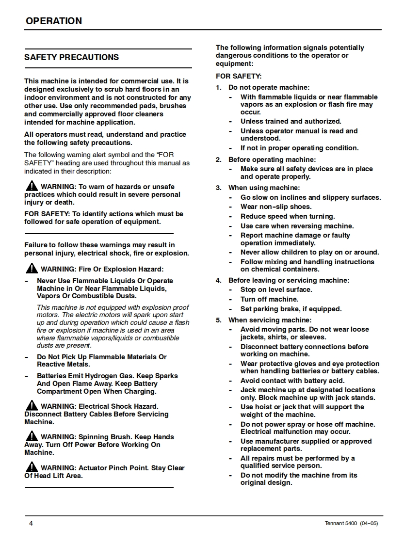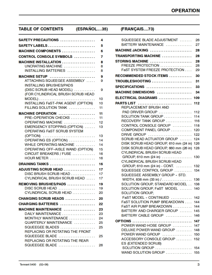 ENGUSH-ESPANOL-FRANCAISTENNANT5400Scrubber-DryerFregadora-SecadoraBrosseuse-SecheuseOperator and Parts ManualManual De Operador回®©间Y Lista De RepuestosOperateur Manuel etListe Des PiecesModel Part No.:606931 -Disc Standard,610 mm (24 in)606932-Disc ES,610mm(24in)607525-Disc Wand Prep,610 mm(24 in)606933-Disc Deluxe.610 mm(24 in)606934-Cylindrical Standard,610 mm(24 in)606935-Cylindrical ES,610 mm (24 in)607526 -Cylindrical Wand Prep,610 mm (24 in)606936-Cylindrical Deluxe,610 mm(24 in)610877-Disc Standard,660 mm (26 in)610878-Disc ES,660mm(26in)610879-Disc Wand Prep,660 mm(26 in)610880-Disc Deluxe,660 mm (26 in)398040-Disc FaST,610 mm (24 in)398041 -Disc FaST,660 mm (26 in)EaSTFoam Scrubbing Technology606862The Safe Scrubbing AlternativeReV.09(12-2006)www.tennantco.com