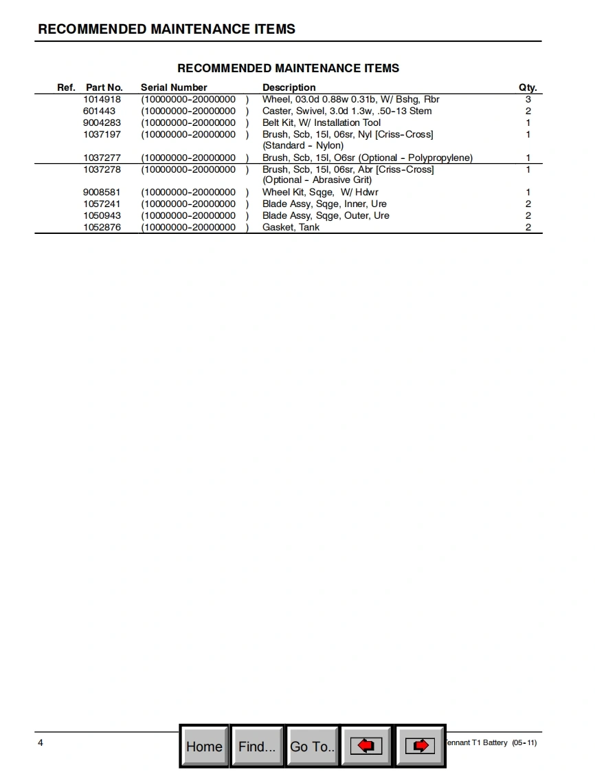 Tennant-T1-SN100000-200000-05-11找手册网18天前发布关注私信3.13MB35页039Tennant-T1-SN100000-200000-05-11此内容为付费资源,请付费后查看¥19¥21黄金会员免费钻石会员免费登录购买付费资源 第1页 / 共35页 第2页 / 共35页 第3页 / 共35页 第4页 / 共35页 第5页 / 共35页 第6页 / 共35页 第7页 / 共35页 第8页 / 共35页 第9页 / 共35页 第10页 / 共35页 试读已结束,还剩25页,您可下载完整版后进行离线阅读 THE ENDTENNANT(坦能) 文本预览 TENNANTT1Floor Scrubber(S/N10000000-20000000)Parts ManualModels9004191-120VNorth America Japan9006285ReV.01(05-2011)www.tennantco.comIHomeFind...Go To. 查看更多 收起部分 喜欢就支持一下吧收藏