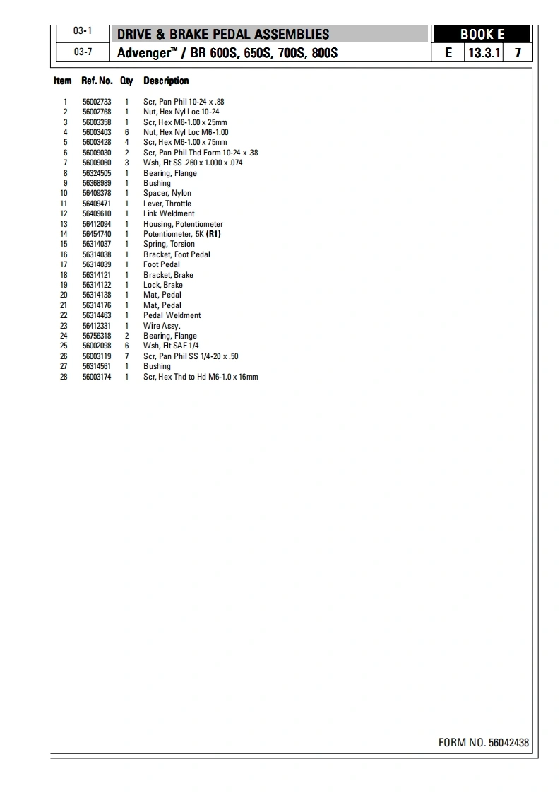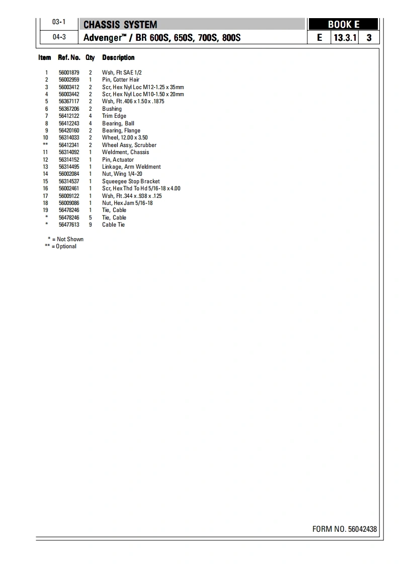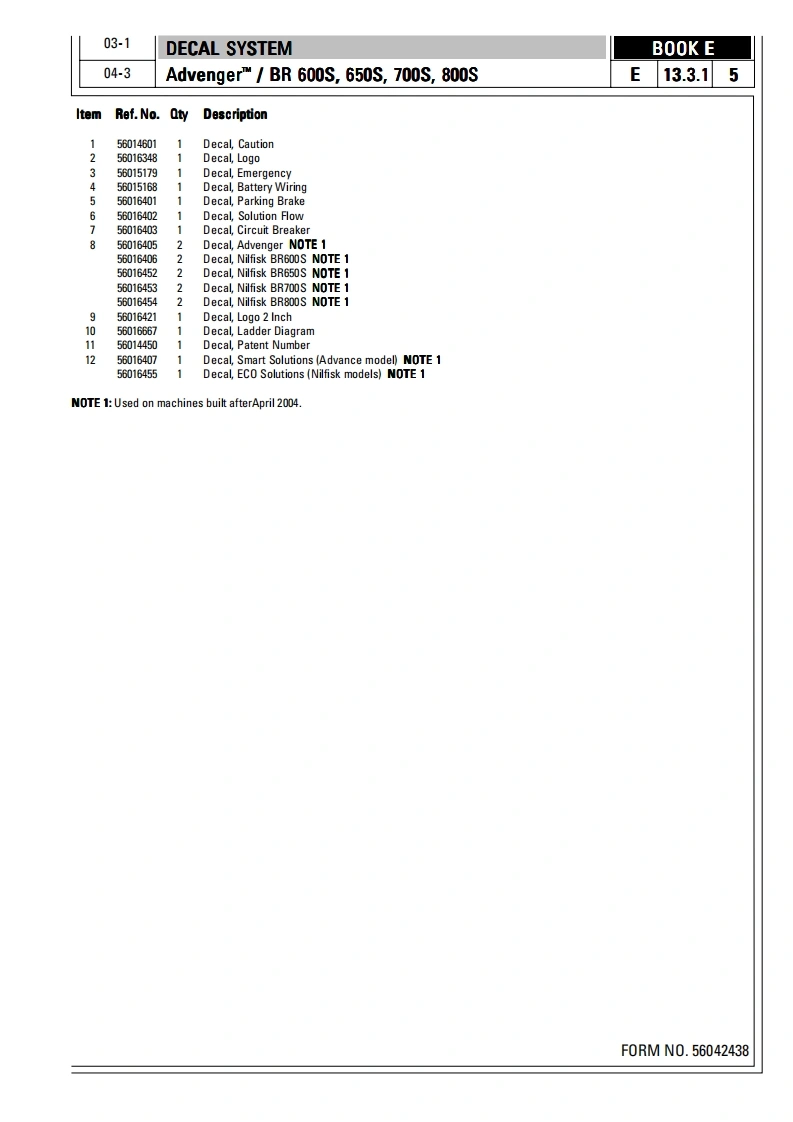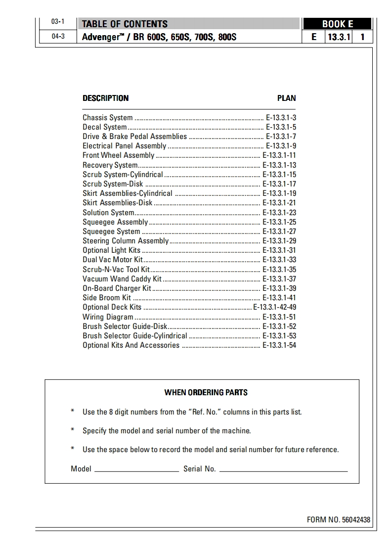 AdvengerTMBR600S,650S,700S,800SPARTS LISTAdvance M0DELS56314000,56314001,56314002,56314003,56314004,56314005,56314006,56314007Nilfisk M0DELS56314010,56314011,56314012,56314013,56314014,56314015,56314016,56314017NilfiskAdvancesetting standards1/03 revised4/04F0RMN0.56042438BOOK E SECTION 13.3.1