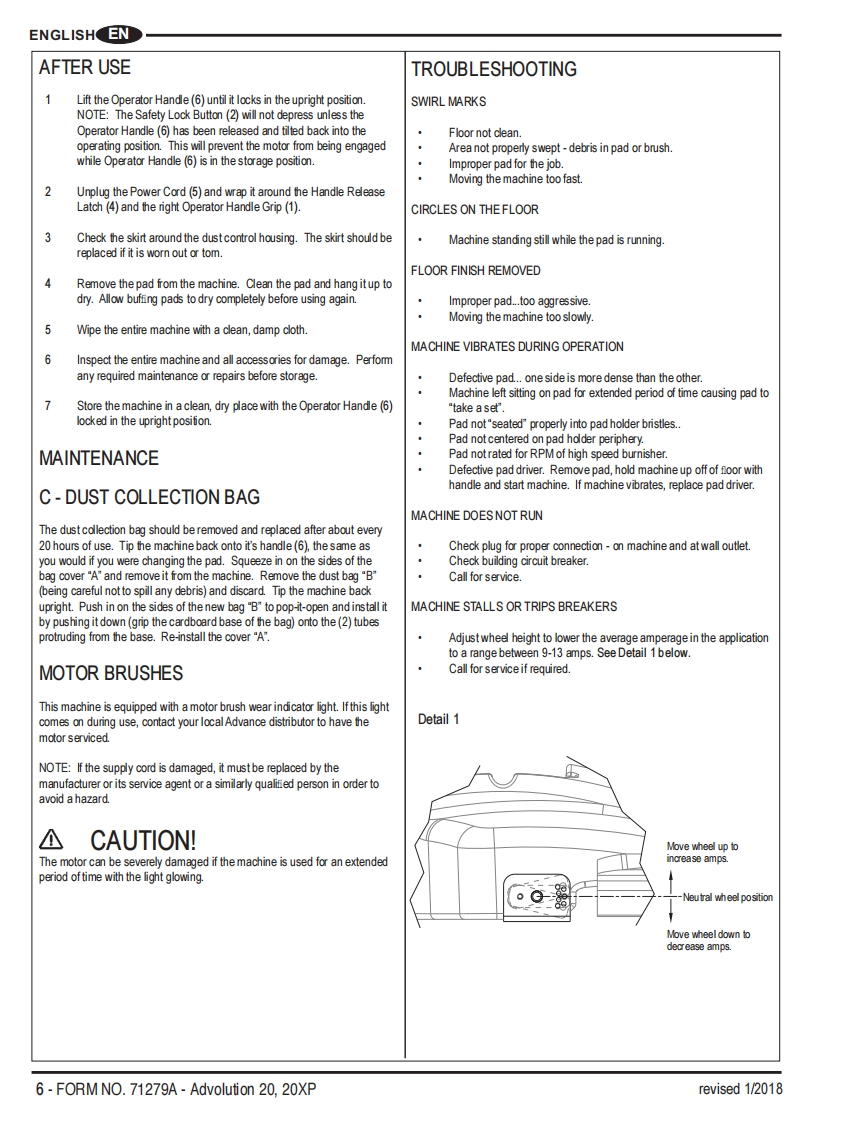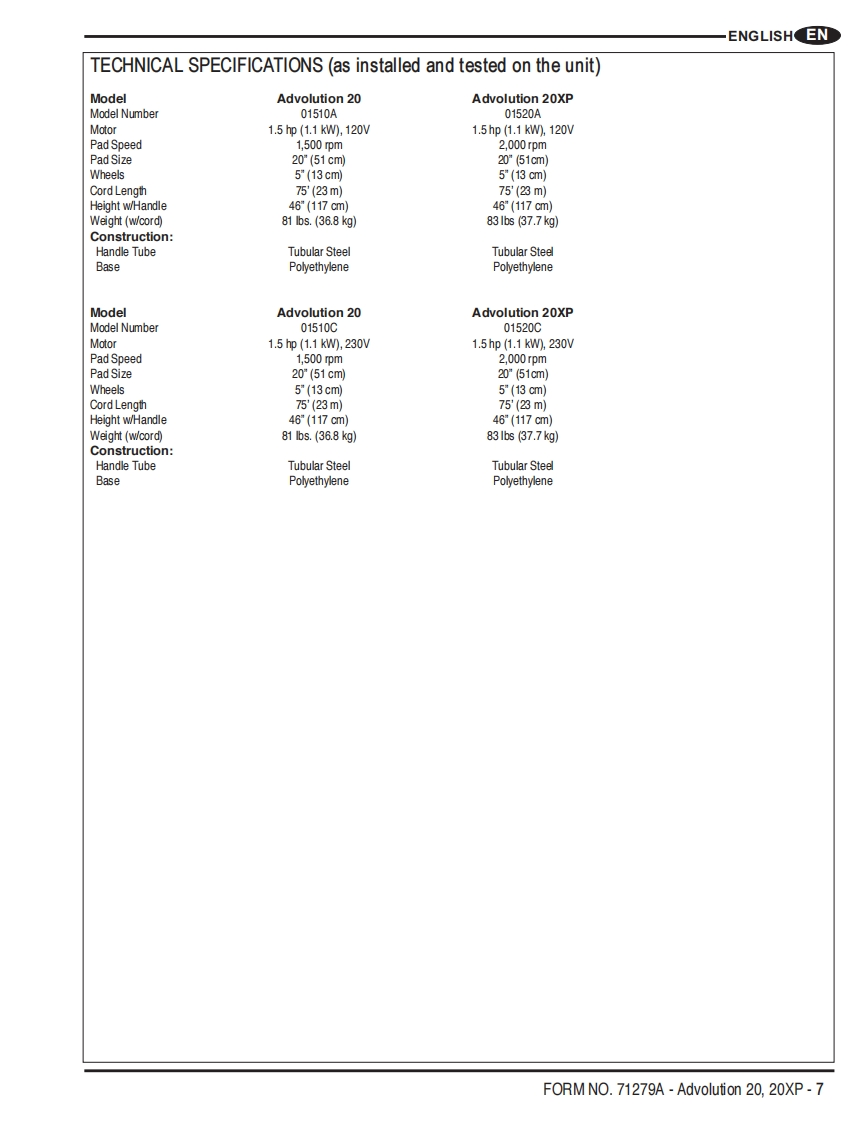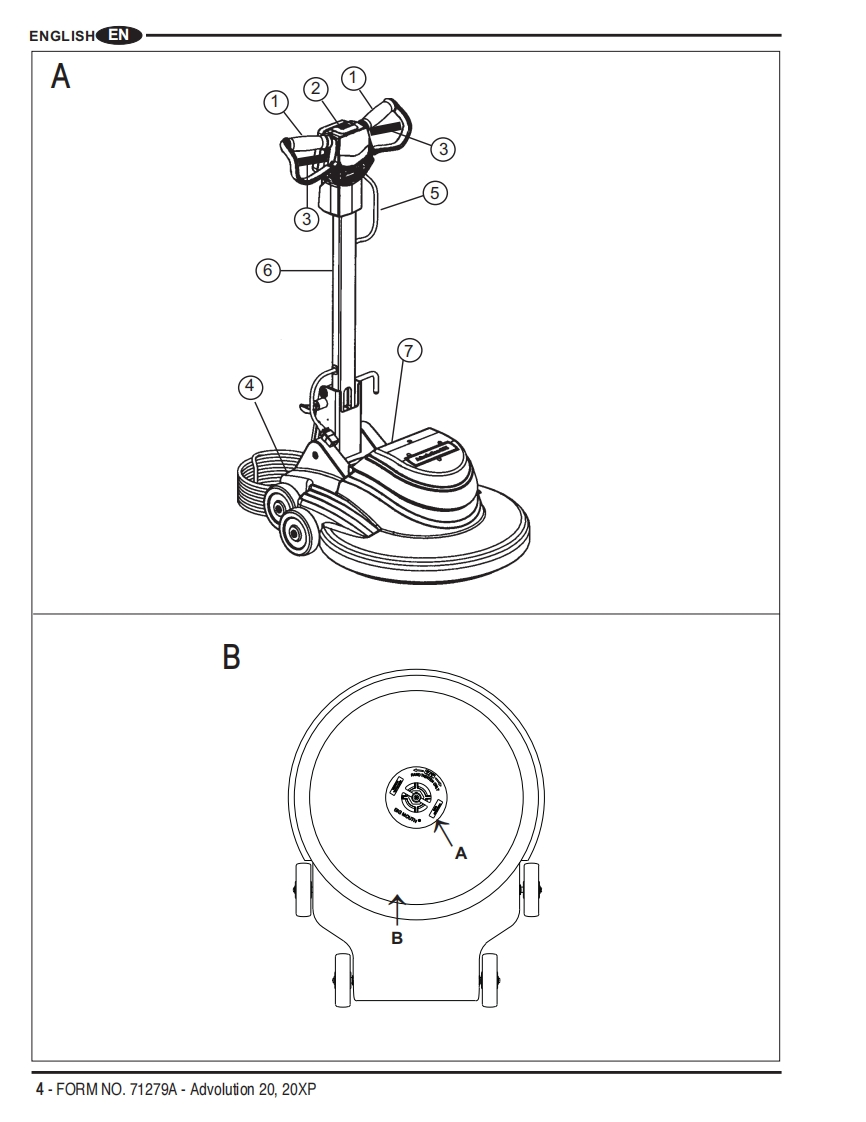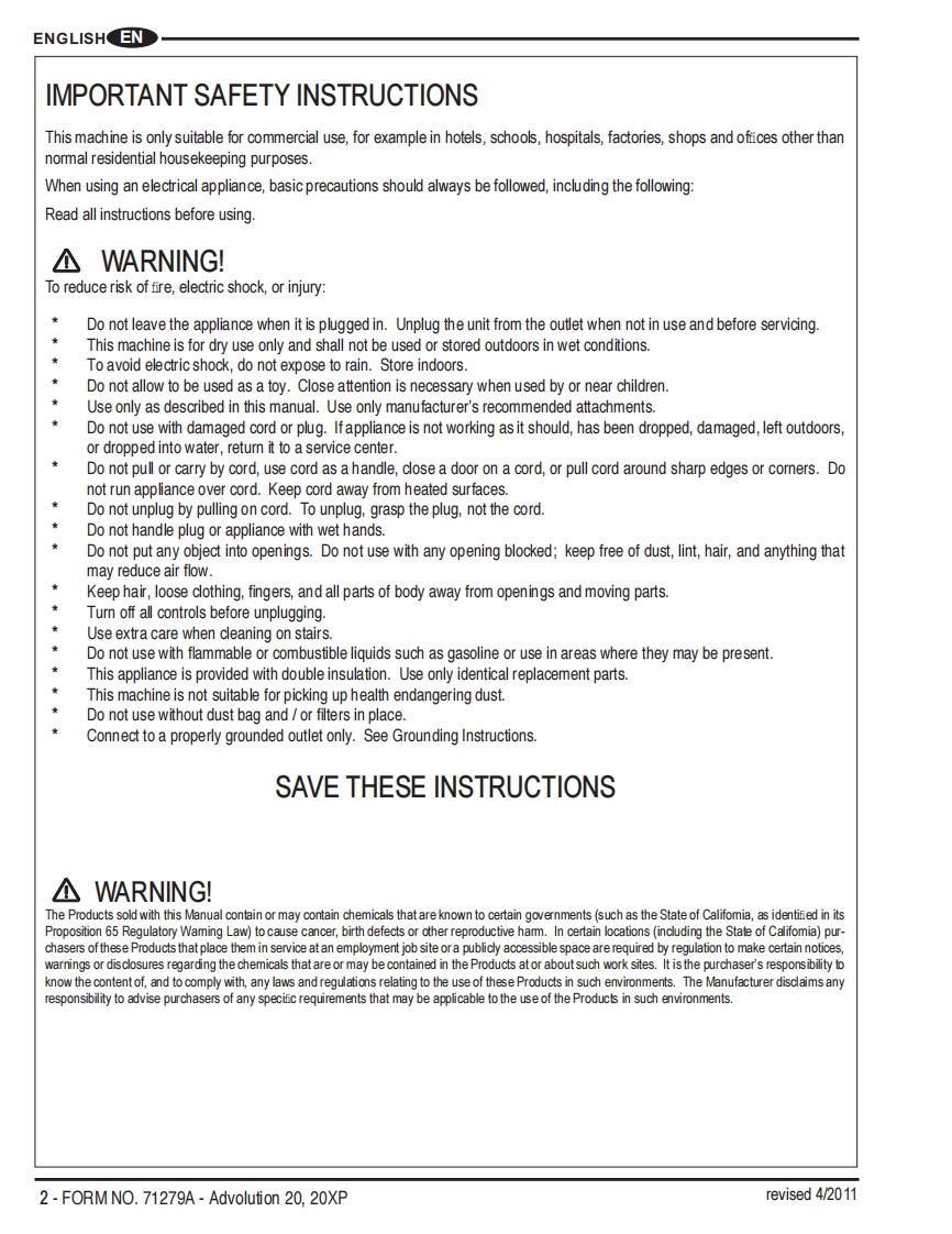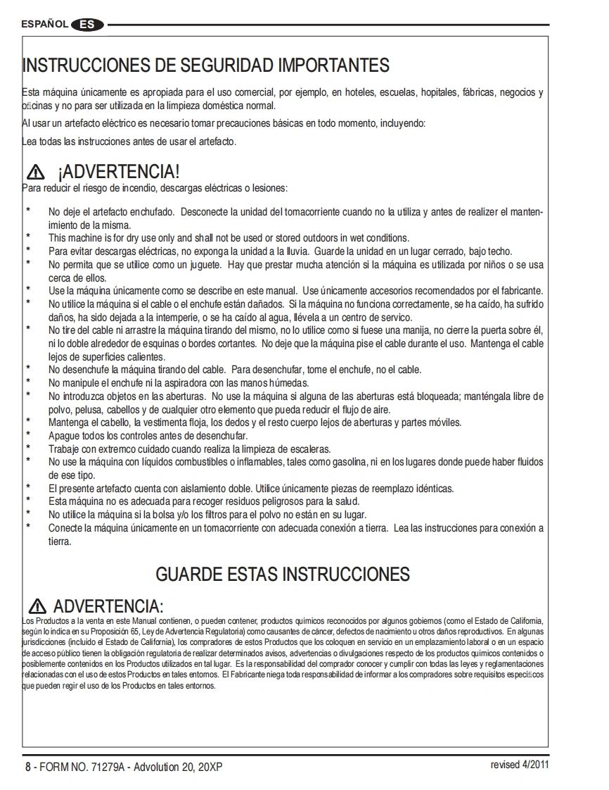 Advolution 20,Advolution 20XPInstructions for use and Parts ListInstructions for Use and Parts ListInstrucciones de uso y lista de piezasMode d'emploi et liste des pieces6/2007 revised 1/2018 REV HENEnglish (2-7)Form no.71279AES Espanol (8-13)FR Francais(14-19)PARTS LIST(21 -27)Advance Models:01510A20)01520A20XP)@Obsolete Models01510C20)01520C(20XP)®Advanceby Nilfisk
