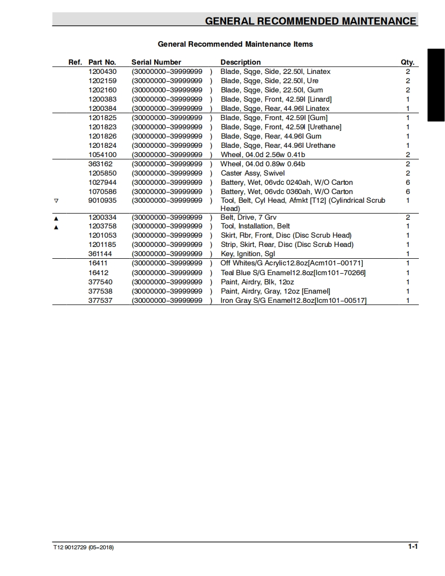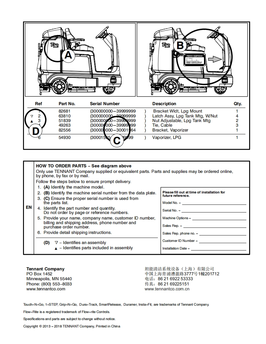 TENNANTT12(Battery)Rider ScrubberParts ManualMachine Serial Number Range(S/N30000000-39999999)The Safe Scrubbing AlternativeTennantTrue®PartsIRIS a Tennant TechnologyInsta-Fit~AdapterAn ORBIO TechnologyNorth America International /Japan9012729姆For the latest parts manuals and otherRev.07(05-2018)language Operator manuals,visit:▣www.tennantco.com/manuals