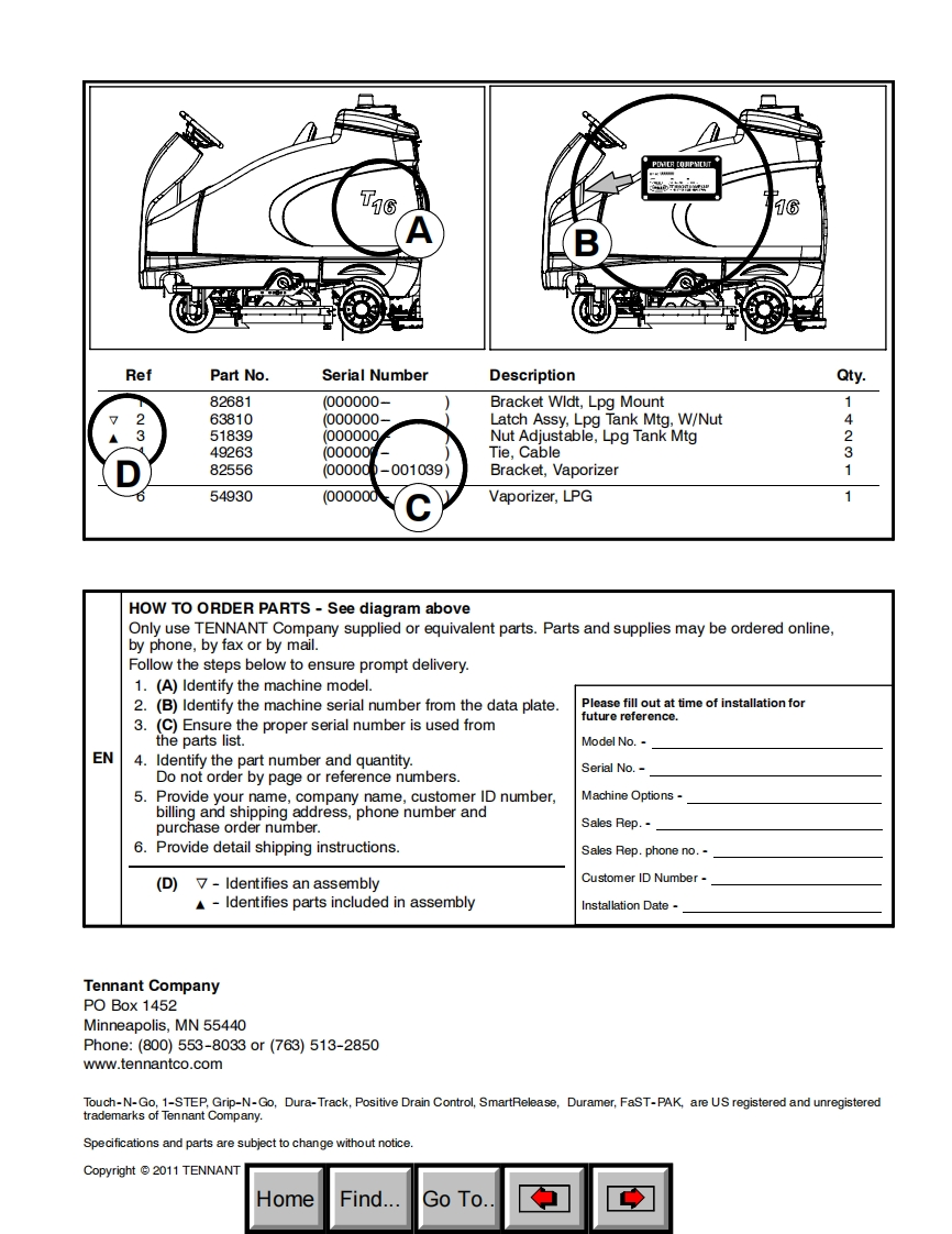 TENNANT16(Battery)Rider ScrubberParts Manual印6H2Foam Scrubbing TechnologyAn ORBIC TechnulogyThe Safe Scrubbing AlternativeHygenic Fully Cleanable TanksES Extended Scrub SystemNorth America International9008148Rev.01(3-2011)www.tennantco.comHomeFind...Go To.