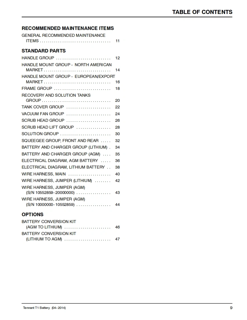 TENNANTT1Battery Floor Scrubber(S/N10000000-20000000)Parts ManualModels9008635-T1,AGM Battery (North America)9008636-T1,AGM Battery (Europe/Export)9008638-T1,Lithium-ion Battery (North America)9008639-T1,Lithium-ion Battery (Europe/Export)For the latest Parts manuals and otherlanguage Operator manuals,visit:www.tennantco.com/manualsNorth America /International9008615ReV.03(03-2016)www.tennantco.com