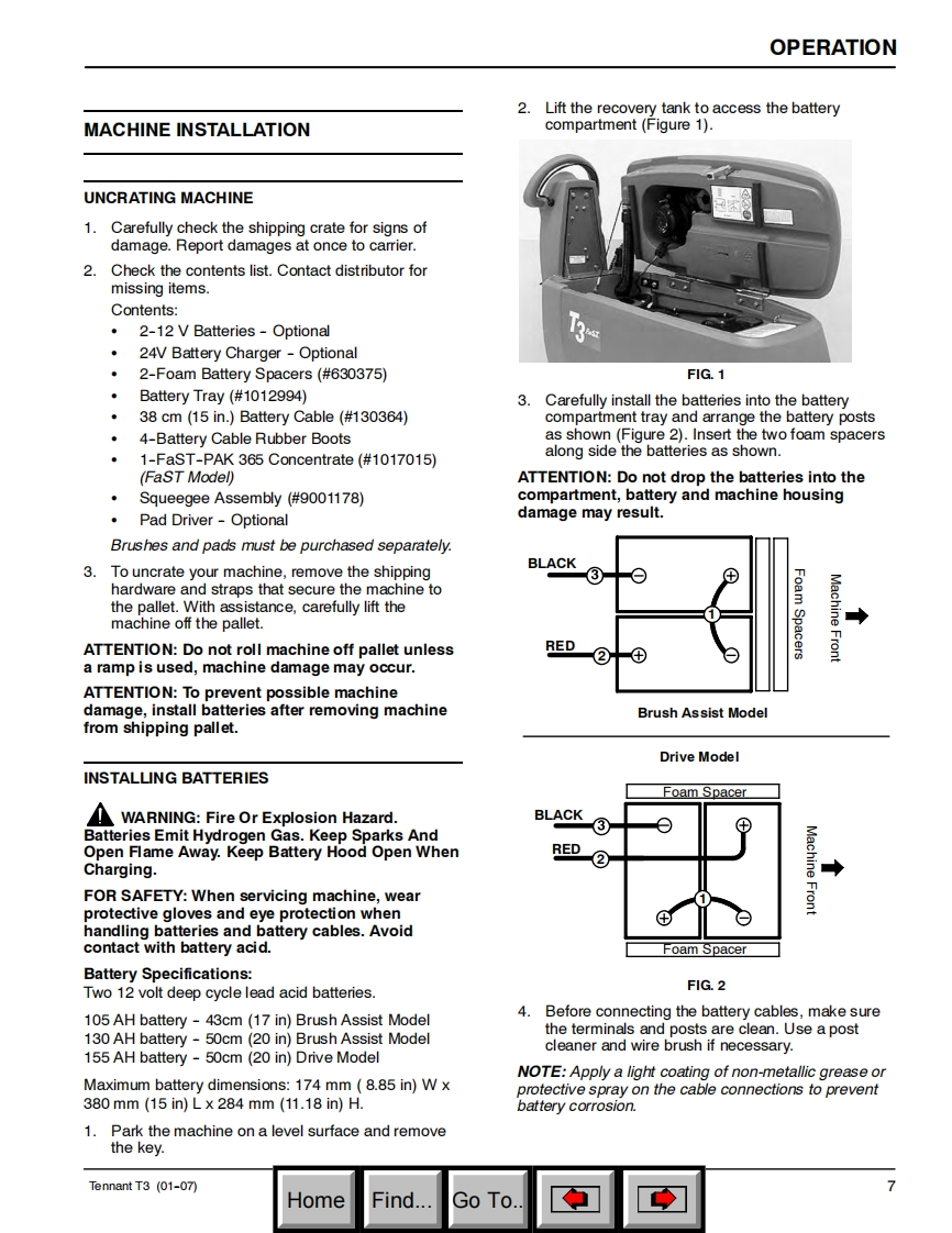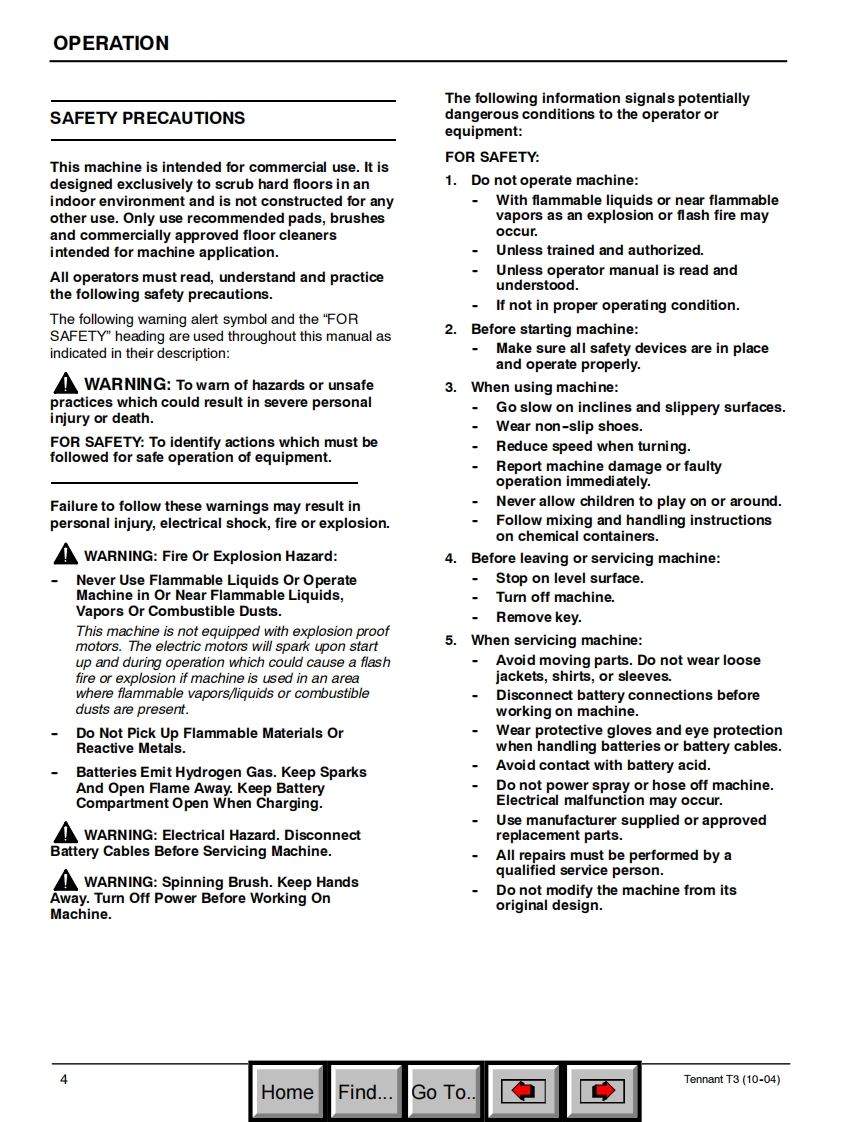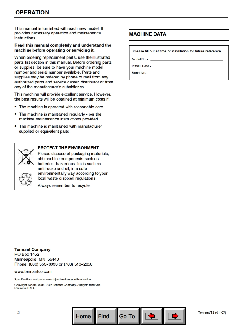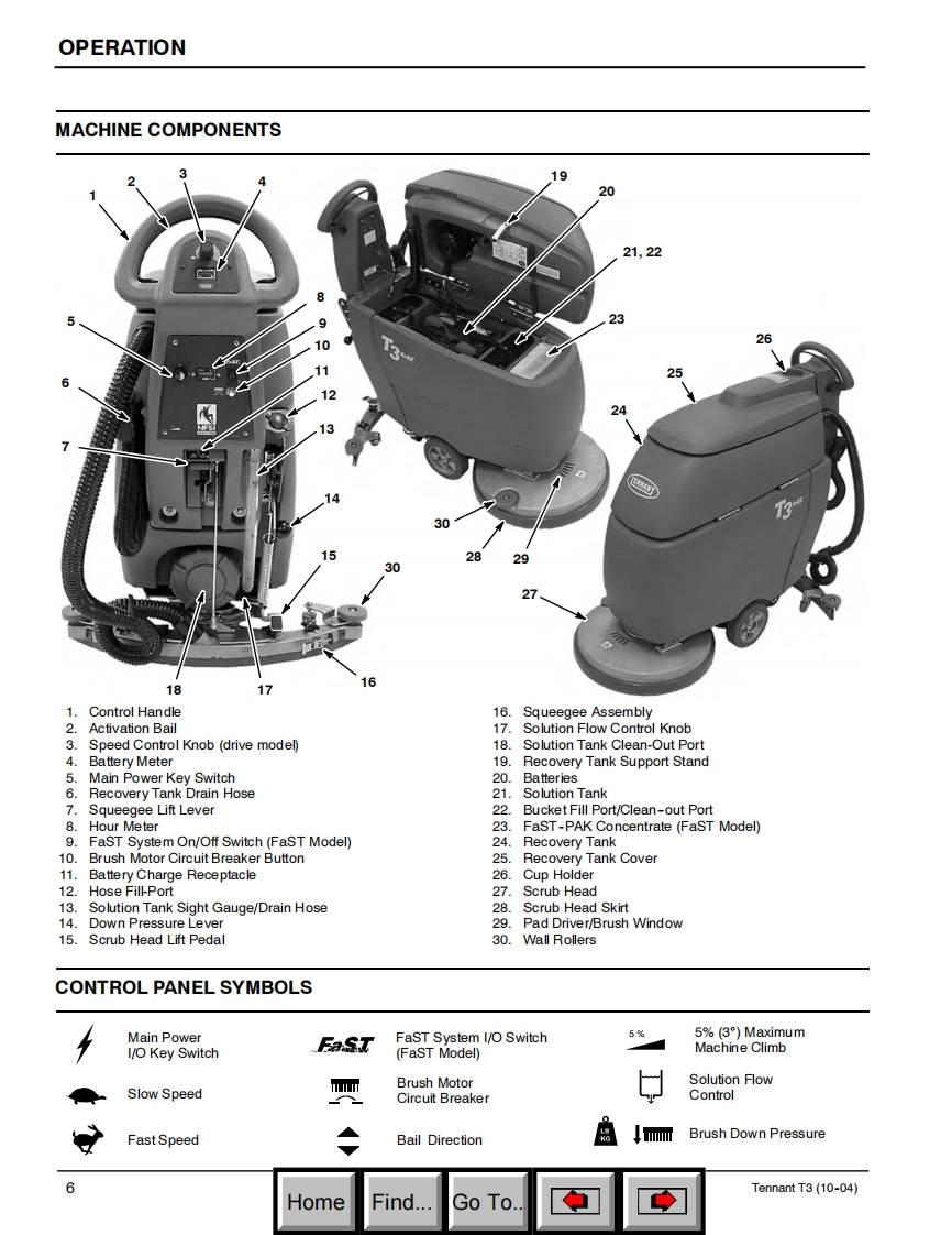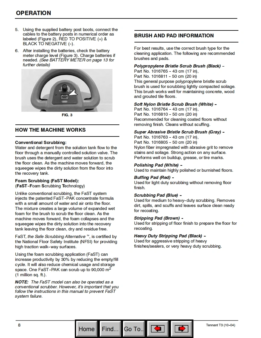 ENGUSH-ESPANOL-FRANCAISTENNANT(S/N00000000-10309874)T3Scrubber-DryerFregadora-SecadoraBrosseuse-SecheuseOperator and Parts ManualManual De OperadorY Lista De RepuestosOperateur Manuel etListe Des PiecesEaSTFoam Scrubbing TechnologyThe Safe Scrubbing AlternativeHygenic Fully Cleanable Tanks614343Rev.06(01-2007)www.tennantco.comHomeFind..Go To.