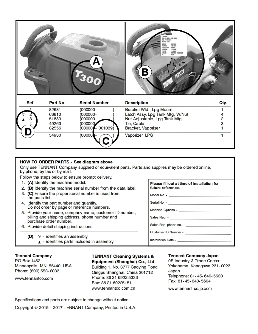 TENNANTT300Automatic Floor ScrubberParts Manual(S/N10000000-20000000)Hygenic Fully Cleanable Recovery TankTennantTrue®PartsIRISR a Tennant TechnologyH2NanoClean▣i▣For the latest Parts manuals and otherlanguage Operator manuals,visit:音饱www.tennantco.com/manualsNorth America /International9014500ReV.05(03-2017)www.tennantco.com