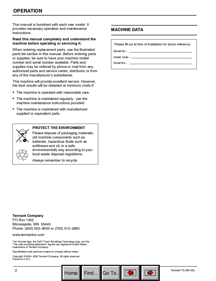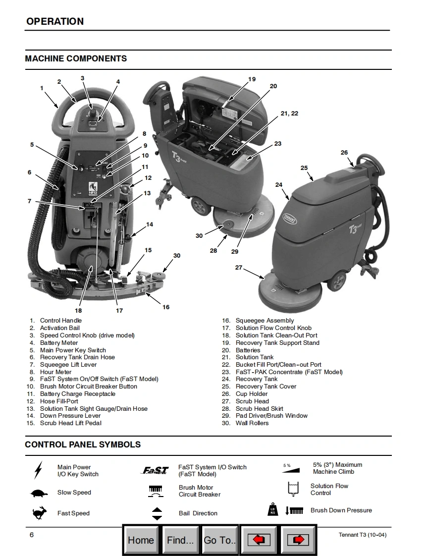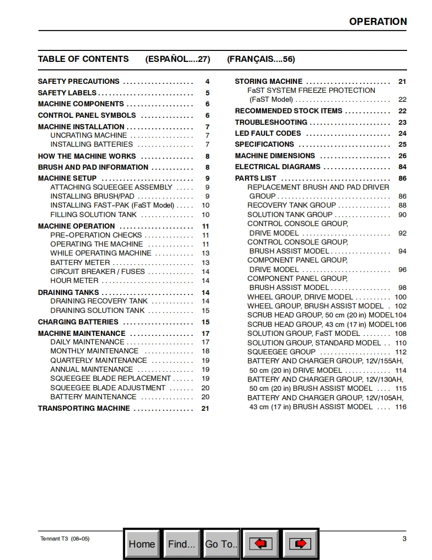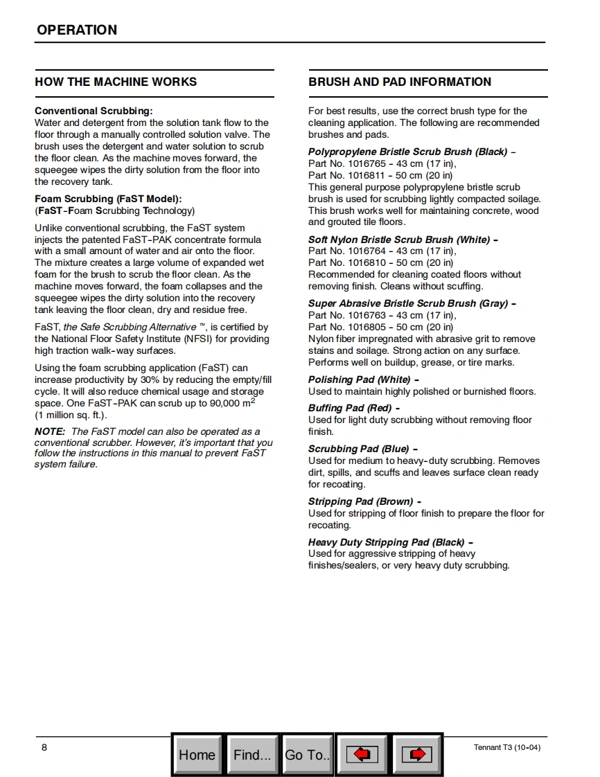 ENGLISH-ESPANOL-FRANCAIS®TENNANTT3Foam Scrubbing TechnologyScrubber-DryerThe safe scrubbing alternativeFregadora-SecadoraHygenicTFully cleanable TanksBrosseuse-SecheuseModel Part No.:Operator and Parts Manual9000941-43 cm(17 in)Brush Assist Model9000942-43 cm(17 in)Brush Assist,FaST ModelManual De Operador9000943-50 cm(20 in)Brush Assist ModelY Lista De Repuestos9001450-50 cm(20 in)Brush Assist Model-Polybrush9000944-50 cm(20 in)Brush Assist,FaST ModelOperateur Manuel et9000945-50 cm(20 in)Drive ModelListe Des Pieces9000946-50 cm(20 in)Drive,FaST Model9000947-43 cm(17 in)Brush Assist Model-Export9000948-43 cm(17 in)Brush Assist,FaST Model-Export9000949-50 cm(20 in)Brush Assist Model-Export9000950-50 cm(20 in)Brush Assist,FaST Model-Export9000951-50 cm(20 in)Drive Model-Export9000952-50 cm(20 in)Drive,FaST Model-Export614343Rev.05(10-05)HomeFind...Go To