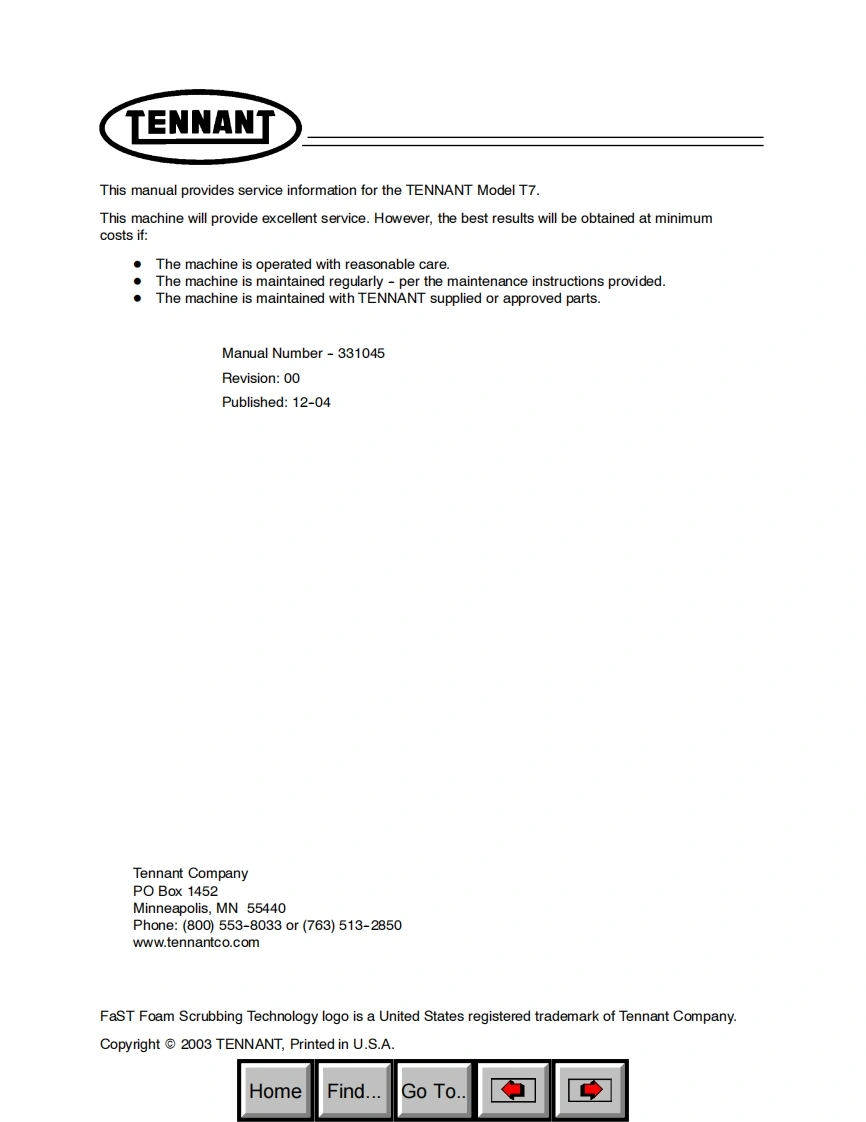 TENNANT-T7操作与维修手册含电器原理图找手册网17天前发布关注私信1.18MB48页036TENNANT-T7操作与维修手册含电器原理图此内容为付费资源,请付费后查看¥19¥21黄金会员免费钻石会员免费登录购买付费资源 第1页 / 共48页 第2页 / 共48页 第3页 / 共48页 第4页 / 共48页 第5页 / 共48页 第6页 / 共48页 第7页 / 共48页 第8页 / 共48页 第9页 / 共48页 第10页 / 共48页 试读已结束,还剩38页,您可下载完整版后进行离线阅读 THE ENDTENNANT(坦能) 文本预览 TENNANTFeaturinga。T7ServiceFoam Scrubbing TechnologyThe safe scrubbing alternativeInformationHygenic "Fully Cleanable Tanks331045Rev.00HomeFind...Go To. 查看更多 收起部分 喜欢就支持一下吧收藏