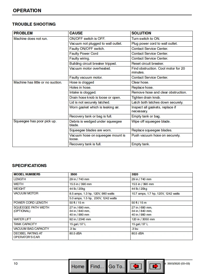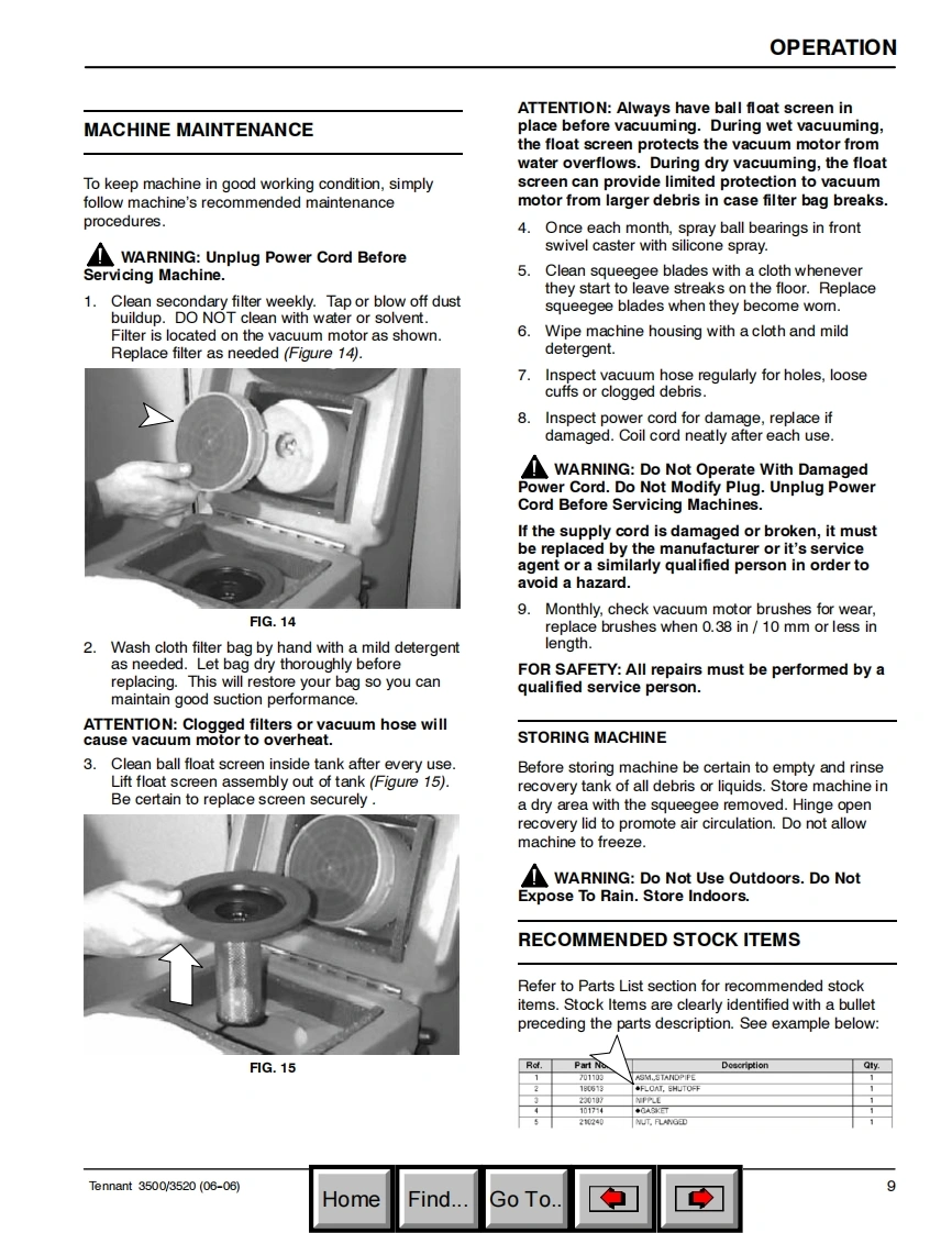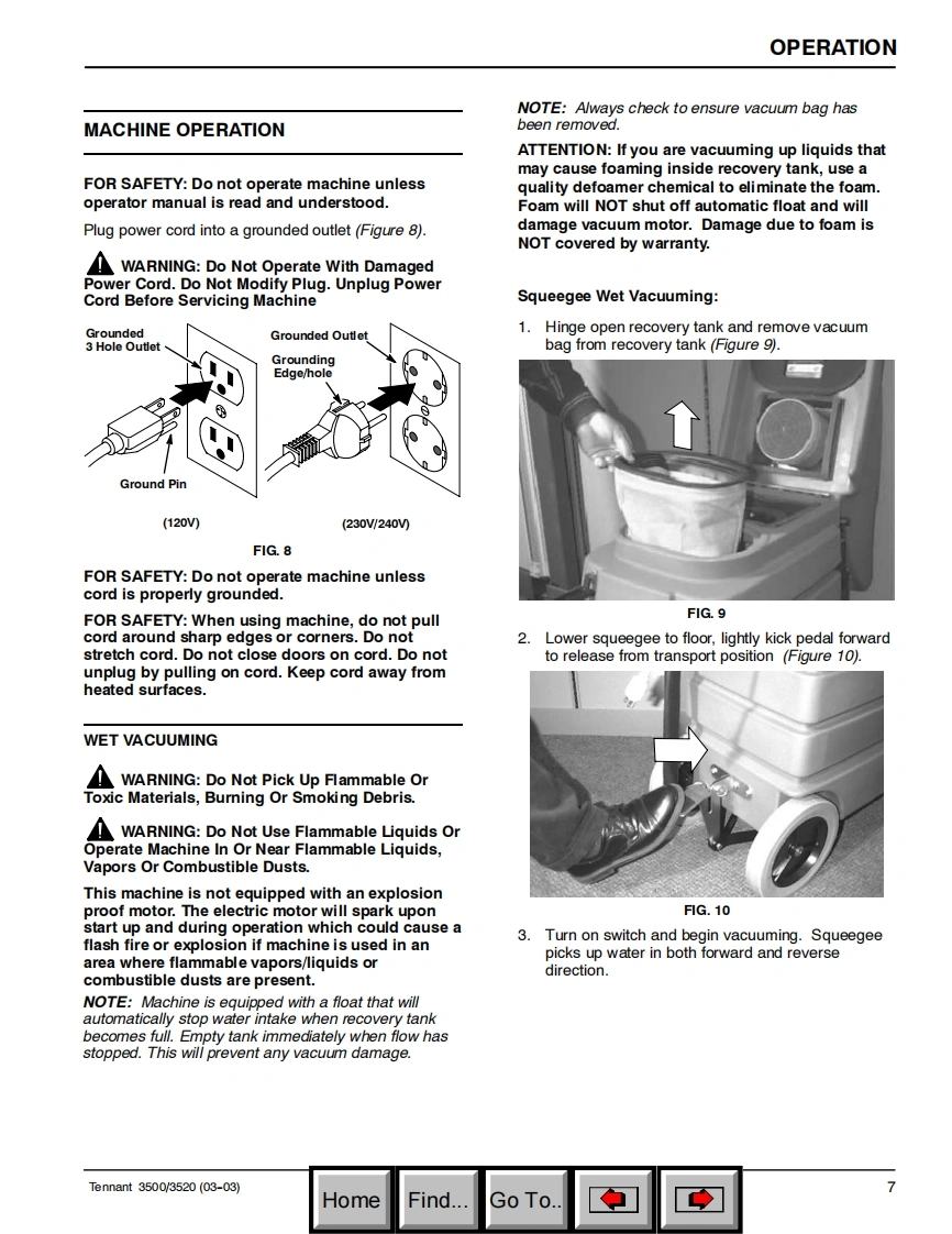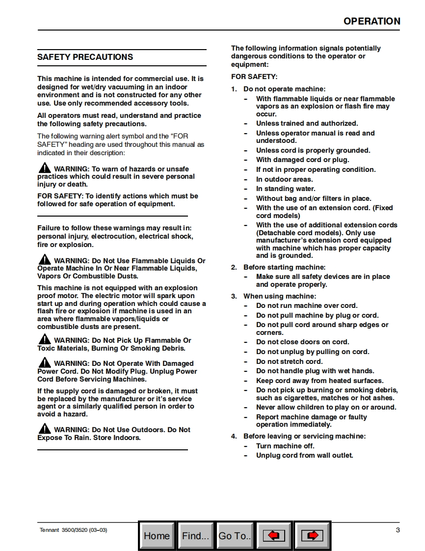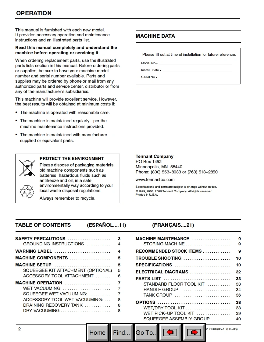 ENGUSH-ESPANOL-FRANCAISTENNANT3500/3520Wet/Dry VacuumAspirador Para Liquidos y En SecoAspirateur a sec/humideOperator and Parts ManualManual De OperadorY Lista De RepuestosOperateur Manuel etListe Des Pieces0Model Part No.:607673-3500120V607674-3520120W609421-3500230W609683-3500230VEMC613746-3500220V607672ReV.02(06-2006)www.tennantco.comHomeFind...Go To