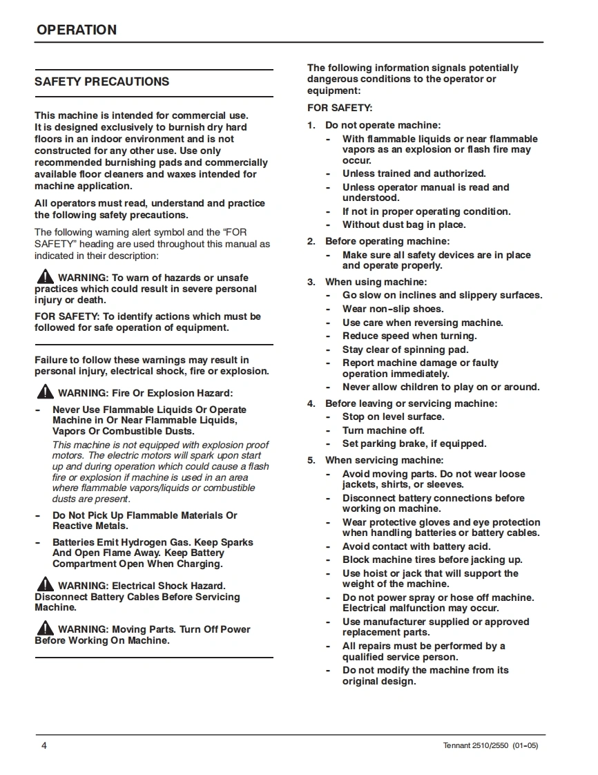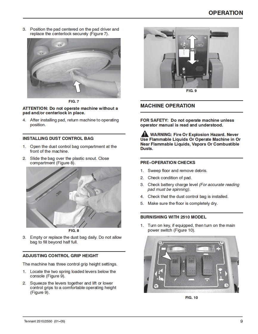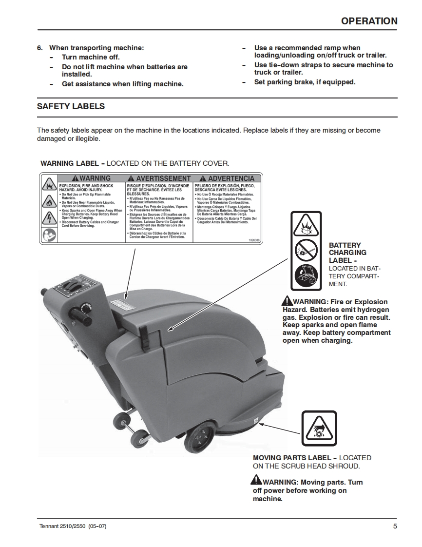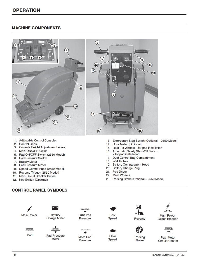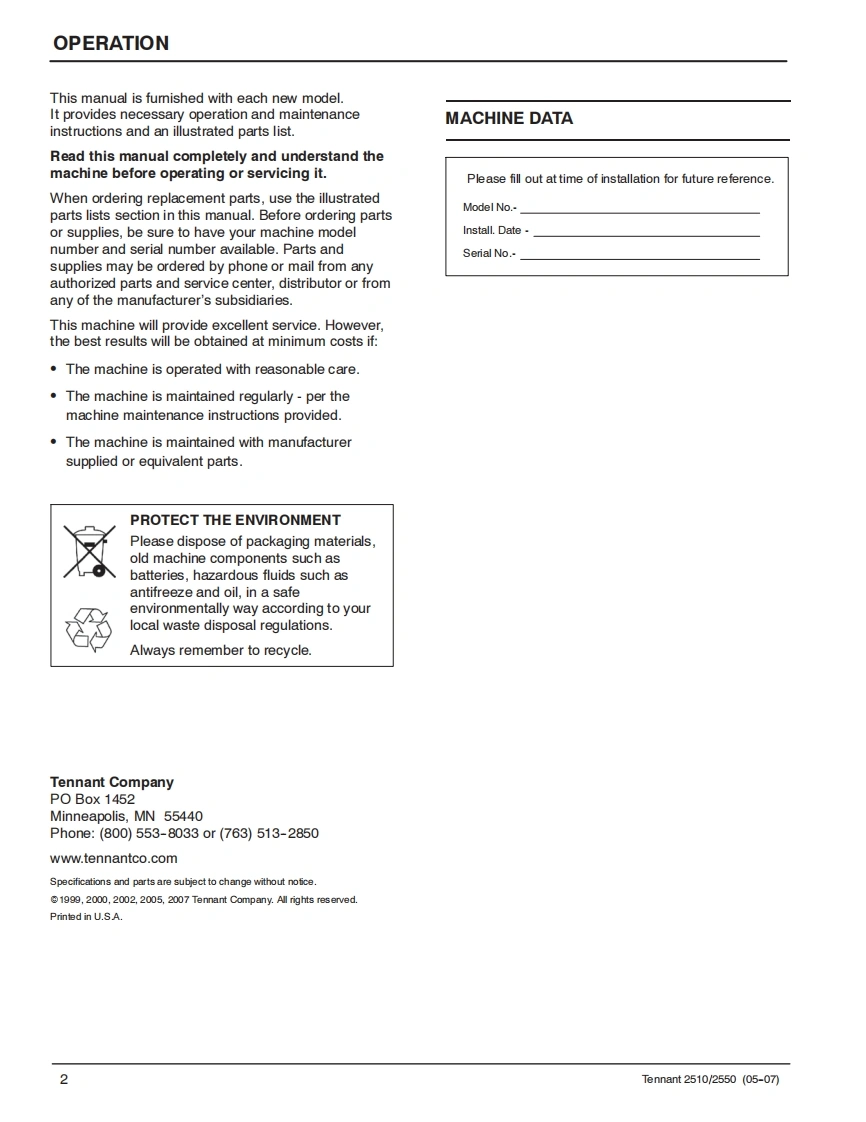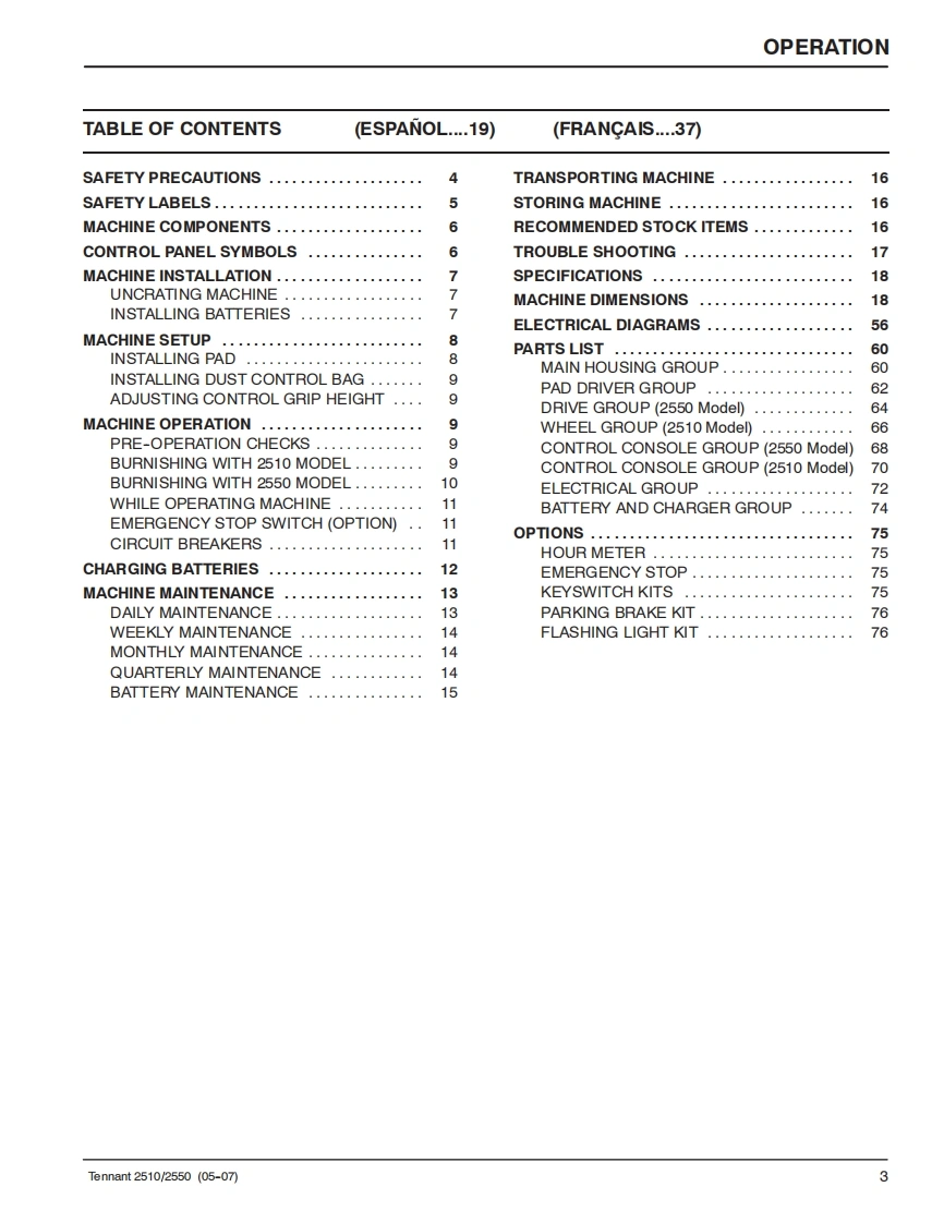 ENGUSH-ESPANOL-FRANCAISTENNANT2510/255036 Volt Dust Control BurnisherPulidora con control de polvo de 36VMachine a polir a systeme de controle dela poussiere de 36VOperator and Parts ManualManual De OperadorY Lista De RepuestosOperateur Manuel etListe Des PiecesModel Part No.:607598-2510607599-2510Pac610688-2510Can.Pac607595-2550607596-2550Pac610687-2550Can.Pac607597Re.04(05-2007)www.tennantco.com