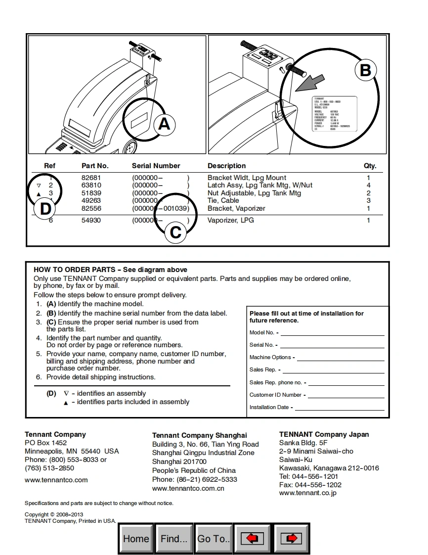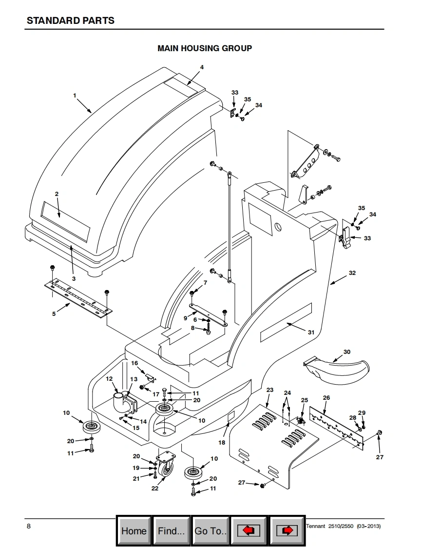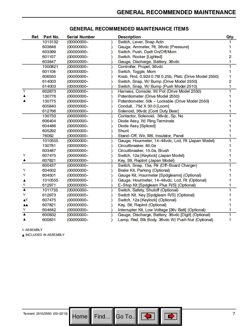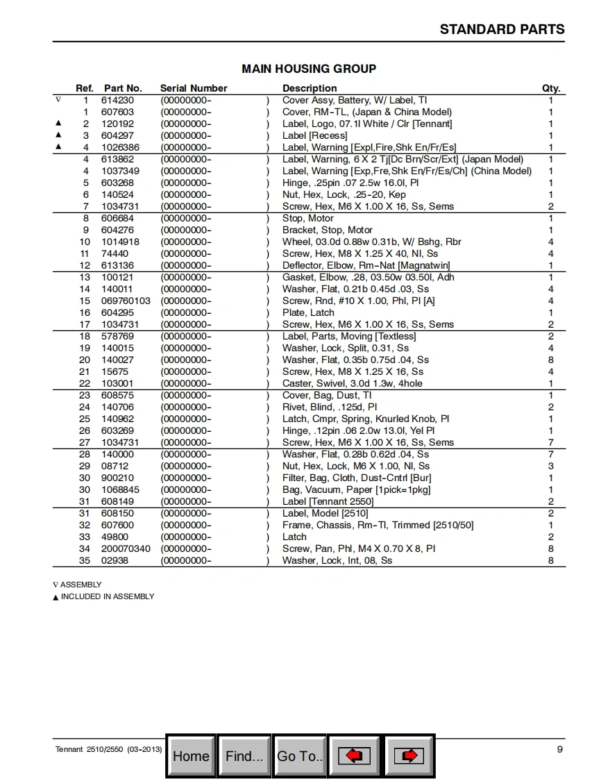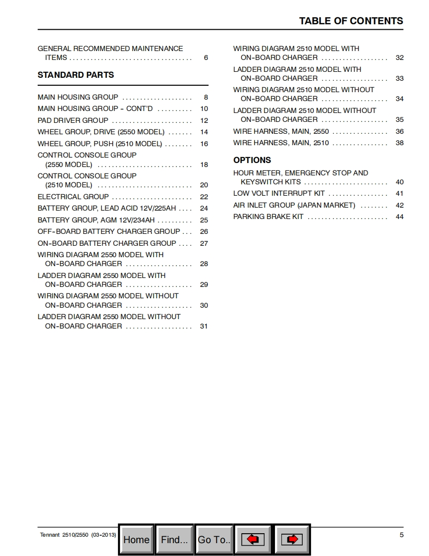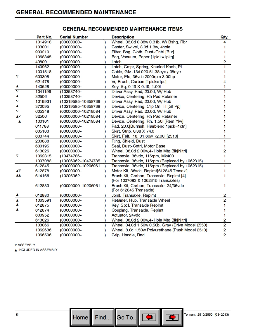 0TENNANT2510/255036 Volt Dust Control BurnisherParts ManualModel Part No.:9003531-25109003532-2510 Complete9006168-2510 w/AGM Complete9006149-2510 China Model9003535-25509003536-2550 Complete9006170-2550 w/AGM Complete609180-2550 Japan Model▣h▣To view,.print or downloadthe latest manual,visit:5口安者www.tennantco.com/manualsNorth America /International9005432ReV.02(03-2013)www.tennantco.comHomeFind...Go To.