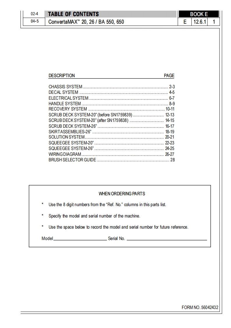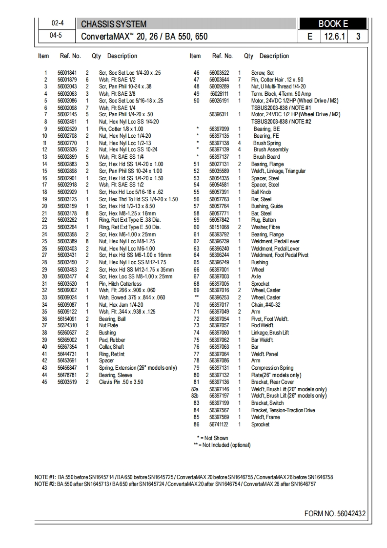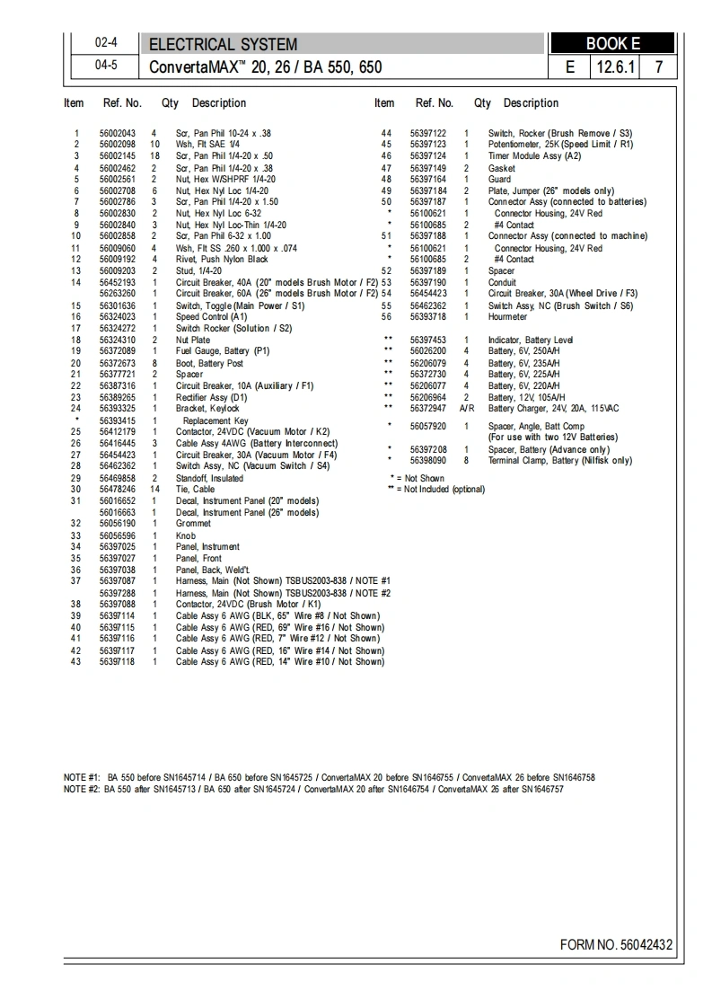 ConvertaMAXTM 20/26BA550/BA650令PARTS LISTAdvance M0DELS56397580,56397581Nilfisk M0DELS56397582,56397583ConvertaMAX 20 after SN1573666/ConvertaMAX 26 after SN1573671BA 550 after SN1573798/BA 650 after SN1573803NilfiskAdvance4/02 revised504F0RMN0.56042432setting standardsBOOK E SECTION 12.6.1