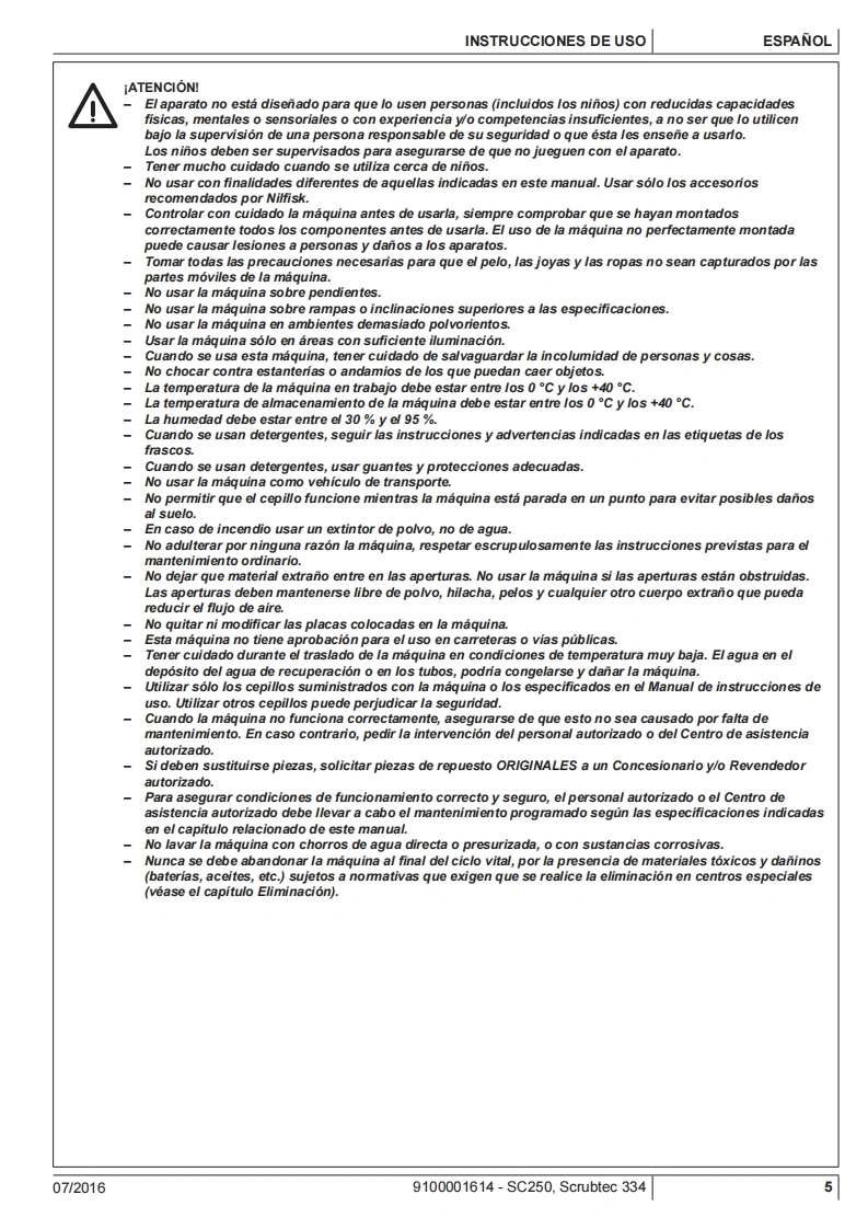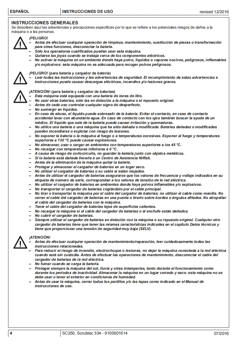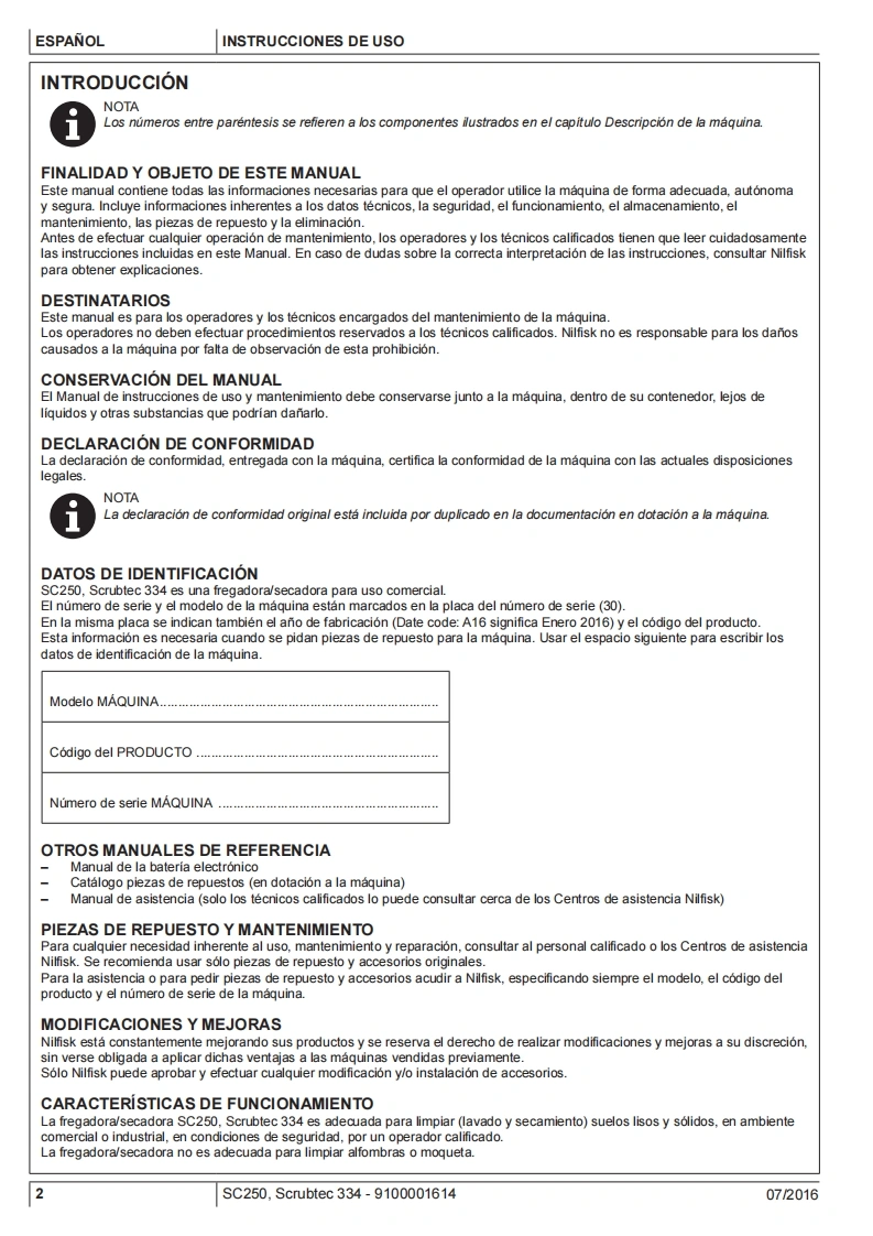 SC250,SCRUBTEC 334Instructions for useInstrucciones de usoOδnyiES xpnonsIstruzioni d'usoOriginal instructionsInstrucoes de uso07/2016 revised082017Espanol(E)EAAnvikd9100001614△的ItalianoPortugues日Model:9087380020.9087382020©Nilfisk