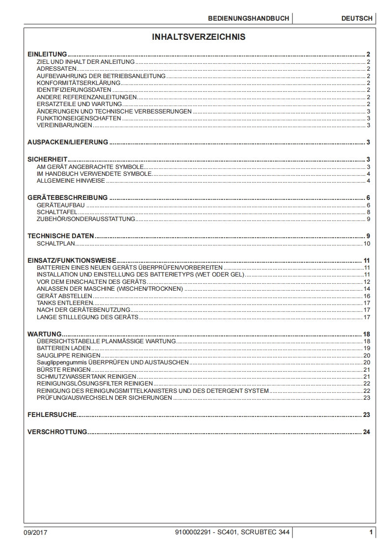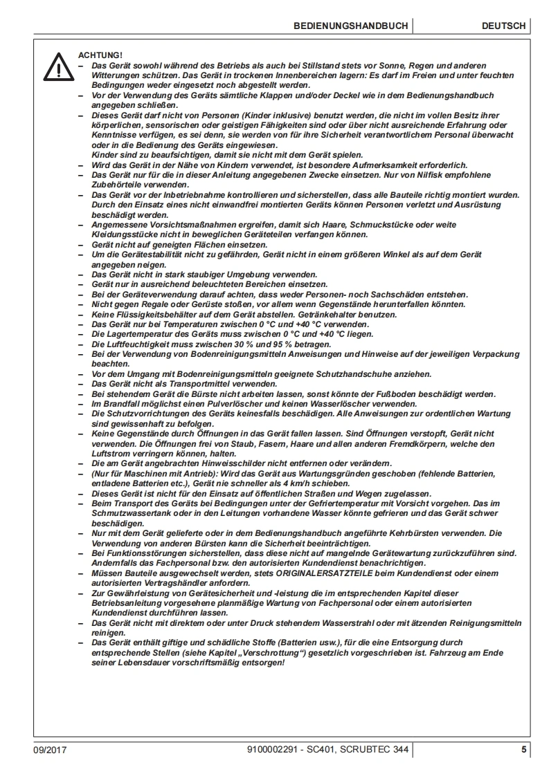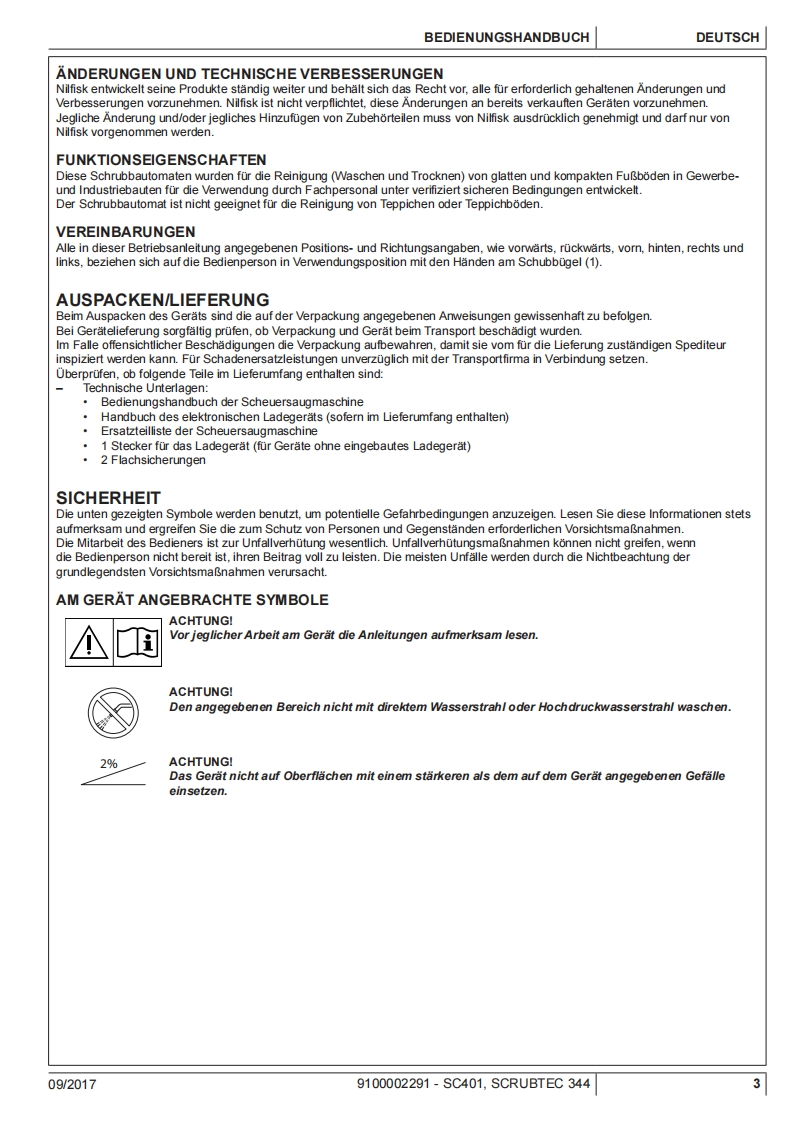 SC401,SCRUBTEC 344Instructions for useBedienungshandbuchInstructions d'utilisationInstructions for useGebruiksaanwijzing(€09/2017Deutsch(A)△画FrancaisEnglish9100002291Nederlands①Model No.:9087390020.9087391020.9087398020.9087393020,9087396020®Nilfisk