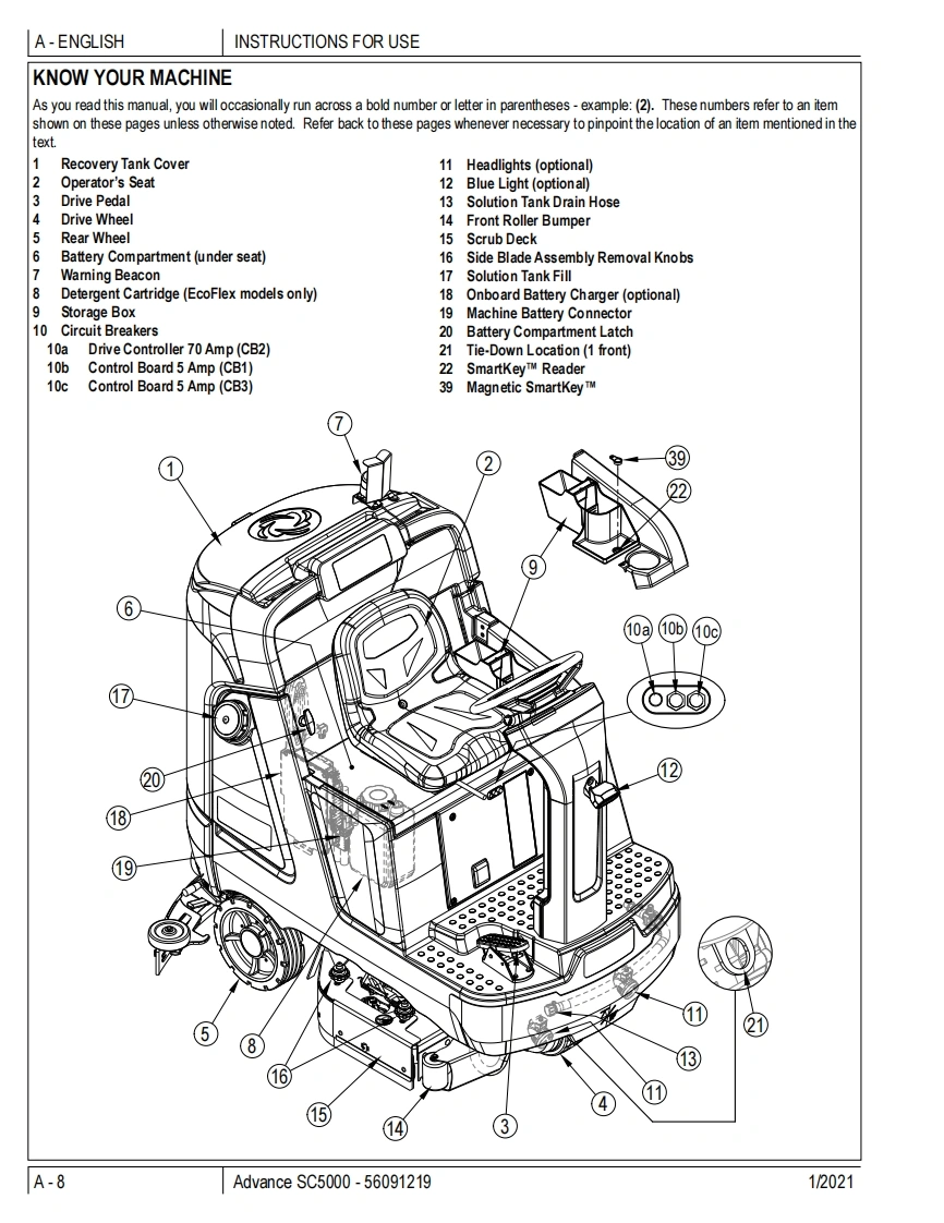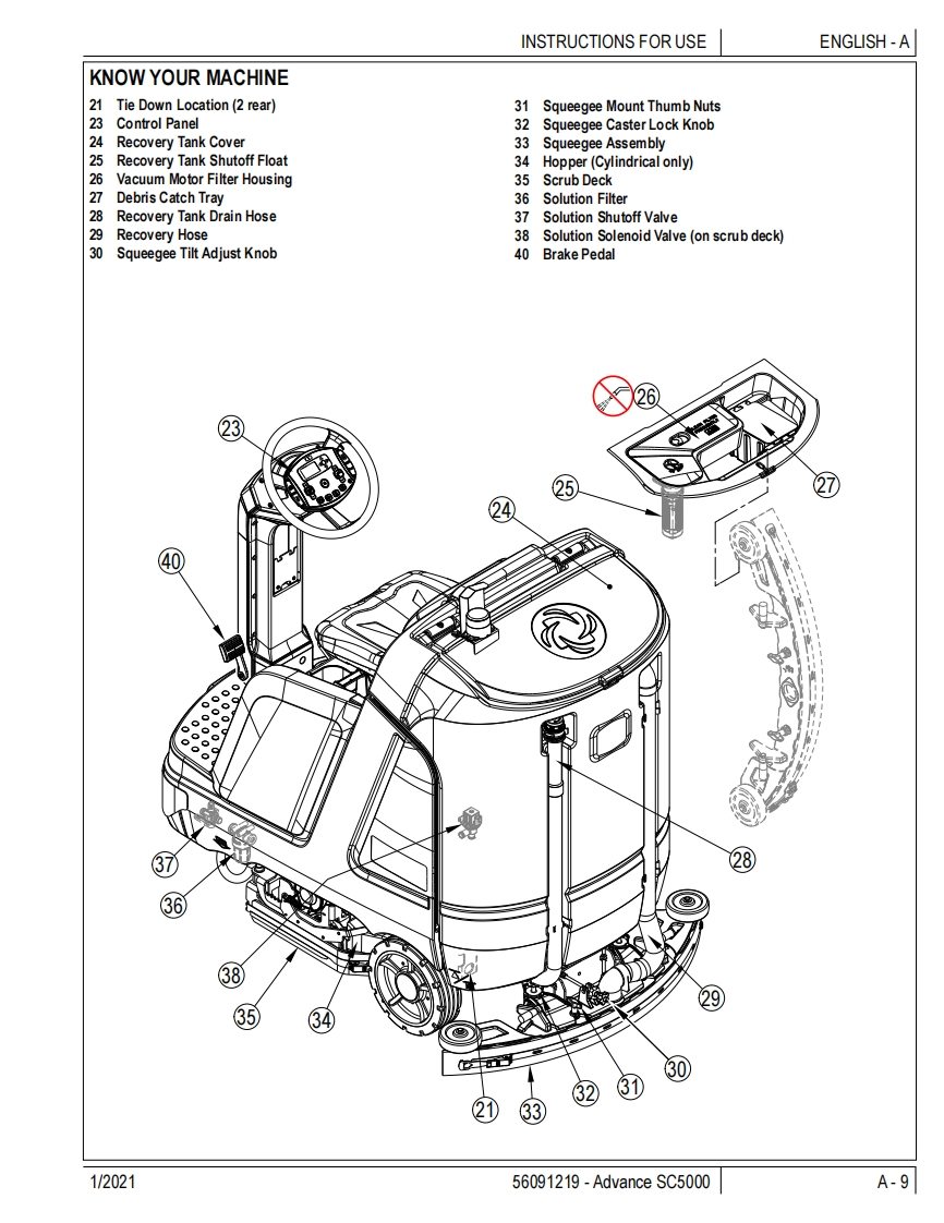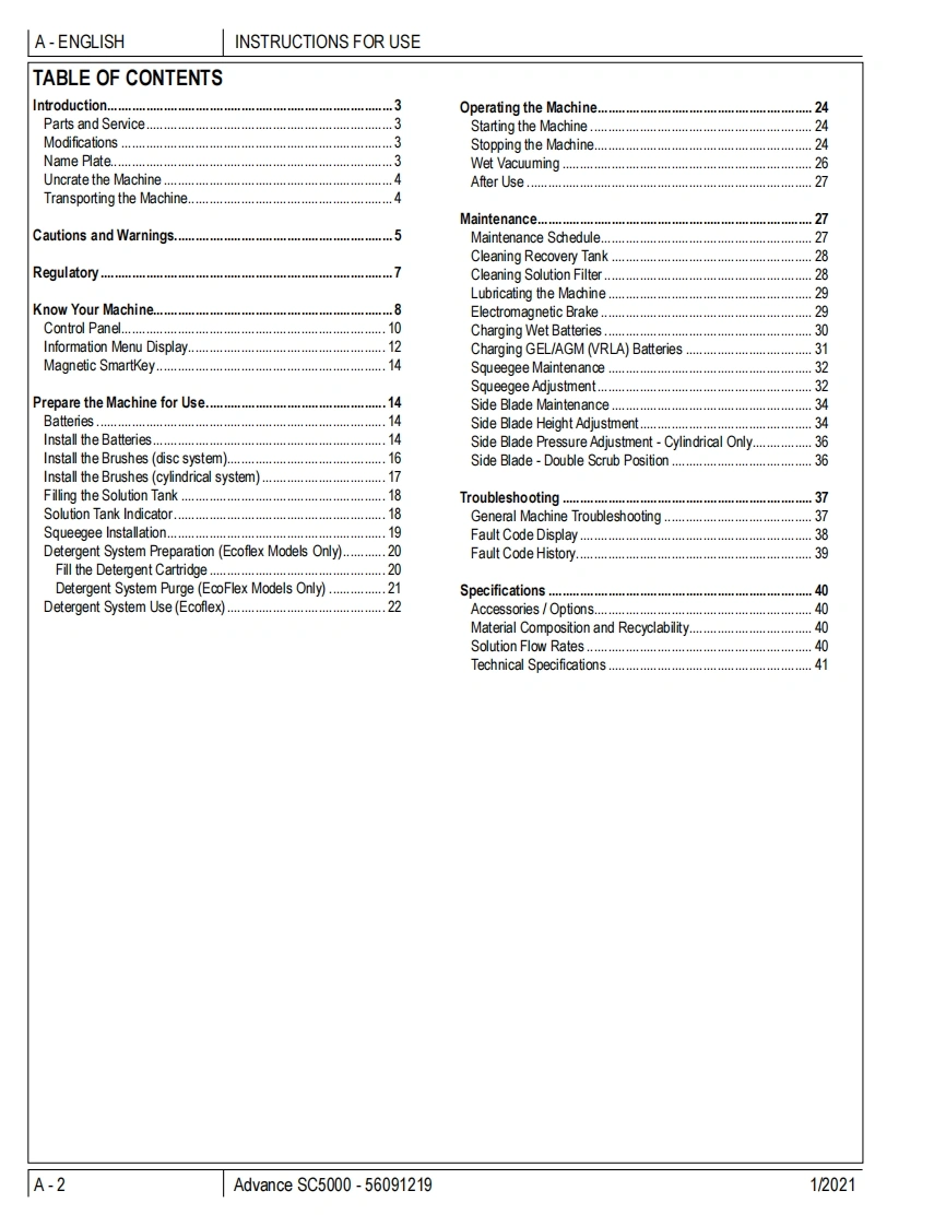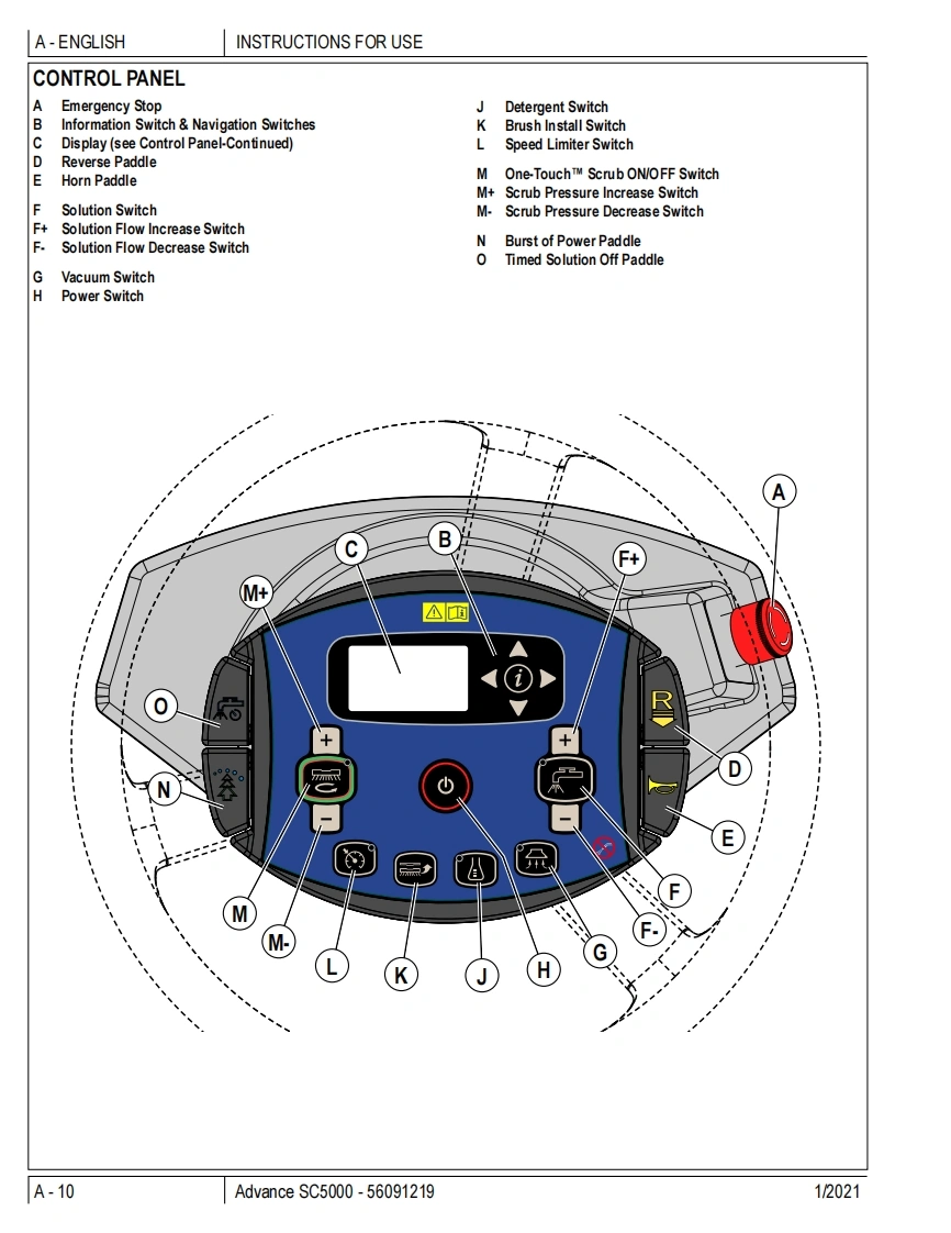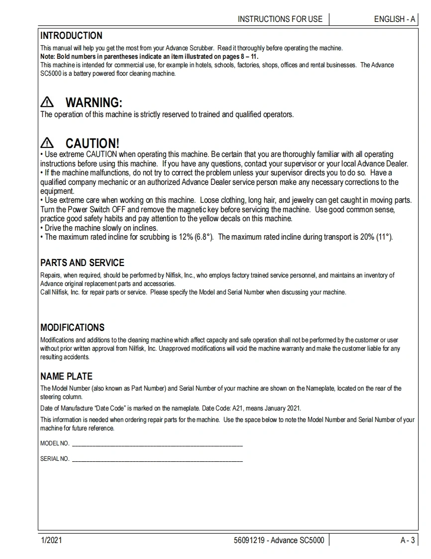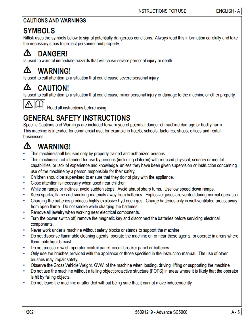 SC5000Instructions for UseInstructions for UseOriginal InstructionsInstrucciones de usoMode d'emploi1/2021REVA△四ecoflexA-EnglishForm no.56091219B-EspanolC-FrancaisModel No:56117001(34D),56117003(32C),56117004(36C)的WARNING:The operation of this machine is strictly reserved to trained and qualified operators.Advanceby Nilfisk