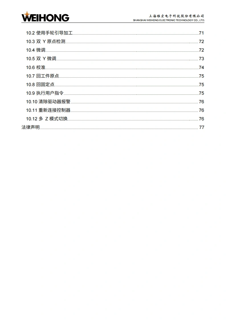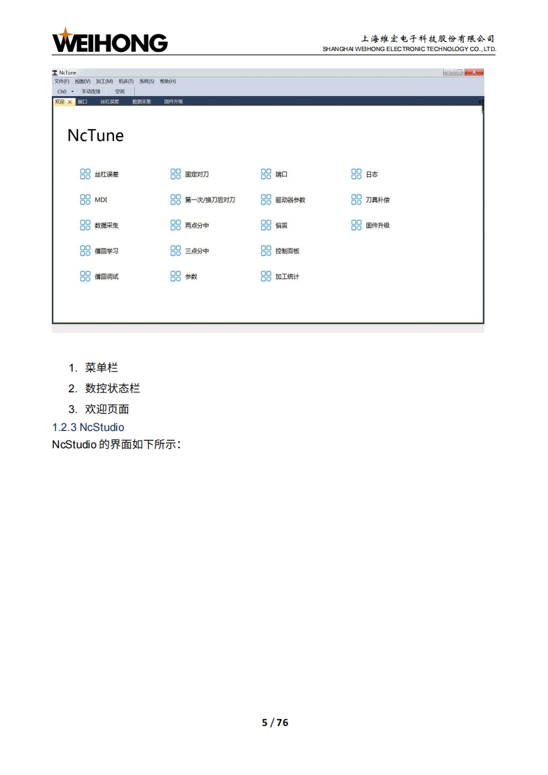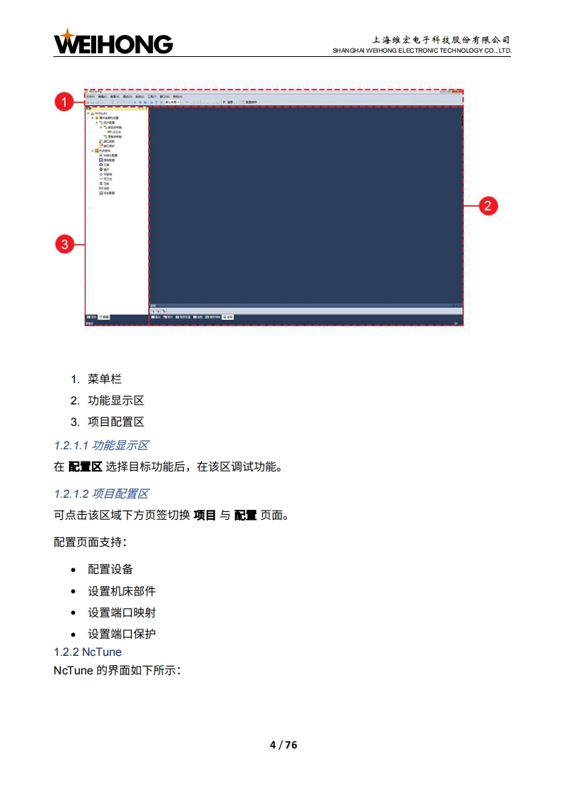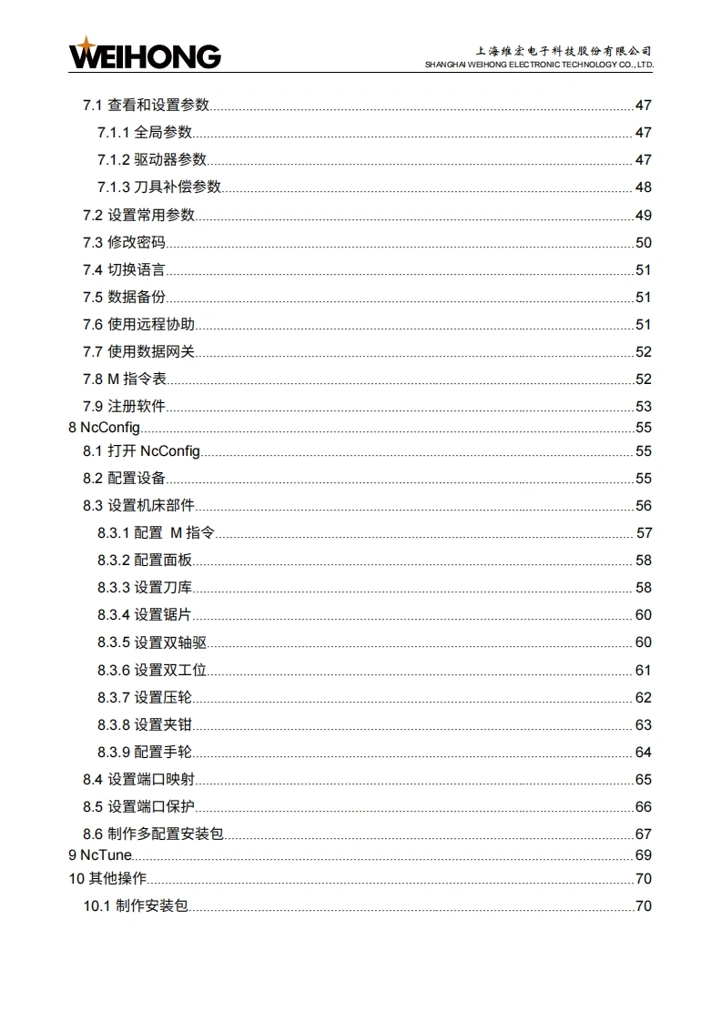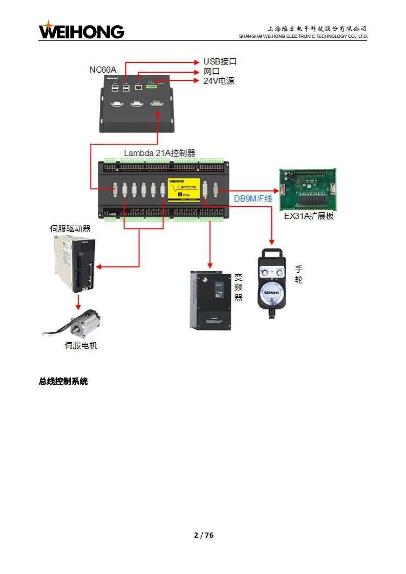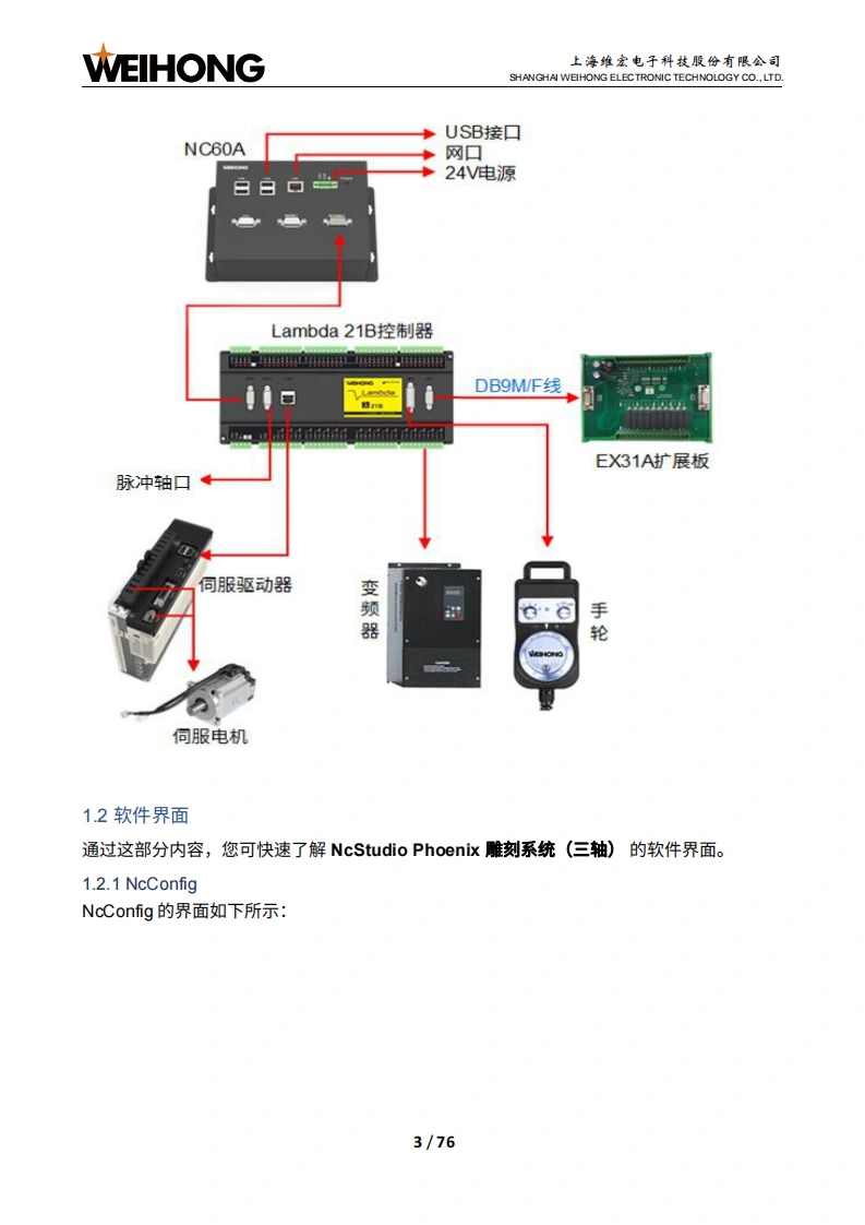 WEIHONG上海维宏电子科技股份有限公司SHANGHAI WEIHONG ELECTRONIC TECHNOLOGY CO.,LTD.NcStudio Phoenixⅸ木工三轴雕刻系统厂商手册版次:2021年07月28日第1版作者:产品应用测试部上海维宏电子科技股份有限公司版权所有▣目录1系统简介…..11.1硬件连接示意图1.2软件界面31.2.1 NcConfig1.2.2 NcTune..41.2.3 NcStudio.2接线,112.1硬件.112.1.1NC60A.112.1.2 Lambda控制器122.1.3EX31A.132.2面板电路接口172.3信号类型182.3.1开关量输入信号182.3.2继电器输出信号.192.3.3模拟量输出信号192.3.4指令脉冲信号193机床调试.213.1概述213.2安装软件213.3修改/O端口极性223.4设置调试参数23