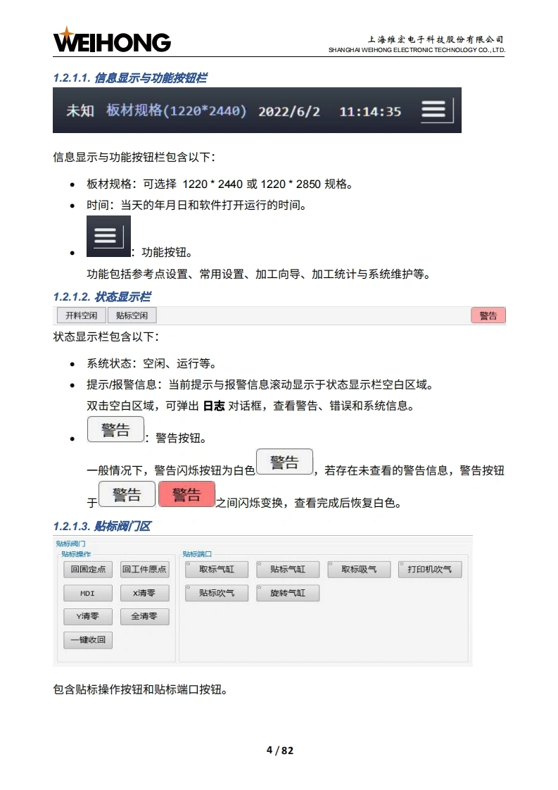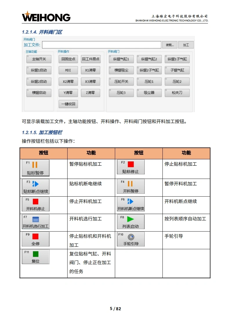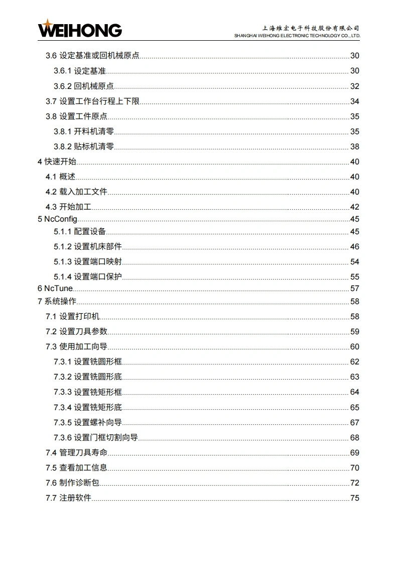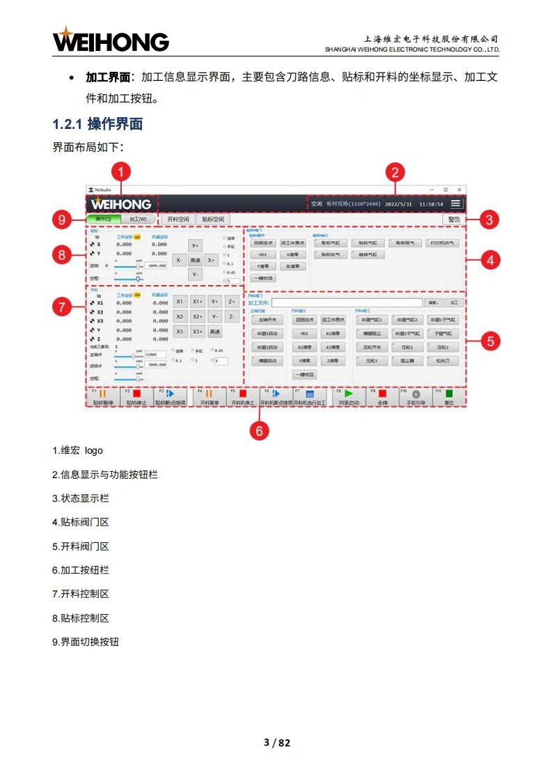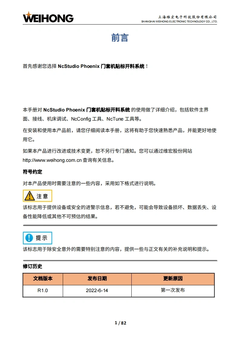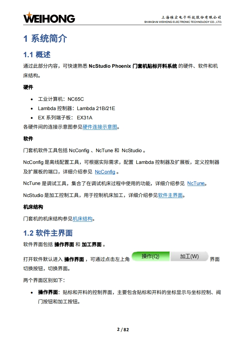 WEIHONG上海维宏电子科技股份有限公司SHANGHAI WEHONG ELECTRONIC TECHNOLOGY CO.,LTD.NcStudio Phoenix门套机贴标开料系统厂商手册版次:2022年06月14日第1版作者:产品应用测试部上海维宏电子科技股份有限公司版权所有目录1系统简介..21.1概述21.2软件主界面.21.2.1操作界面.1.2.2加工界面.91.3硬件连接示意图141.4机床结构.141.4.1开料机机床结构151.4.2贴标机机床结构162接线,172.1端口定义172.2信号类型202.2.1开关量输入信号202.2.2继电器输出信号212.2.3模拟量输出信号223系统调试.233.1概述233.2安装软件243.3修改端口极性253.4设置调试参数283.5确认轴方向29