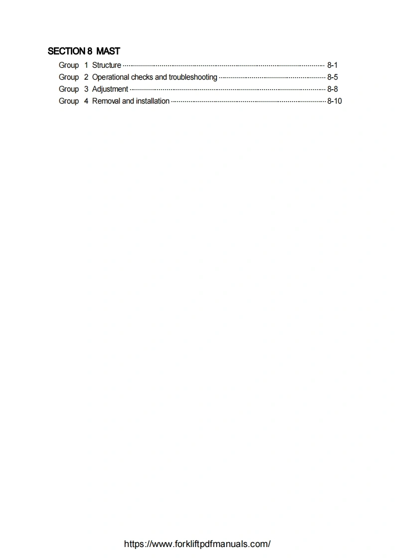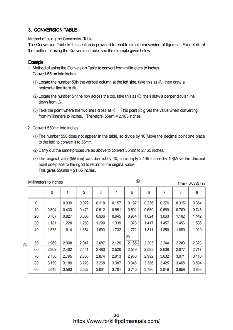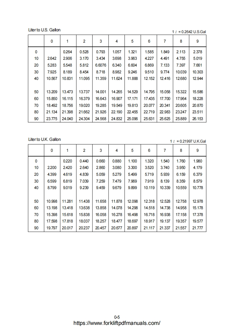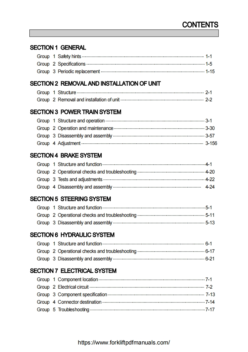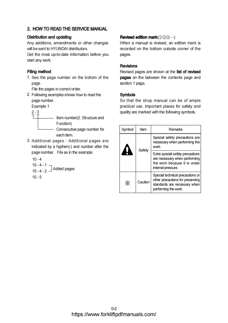 FOREWORD1.STRUCTUREThis service manual has been prepared as an aid to improve the quality of repairs by giving theserviceman an accurate understanding of the product and by showing him the correct way to performrepairs and make judgements.Make sure you understand the contents of this manual and use it tofull effect at every opportunity.This service manual mainly contains the necessary technical information for operations performed ina service workshop.For ease of understanding,the manual is divided into the following sections.SECTION 1 GENERALThis section gives the general information of the machine and explains the safety hints formaintenance.SECTION 2 REMOVAL INSTALLATION OF UNITThis section explains the procedures and techniques of removal and installation of each component.SECTION 3 POWER TRAIN SYSTEMThis section explains the structure of the transmission as well as control valve and drive axle.SECTION 4 BRAKE SYSTEMThis section explains the brake piping,each component and operation.SECTION 5 STEERING SYSTEMThis section explains the structure of the steering unit,priority valve,trail axle as well as steeringcircuit and operation.SECTION 6 HYDRAULIC SYSTEMThis section explains the structure of the gear pump,main control valve as well as work equipmentcircuit,each component and operation.SECTION 7 ELECTRICAL SYSTEMThis section explains the electrical circuit and each component.It serves not only to give an understanding electrical system,but also serves as reference material fortroubleshooting.SECTION 8 MASTThis section explains the structure of mast,carriage,backrest and forks.The specifications contained in this service manual are subject to change at any time and without anyadvance notice.Contact your HYUNDAI distributor for the latest information.0-1https://www.forkliftpdfmanuals.com/