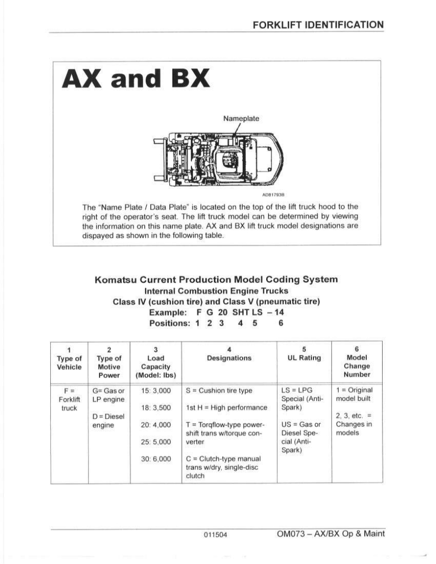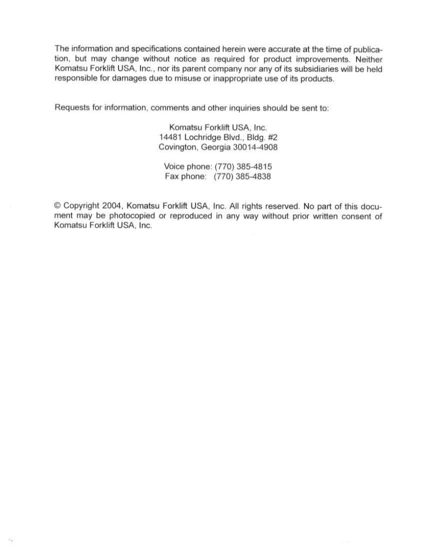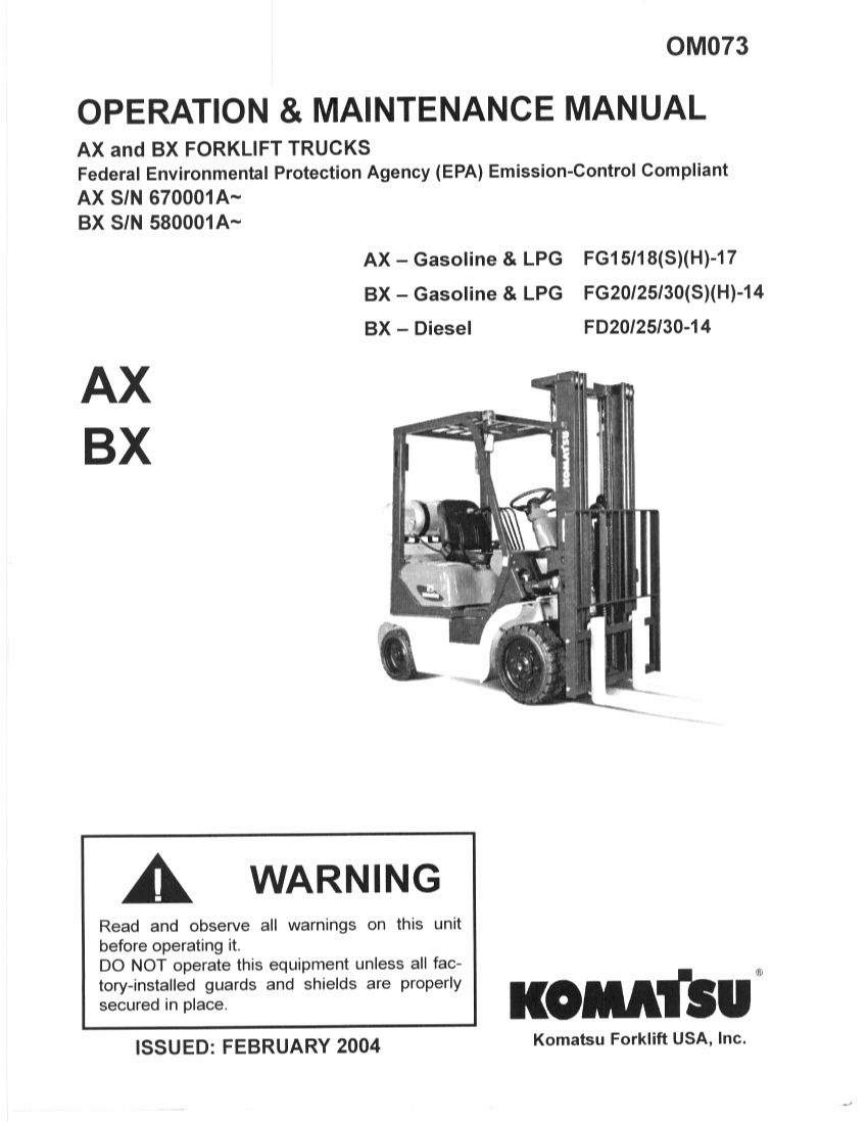 OM073OPERATION MAINTENANCE MANUALAX and BX FORKLIFT TRUCKSFederal Environmental Agency(EPA)Emission Control-CompliantAXS/N670001A~BXS/N580001A~AX-Gasoline LPG FG15/18(S)(H)-17BX-Gasoline LPGFG20125/30(S)(H)-14BX-DieselFD20/25/30-14AXBXPnsoaune (hont and wan)opWARNINGnRead and observe all warnings on this unitbefore operating it.DO NOT operate this equipment unless all fac-tory-installed guards and shields are properlysecured in place.KOMATSUISSUED:FEBRUARY 2004Komatsu Forklift USA,Inc.
