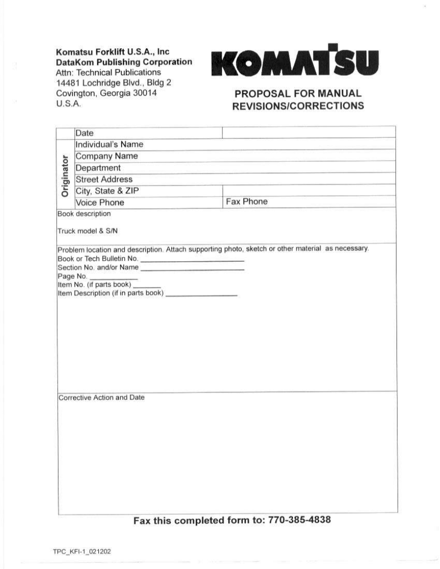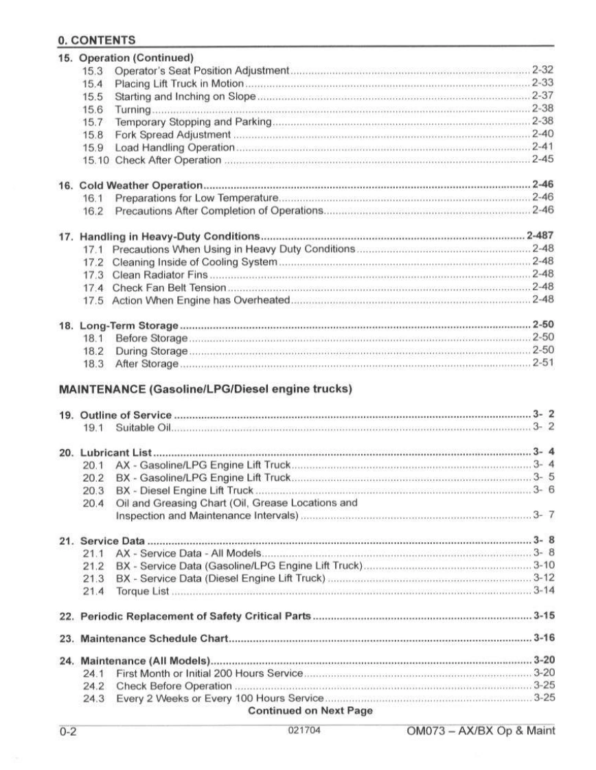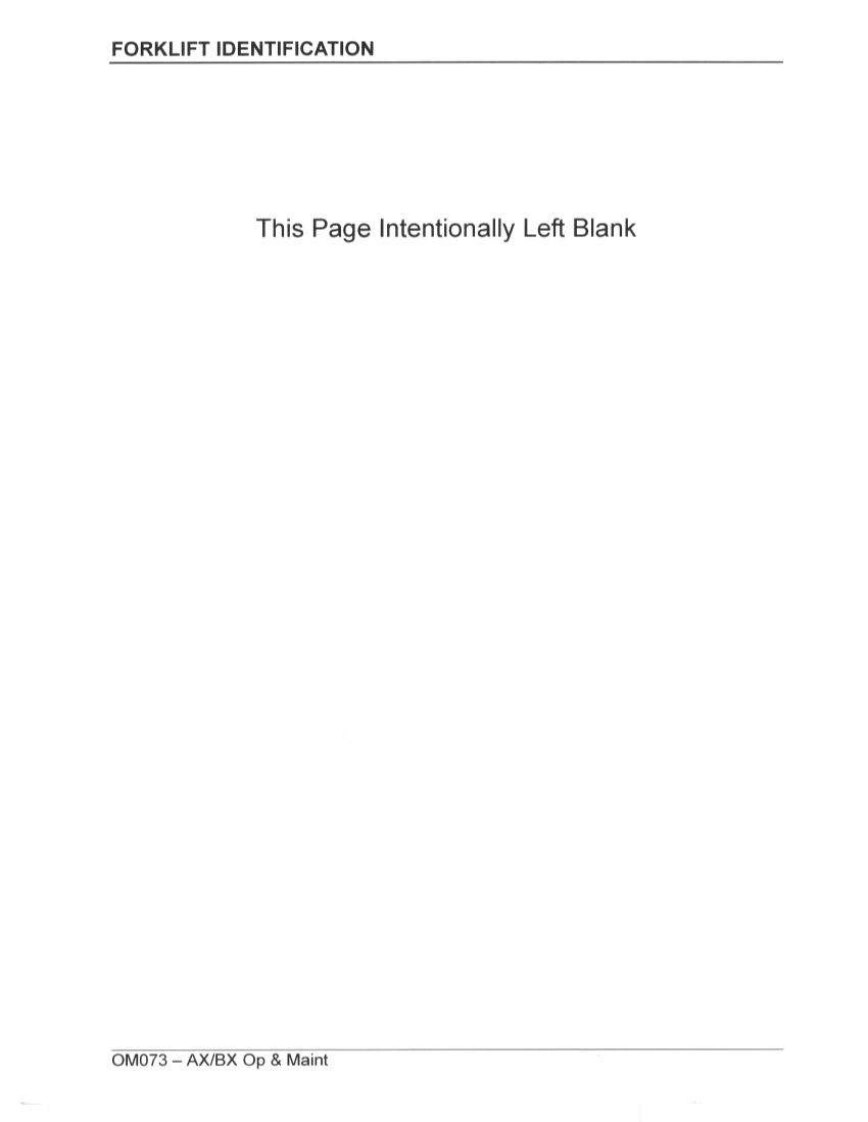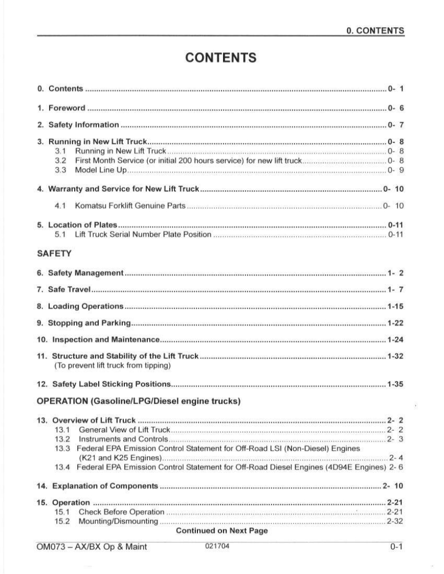 OM073OPERATION MAINTENANCE MANUALAX and BX FORKLIFT TRUCKSFederal Environmental Agency(EPA)Emission Control-CompliantAXS/N670001A~BXS/N580001A~AX-Gasoline LPG FG15/18(S)(H)-17BX-Gasoline LPGFG20125/30(S)(H)-14BX-DieselFD20/25/30-14AXBXPnsoaune (hont and wan)opWARNINGnRead and observe all warnings on this unitbefore operating it.DO NOT operate this equipment unless all fac-tory-installed guards and shields are properlysecured in place.KOMATSUISSUED:FEBRUARY 2004Komatsu Forklift USA,Inc.