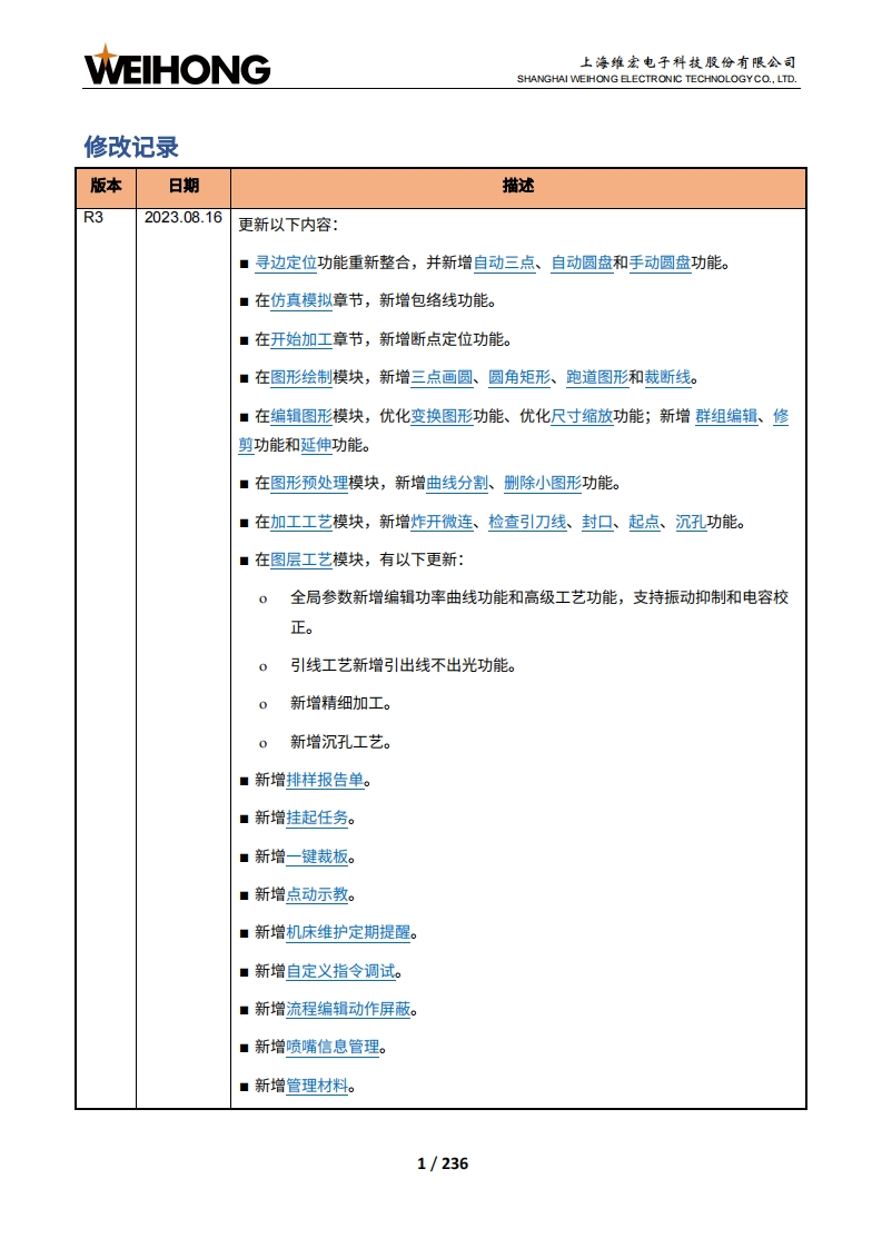 WEIHONG上海维宏电子科技股份有限公司SHANGHAI WEIHONG ELECTRONIC TECHNOLOGYCO.,LTD.NcStudio V15激光平面切割中高功率控制系统用户手册(LS3000)版次:2023年08月16日第3版作者:激光加工产品部上海维宏电子科技股份有限公司版权所有目录修改记录1产品简介.32软件主界面42.1常用工具栏2.2控制栏显示按钮.72.3机床控制栏72.3.1坐标显示区2.3.2手动轴控制区82.3.3机床控制按钮122.4图层工具栏152.5加工信息统计栏.152.6报警/系统信息栏..152.7绘图信息栏.162.8绘图区162.9绘图工具栏163坐标系.…173.1机械原点173.1.1定义173.1.2基准设定...18