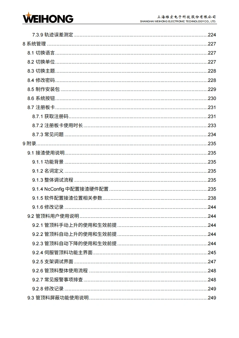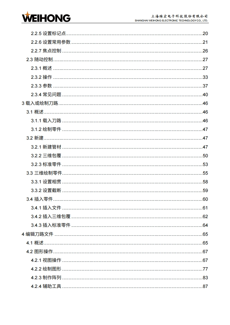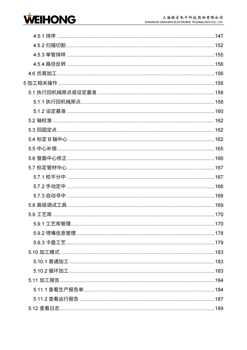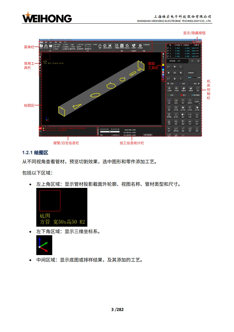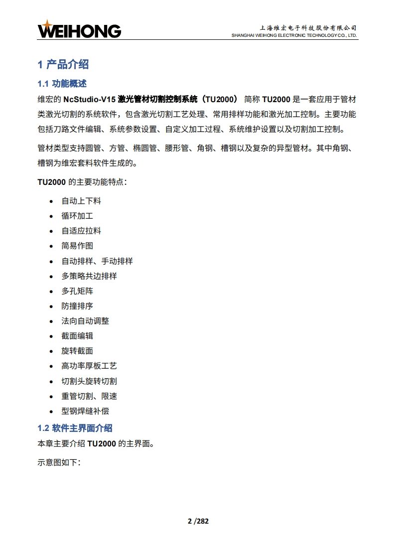 WEIHONG上海维宏电子科技股份有限公司SHANGHAI WEIHONG ELECTRONIC TECHNOLOGYCO.,LTD.NcStudio-V15激光管材切割控制系统用户手册(TU2000)版次:2023年05月18日第1版▣作者:激光加工产品部上海维宏电子科技股份有限公司版权所有目录修改记录1产品介绍.21.1功能概述.21.2软件主界面介绍.21.2.1绘图区1.2.2常用工具栏.41.2.3菜单栏1.2.4显示/隐藏按钮.51.2.5机床控制栏.51.2.6图层工具栏121.2.7加工信息统计栏121.2.8报警/日志信息栏.122快速开始.…..142.1管材加工流程.142.2常用操作..162.2.1设置工件原点.162.2.2标定切割头162.2.3管材寻边172.2.4设置管材尺寸18
