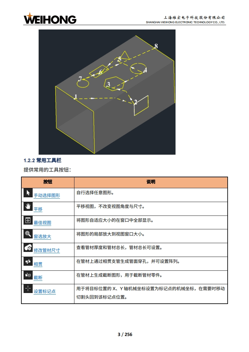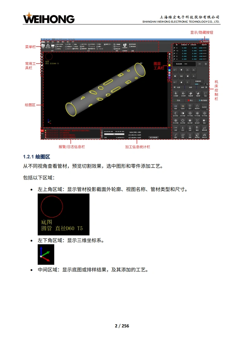 WEIHONG上海维宏电子科技股份有限公司SHANGHAI WEIHONG ELECTRONIC TECHNOLOGYCO.,LTD.NcStudio V15激光管材切割控制系统用户手册(TU7500)版次:2023年11月03日第1版作者:激光加工产品部上海维宏电子科技股份有限公司版权所有目录1产品介绍..11.1功能概述11.2软件主界面.11.2.1绘图区.21.2.2常用工具栏1.2.3菜单栏.41.2.4显示/隐藏按钮1.2.5机床控制栏.41.2.6图层工具栏111.2.7加工信息统计栏111.2.8报警/日志信息栏....122快速开始…132.1管材加工流程132.2常用操作.142.2.1设置工件原点.142.2.2标定切割头..152.2.3管材寻边…162.2.4设置管材尺寸172.2.5设置标记点..19