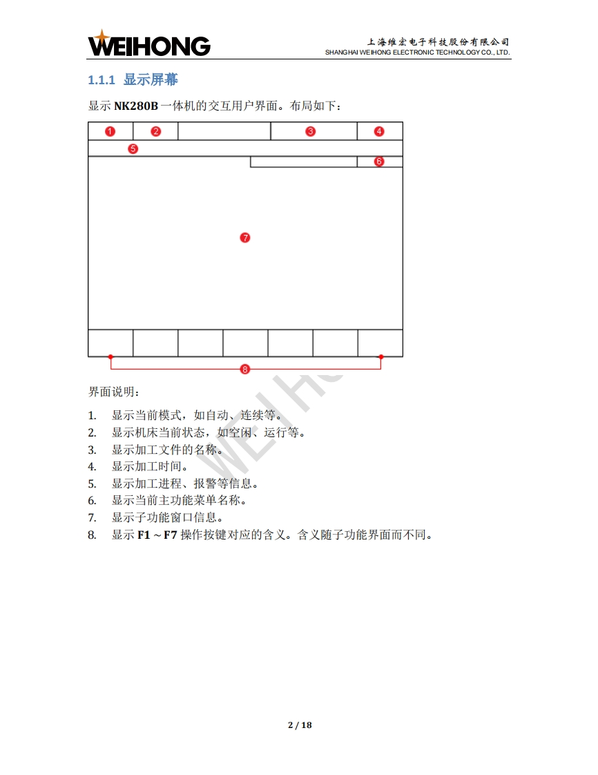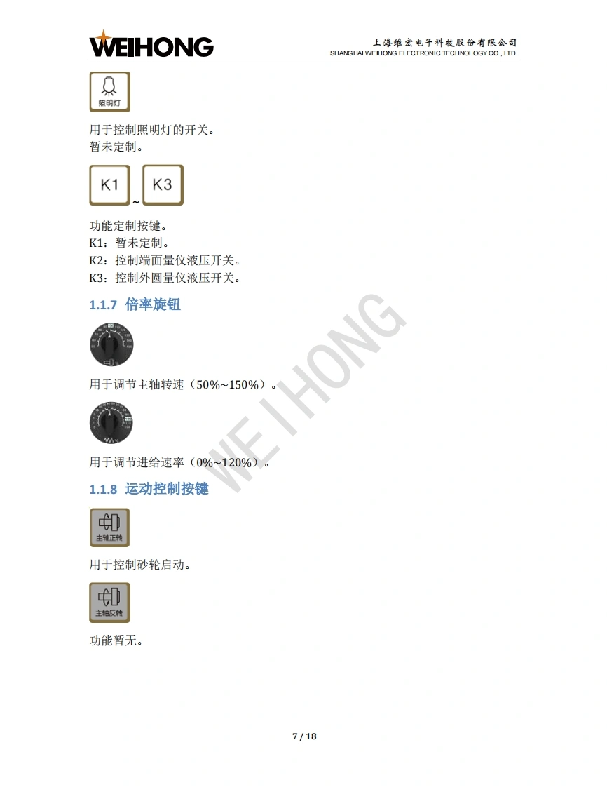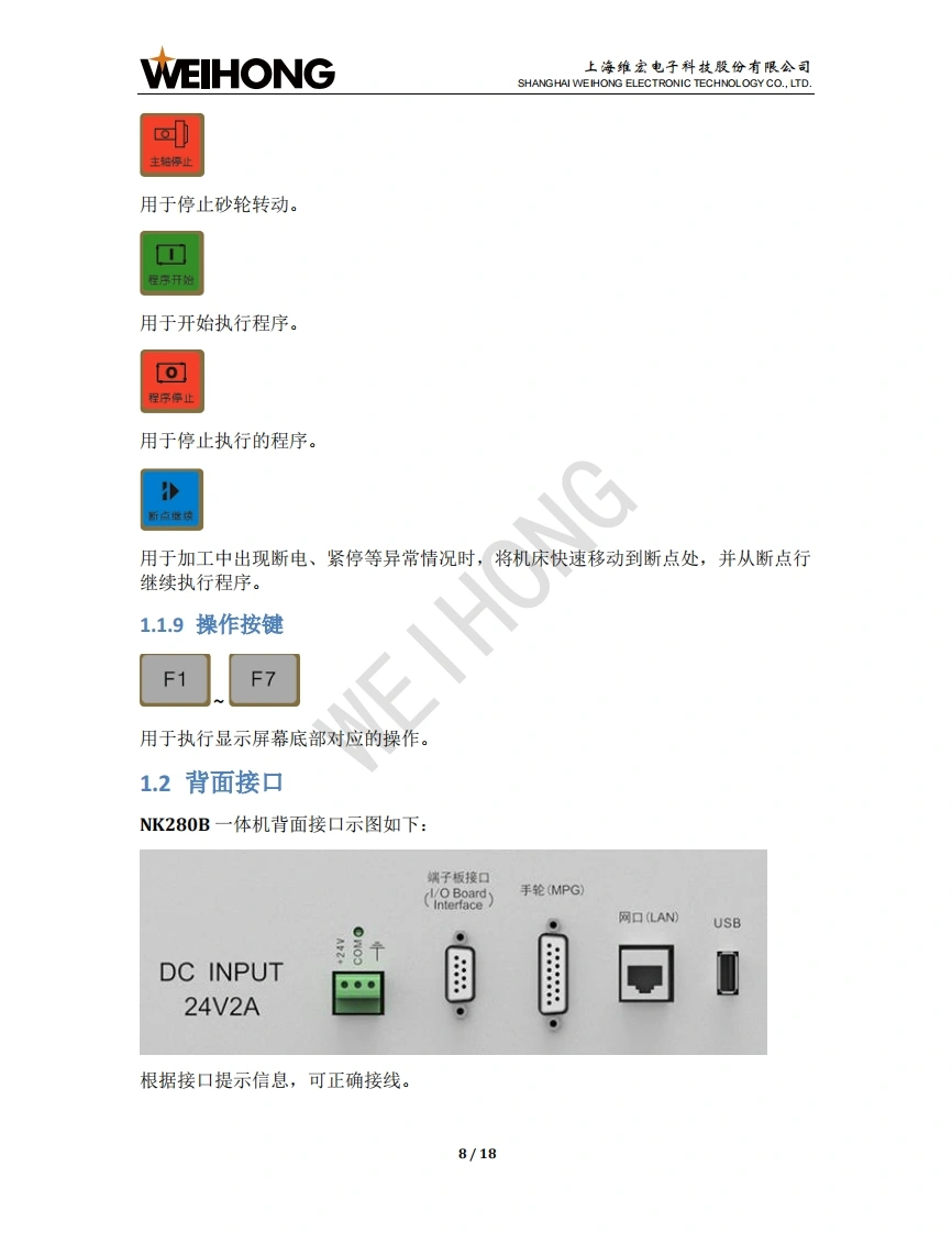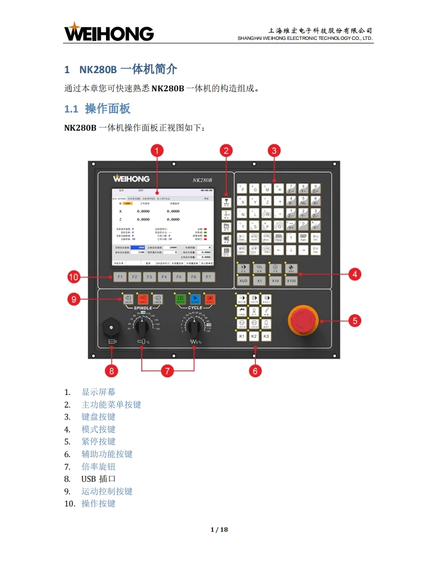 WEIHONG上海维宏电子科技股份有限公司SHANGHAI WEIHONG ELECTRONIC TECHNOLOGY CO.,LTD.NK280B外圆磨床控制系统用户手册版次:2018年11月19日第1版作者:文档部上海维宏电子科技股份有限公司版权所有1NK280B一体机简介1.1操作面板1.1.1显示屏幕.21.1.2主功能菜单按键.31.1.3键盘按键.41.1.4模式按键.51.1.5紧停按键1.1.6辅助功能按键.61.1.7倍率旋钮..71.1.8运动控制按键.71.1.9操作按键81.2背面接口..82快速上手92.1回机械原点.102.2导入系统参数.102.3拷贝加工文件….112.4设置砂轮原点….112.5载入修砂轮程序文件.122.6执行砂轮成型修.12