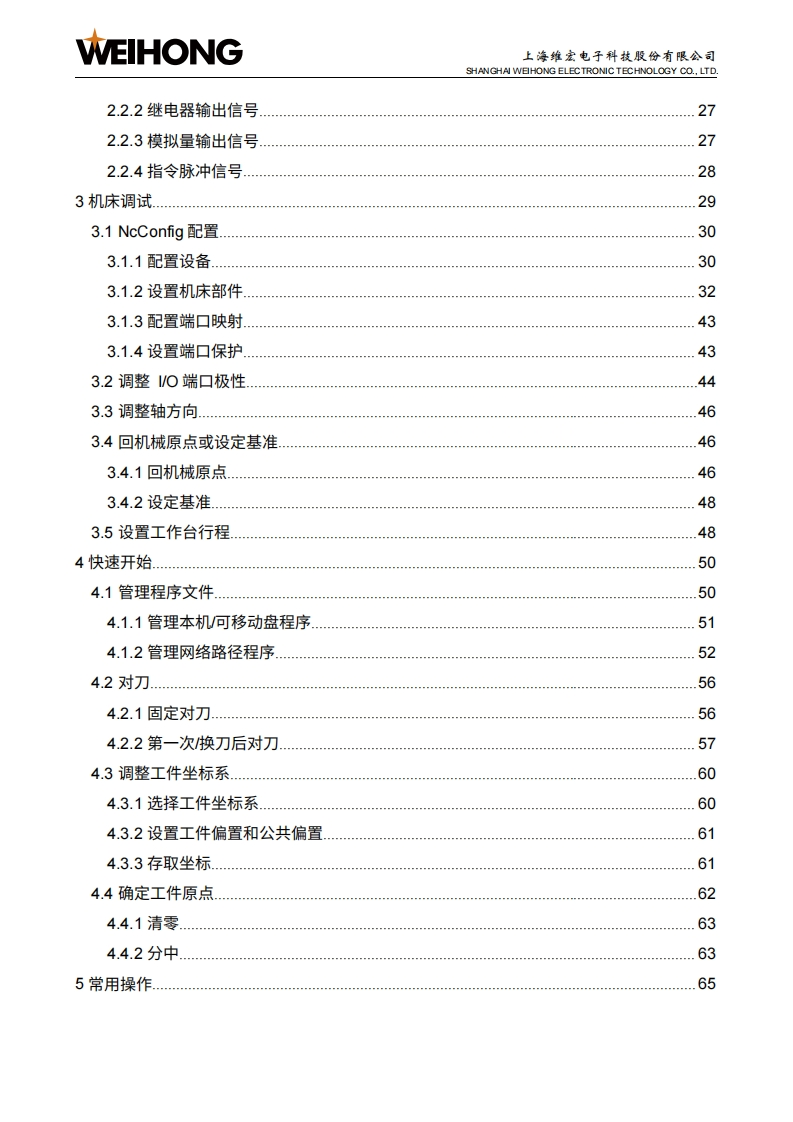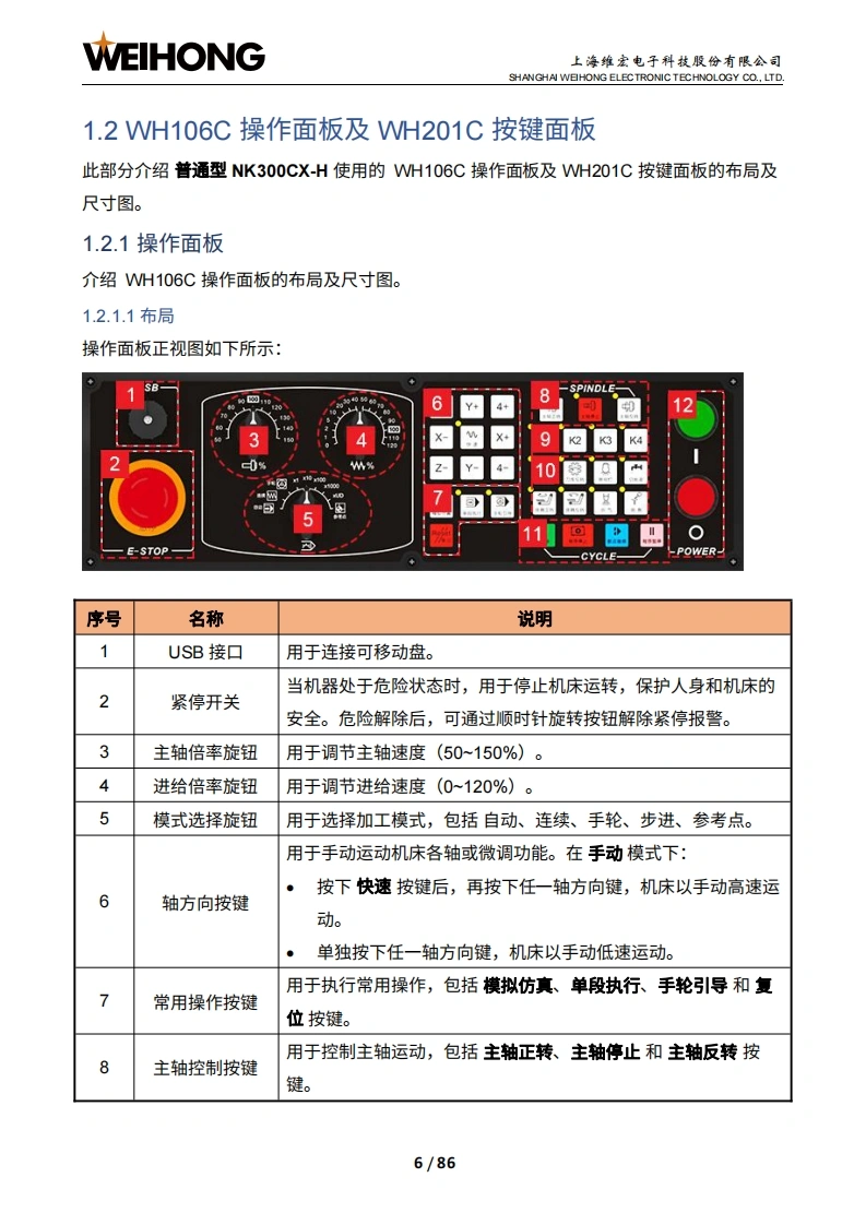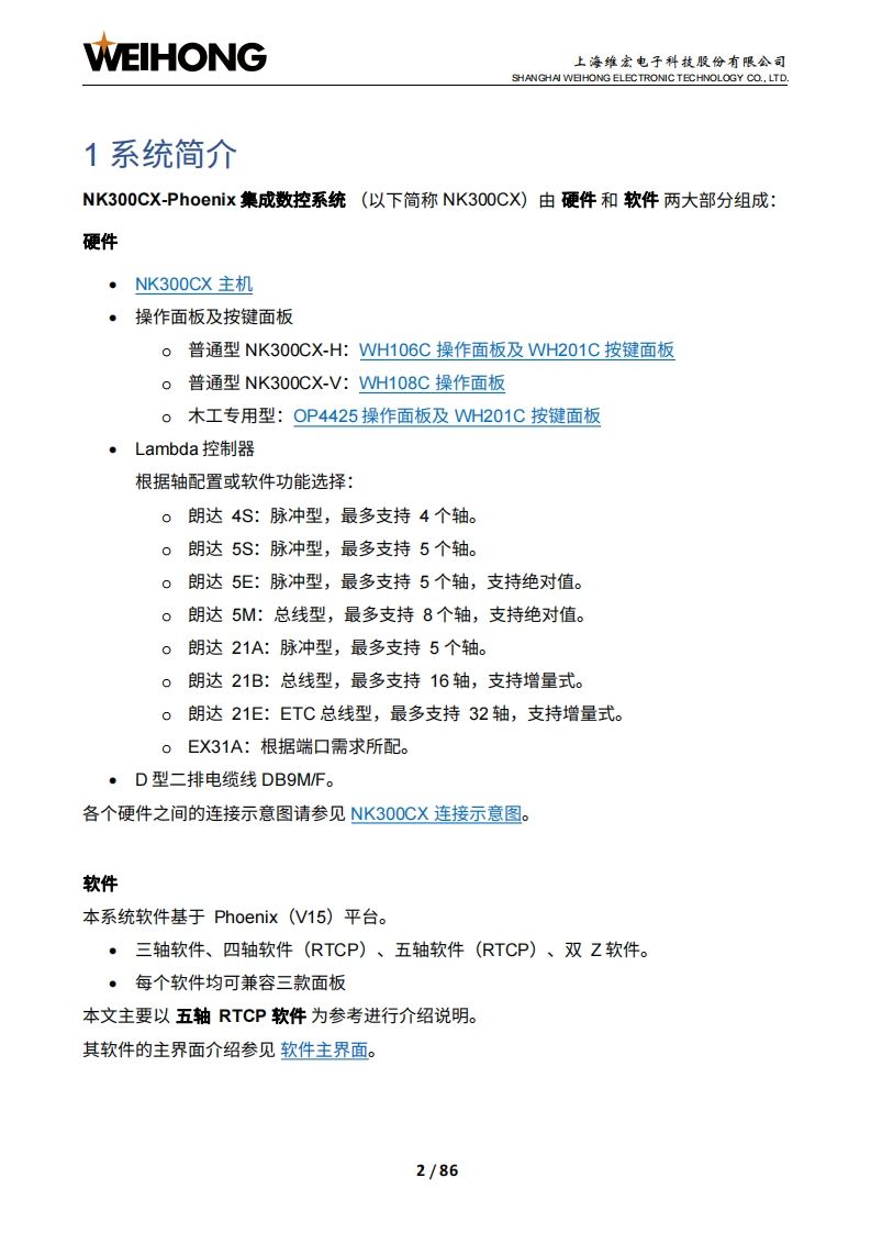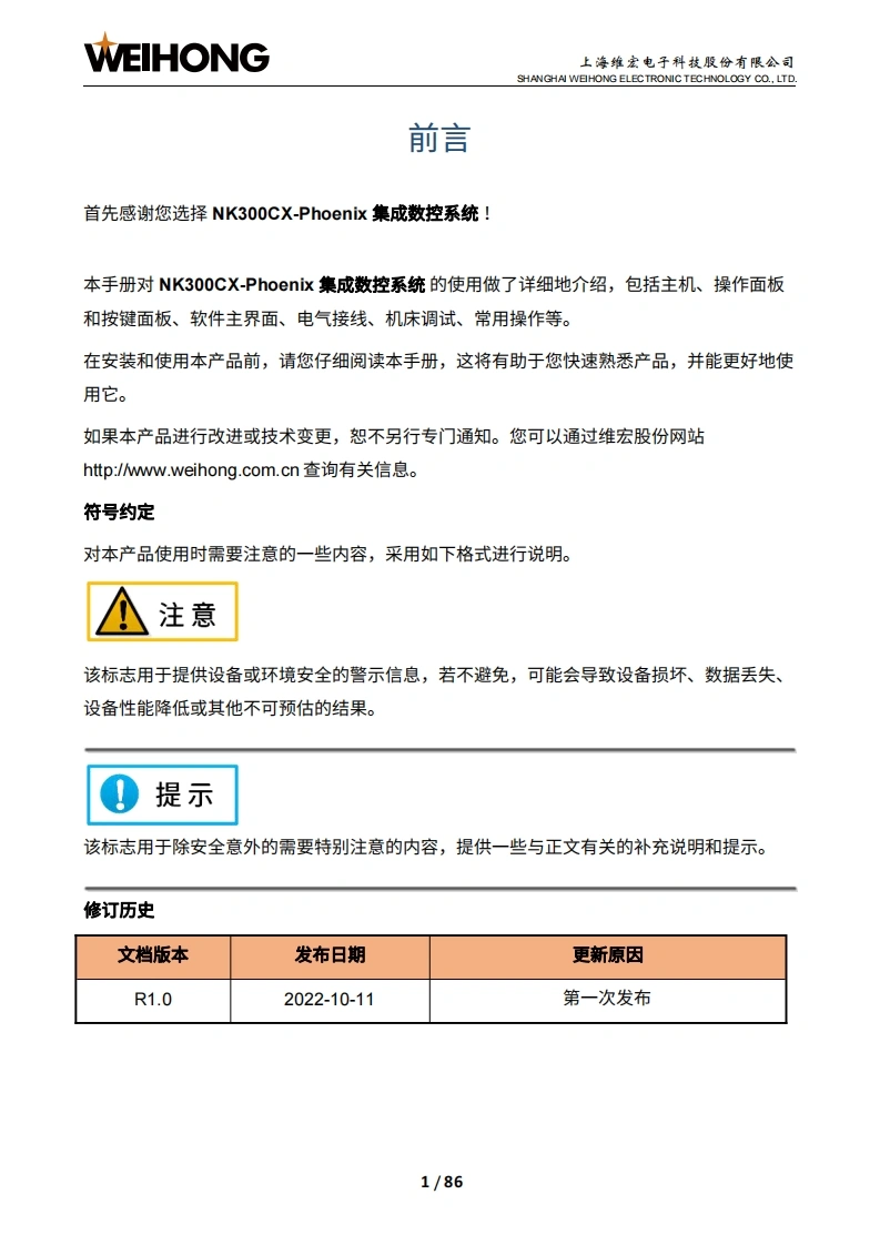 WEIHONG上海维宏电子科技股份有限公司SHANGHAI WEIHONG ELECTRONIC TECHNOLOGY CO.,LTD.NK300CX-Phoenix集成数控系统厂商手册版次:2022年10月11日第1版作者:产品应用测试部上海维宏电子科技股份有限公司版权所有▣目录1系统简介21.1NK300CX主机31.1.1布局31.1.2尺寸图(单位:mm)1.2H106C操作面板及WH201C按键面板61.2.1操作面板.1.2.2按键面板,>1.3WH108C操作面板101.3.1布局101.3.2尺寸图(单位:mm)121.4OP4425操作面板及WH201C按键面板131.4.1操作面板131.4.2按键面板,151.5NK300CX连接示意图151.5.1NK300CX-H连接示意图161.5.2NK300CX-V连接示意图」171.6软件主界面181.6.1 NcConfig软件界面181.6.2 NcSudio软件界面192接线252.1端口定义252.2信号类型262.2.1开关量输入信号26