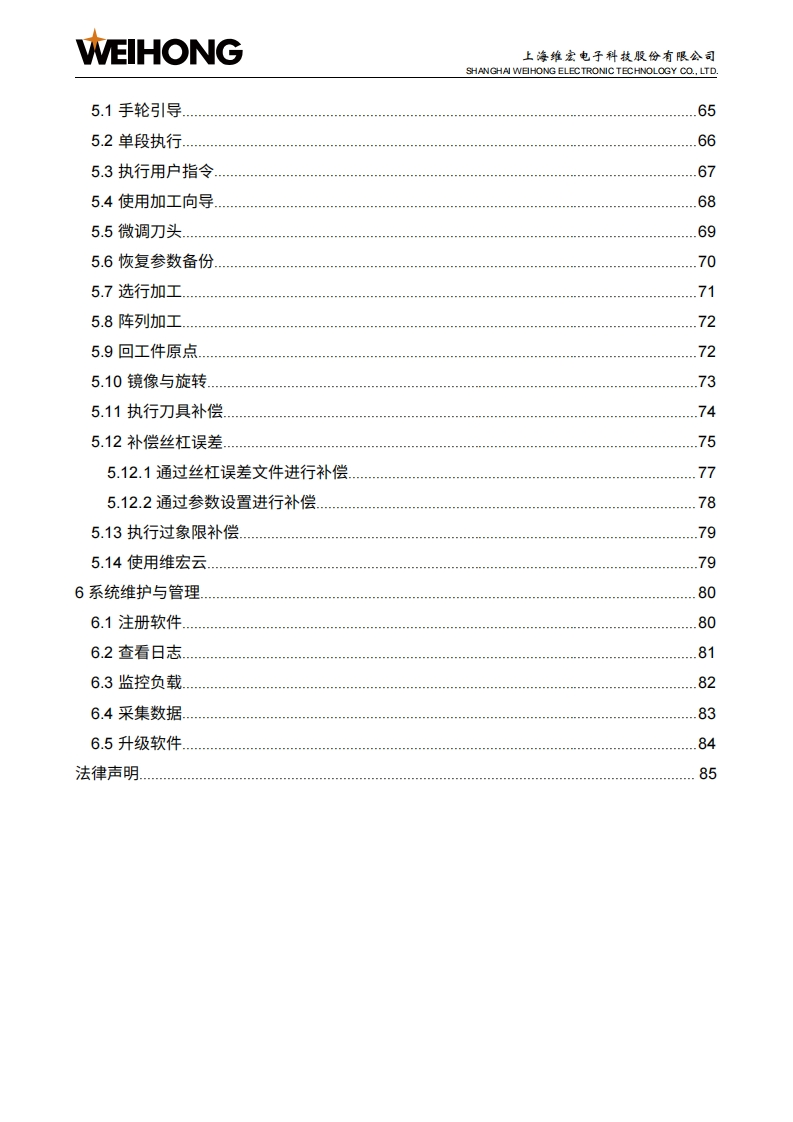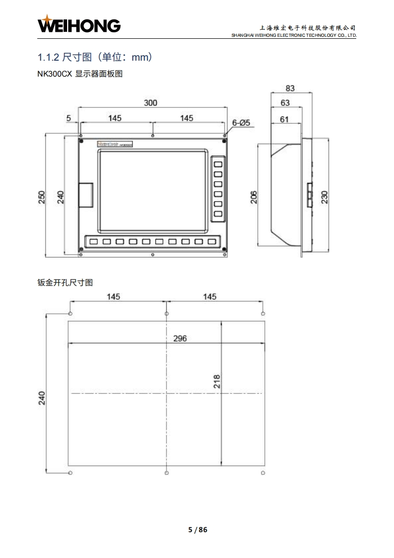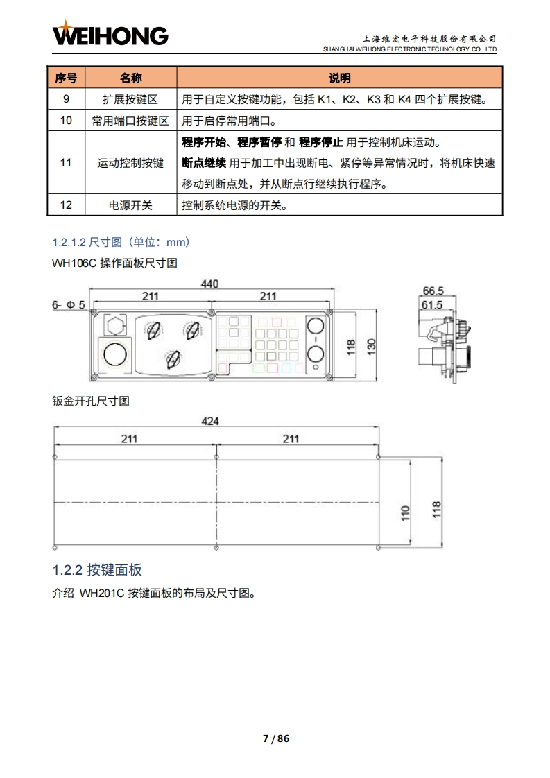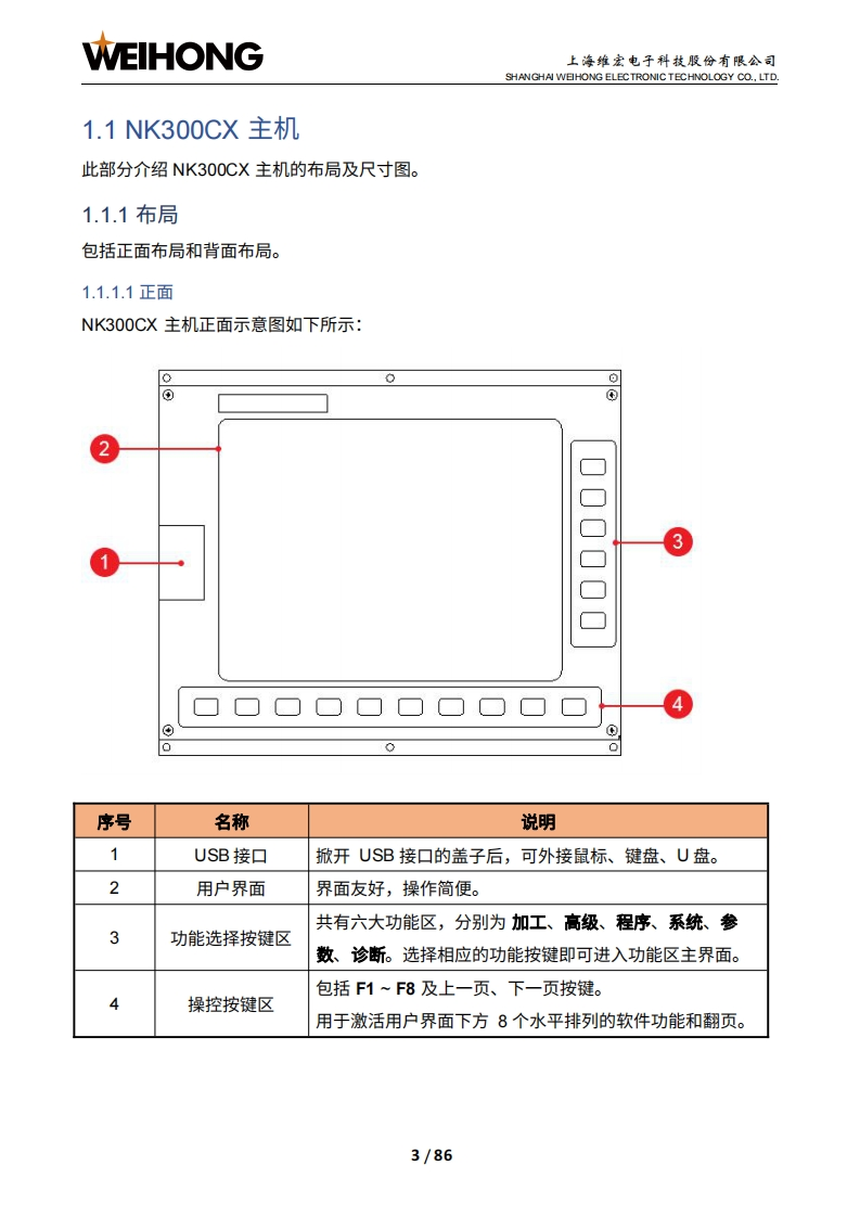 WEIHONG上海维宏电子科技股份有限公司SHANGHAI WEIHONG ELECTRONIC TECHNOLOGY CO.,LTD.NK300CX-Phoenix集成数控系统厂商手册版次:2022年10月11日第1版作者:产品应用测试部上海维宏电子科技股份有限公司版权所有▣目录1系统简介21.1NK300CX主机31.1.1布局31.1.2尺寸图(单位:mm)1.2H106C操作面板及WH201C按键面板61.2.1操作面板.1.2.2按键面板,>1.3WH108C操作面板101.3.1布局101.3.2尺寸图(单位:mm)121.4OP4425操作面板及WH201C按键面板131.4.1操作面板131.4.2按键面板,151.5NK300CX连接示意图151.5.1NK300CX-H连接示意图161.5.2NK300CX-V连接示意图」171.6软件主界面181.6.1 NcConfig软件界面181.6.2 NcSudio软件界面192接线252.1端口定义252.2信号类型262.2.1开关量输入信号26
