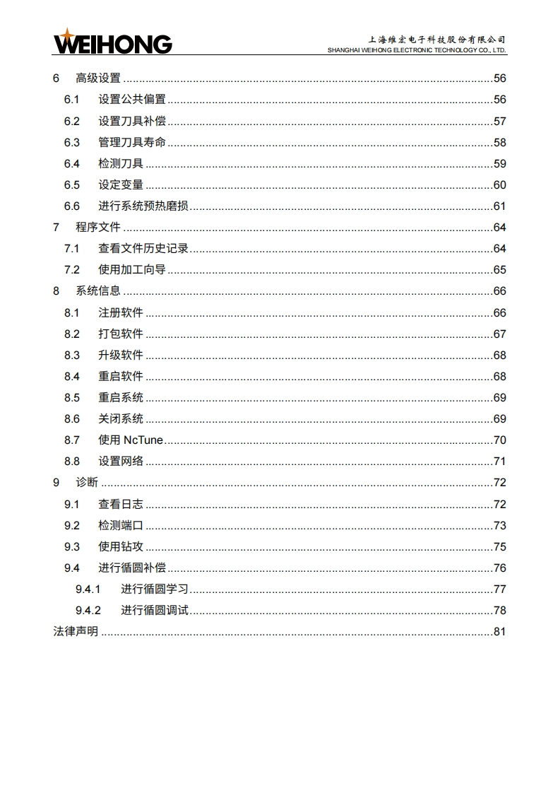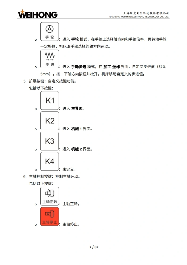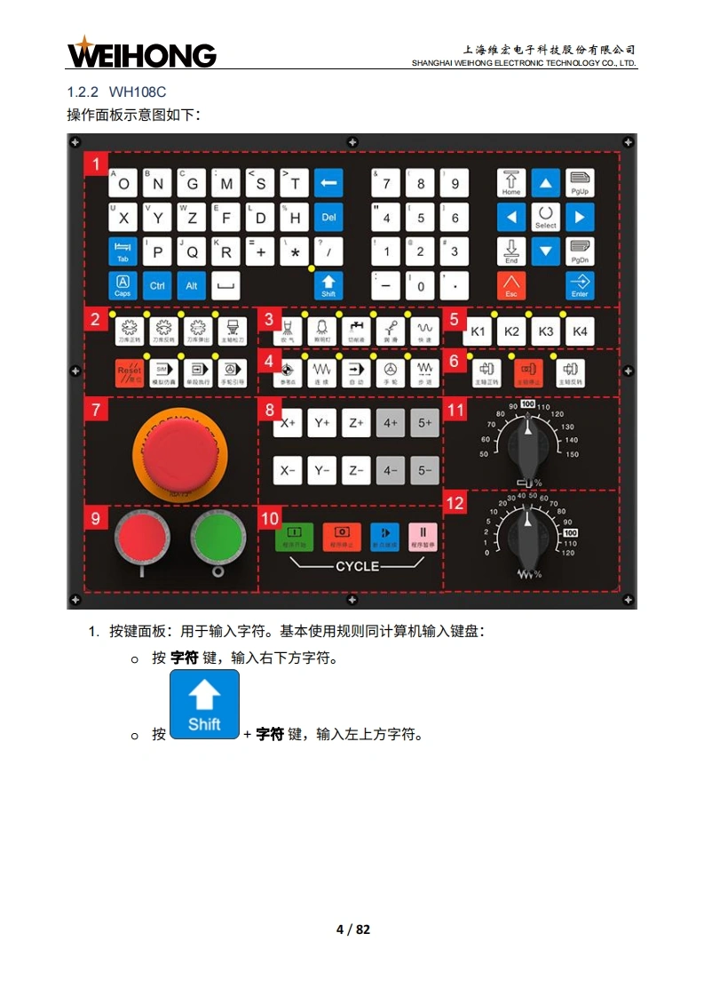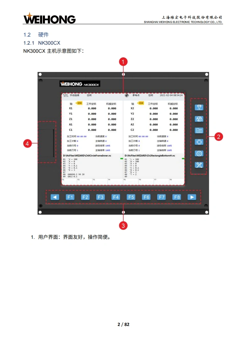 WEIHONG上海维宏电子科技股份有限公司SHANGHAI WEIHONG ELECTRONIC TECHNOLOGY CO.,LTD.NK300CX多通道集成数控系统厂商手册版次:2020年02月05日第1版作者:产品应用测试部上海维宏电子科技股份有限公司版权所有目录1系统简介.71.1概述.11.2硬件.21.2.1NK300CX.21.2.2WH108C.........41.2.3硬件连接示意图101.3软件界面....111.3.1主界面..121.3.2分界面.132接线.142.1端口定义.142.1.1Lambda21E....….152.1.2EX30A162.2信号类型....162.2.1开关量输入信号172.2.2继电器输出信号172.2.3模拟量输出信号182.2.4指令脉冲信号183机床调试193.1概述.193.2安装软件203.3设置/O端口.21